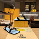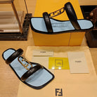 FENDI O'LOCK SLIDES BLACK AND LIGHT BLUE CALFSKIN WITH GOLD HARDWARE