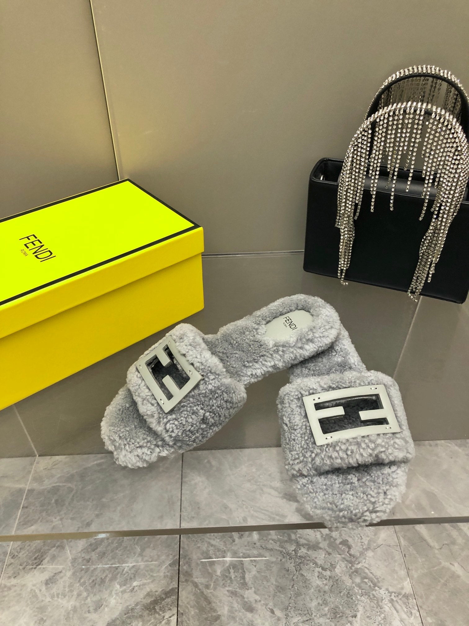 FENDI BAGUETTE SLIDE SLIPPERS IN GREY WOOL