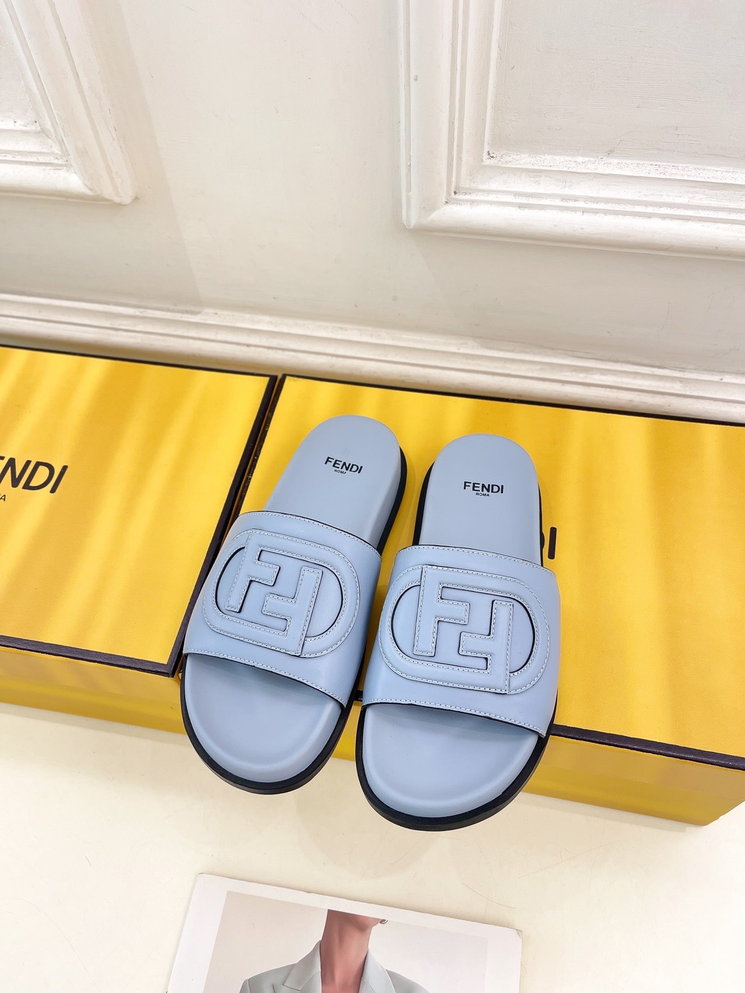 FENDI LOGO SLIDES IN BLUE POWDER CALFSKIN