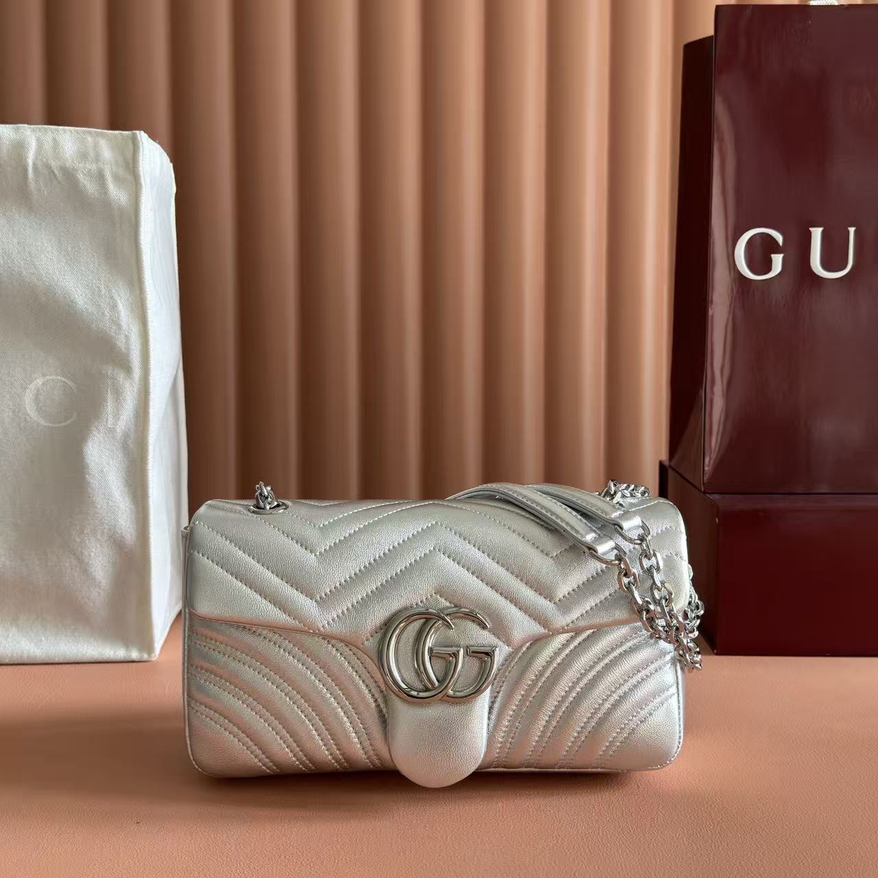 GG Marmont Small Shoulder Bag Metallic Silver Leather