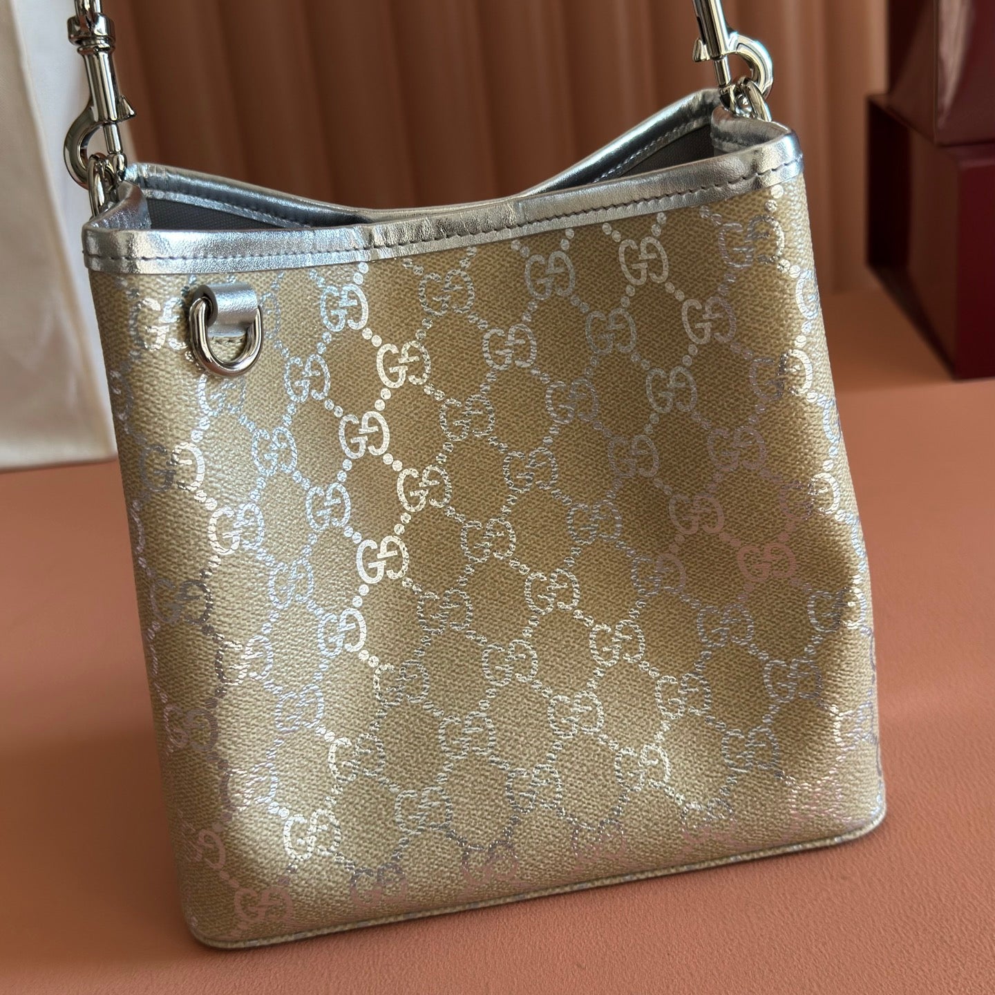 GG Emblem Small Bucket Bag Beige Sliver GG Fabric