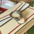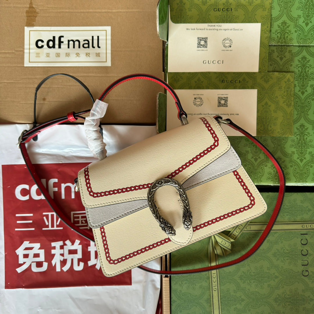 DYONYSUS SMALL TOP HANDLE BAG 24 IN BEIGE MIX RED CALFSKIN DRAGON PRINT