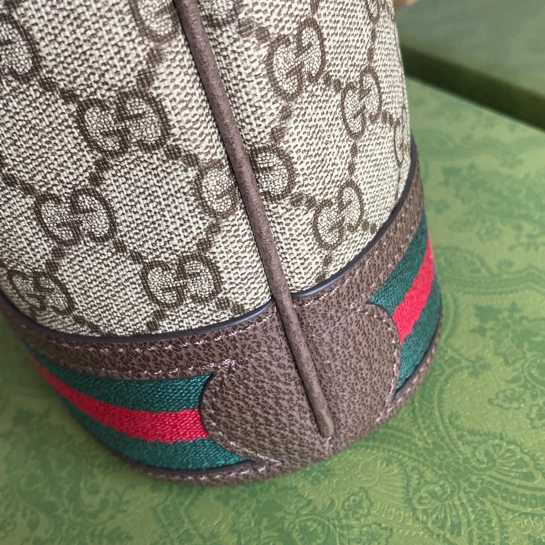 OPHIDIA MEDIUM BUCKET BAG 26 WITH WEB IN BEIGE EBONY CANVAS MIX BROWN CALFSKIN