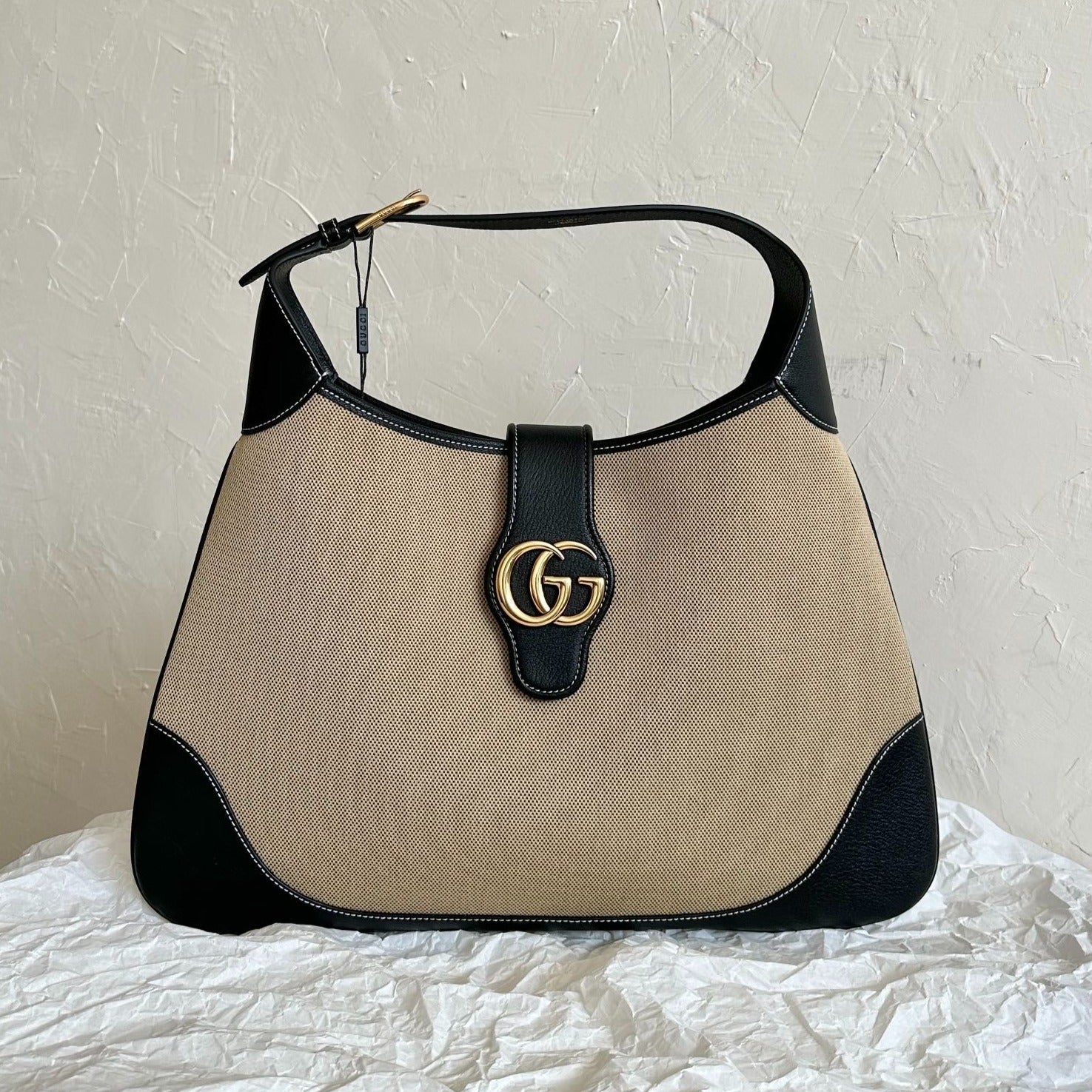 GG SMALL 21 CROSSBODY BAG WITH TAG IN BEIGE CANVAS AND BLACK CALFSKIN