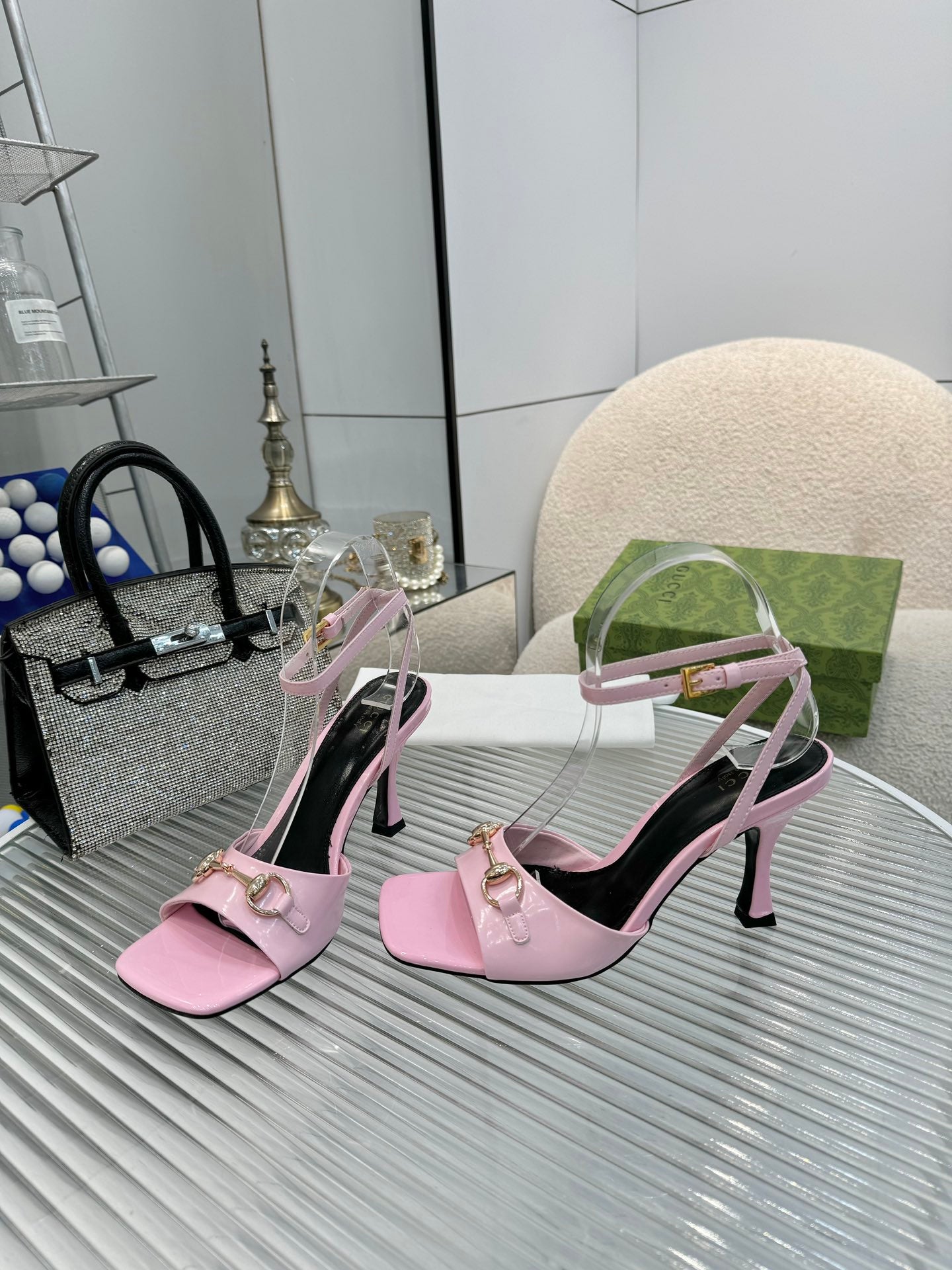 GG Gold Buckle Sandal 80mm Light Pink Patent Leather 457556