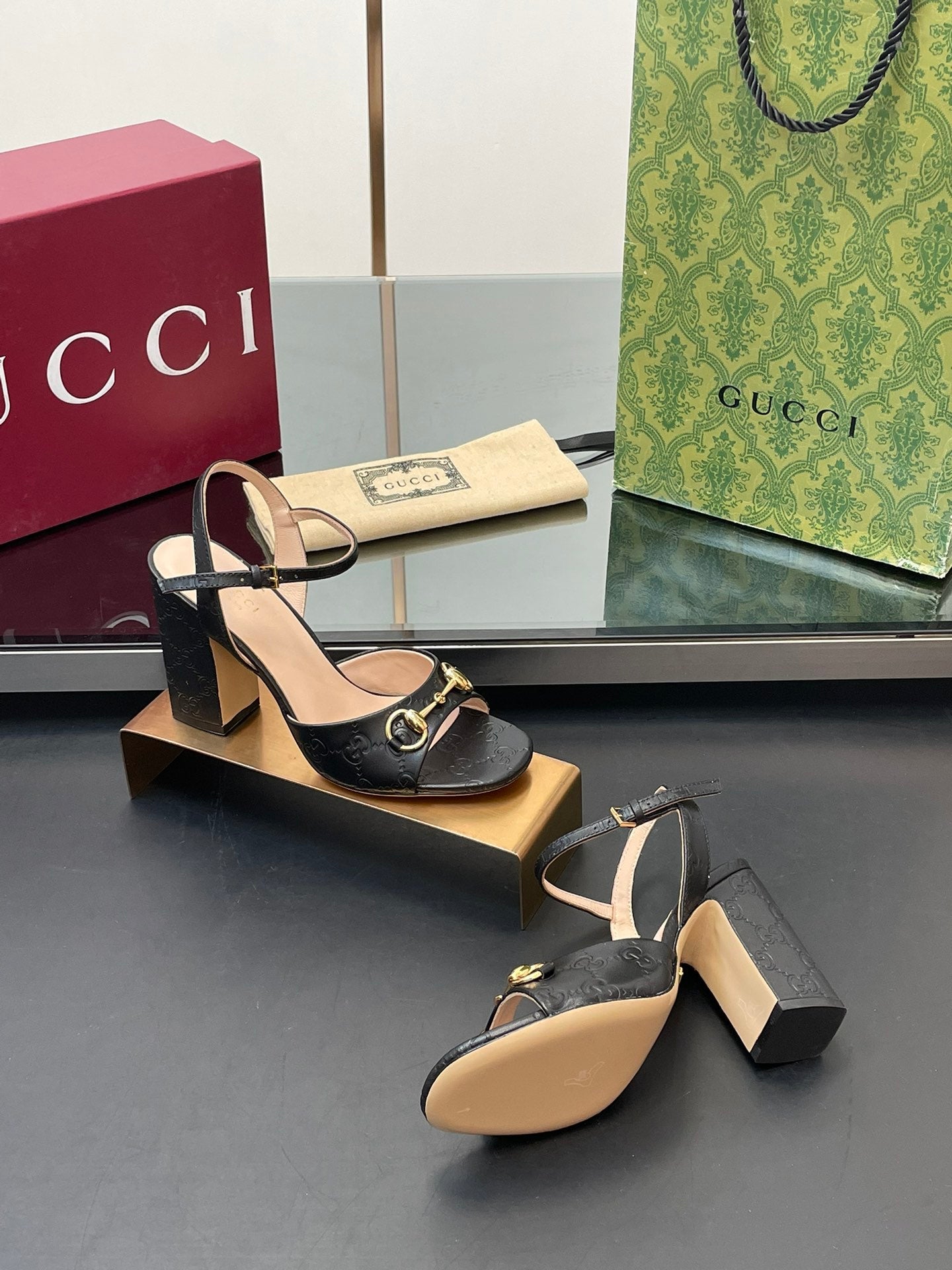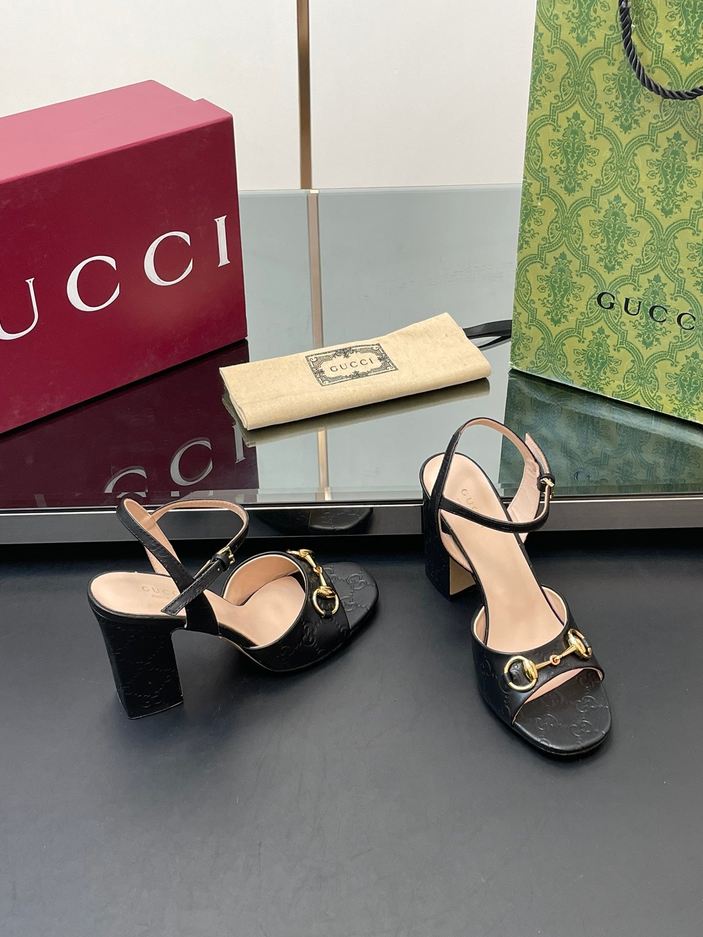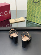 GG Women Horsebit Embossed High Heel Sandal Open Toe Black Sheepskin 149221