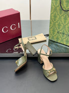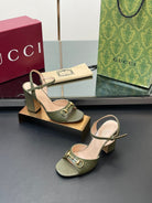 GG Women Horsebit Embossed High Heel Sandal Open Toe Olive Sheepskin 149219