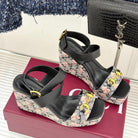GC Floral Platform Wedge Sandal Black Mix Flower lambskin