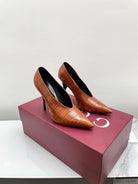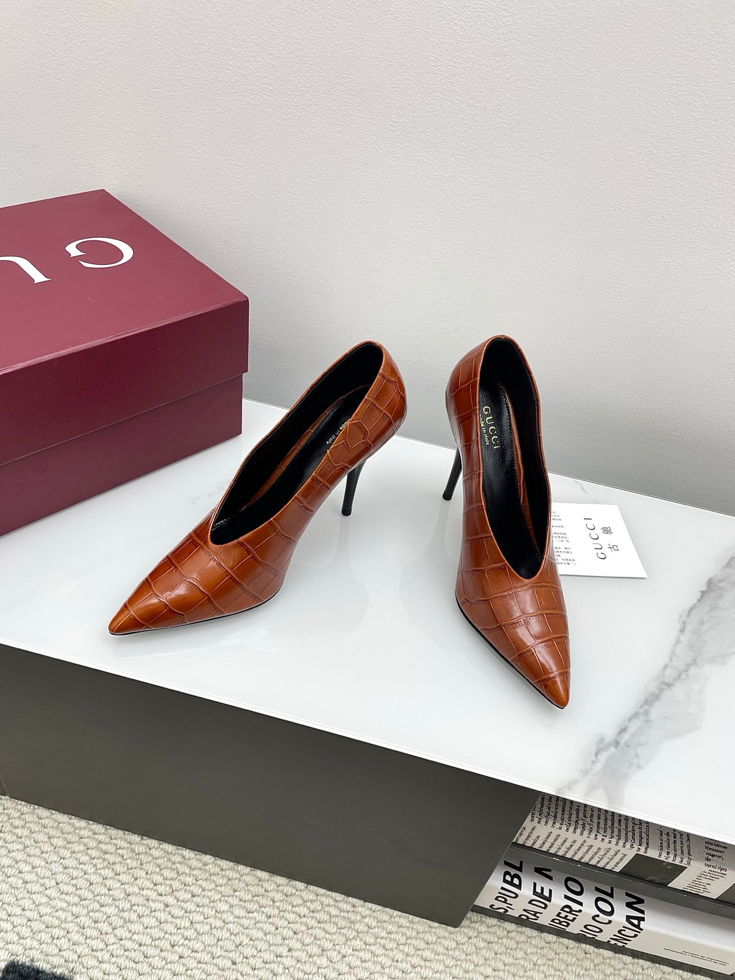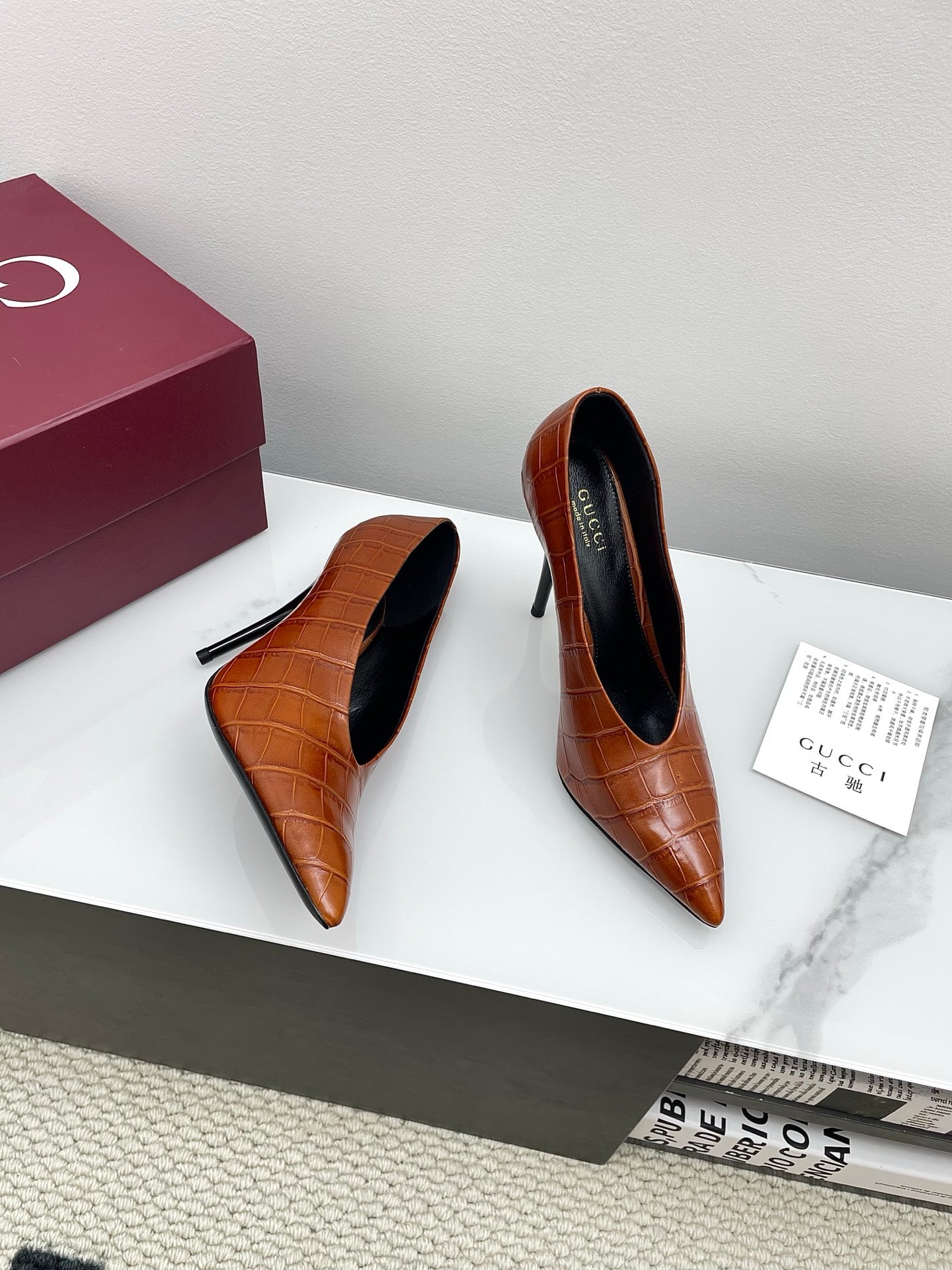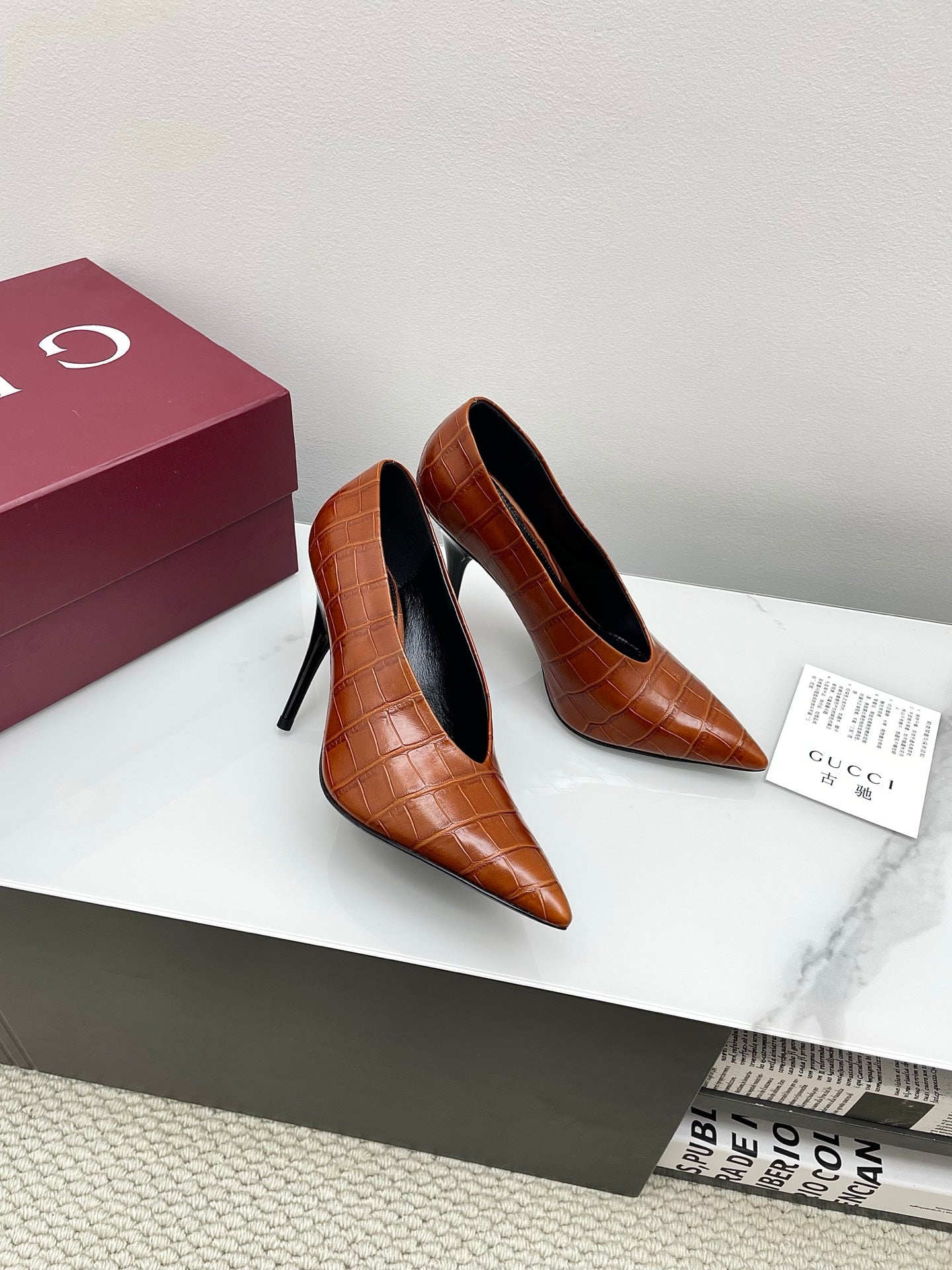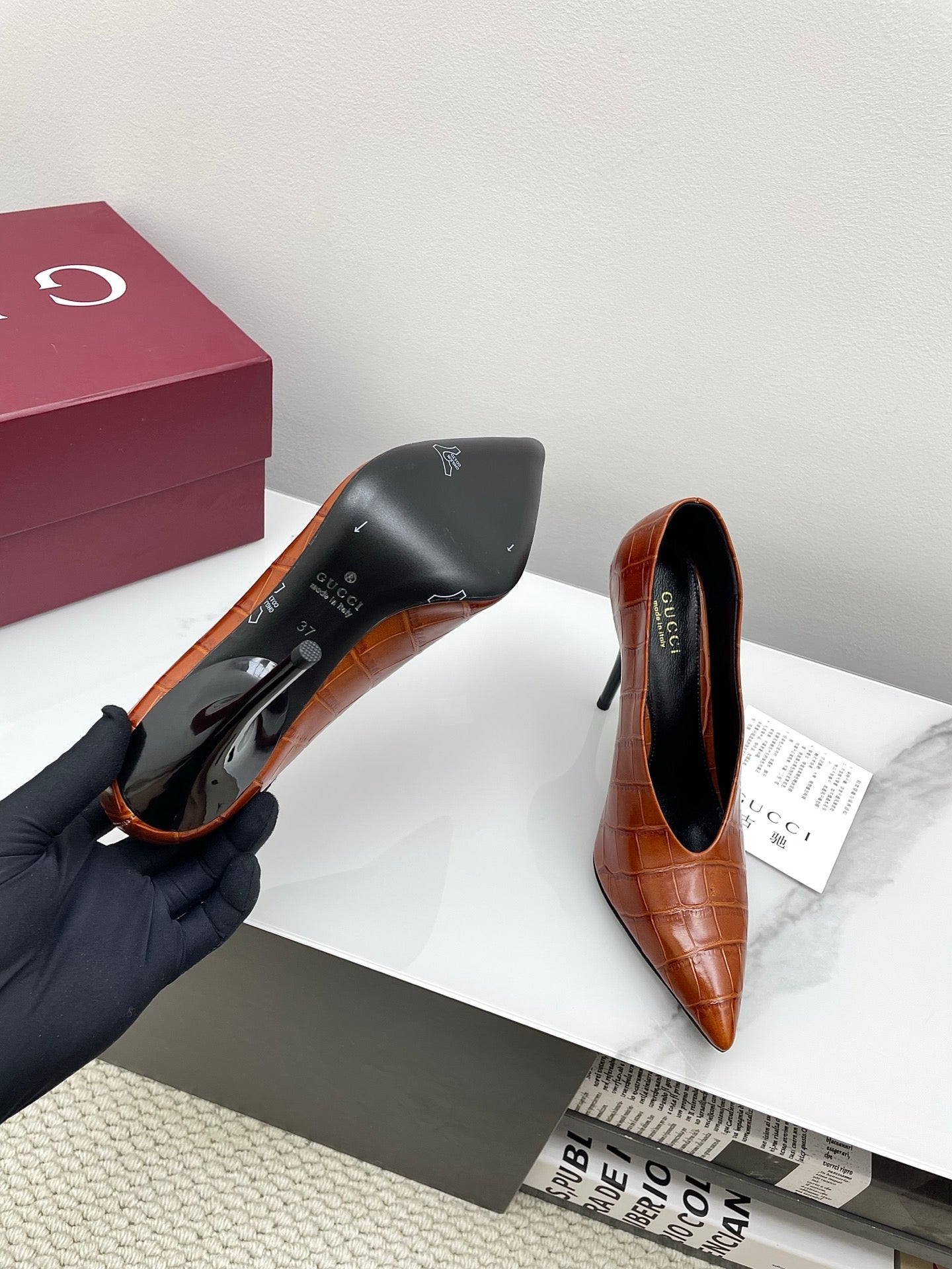GG 25Ss Crocodile Pattern Pointed Toe High Heels Caramel Leather 511497