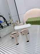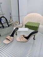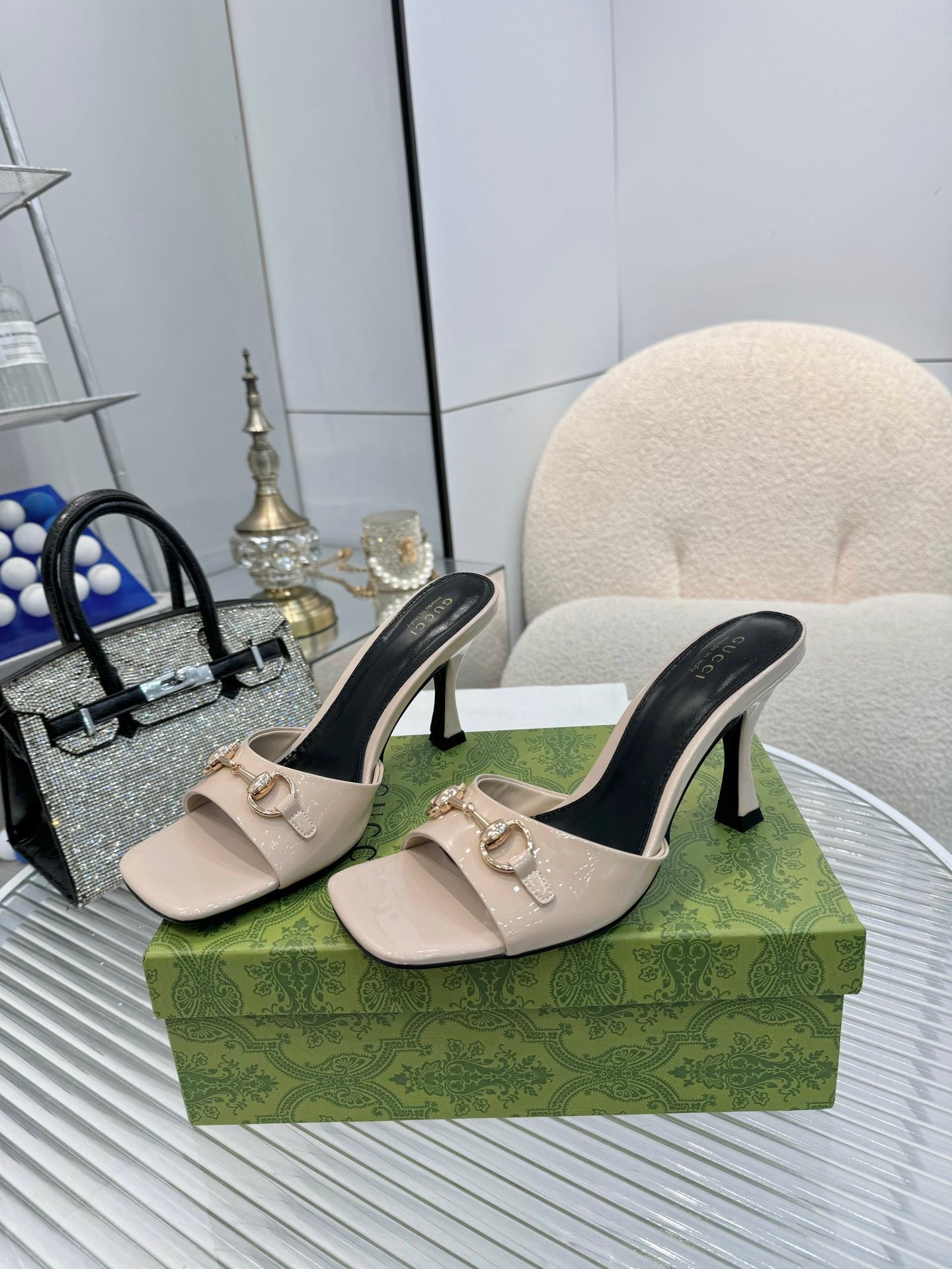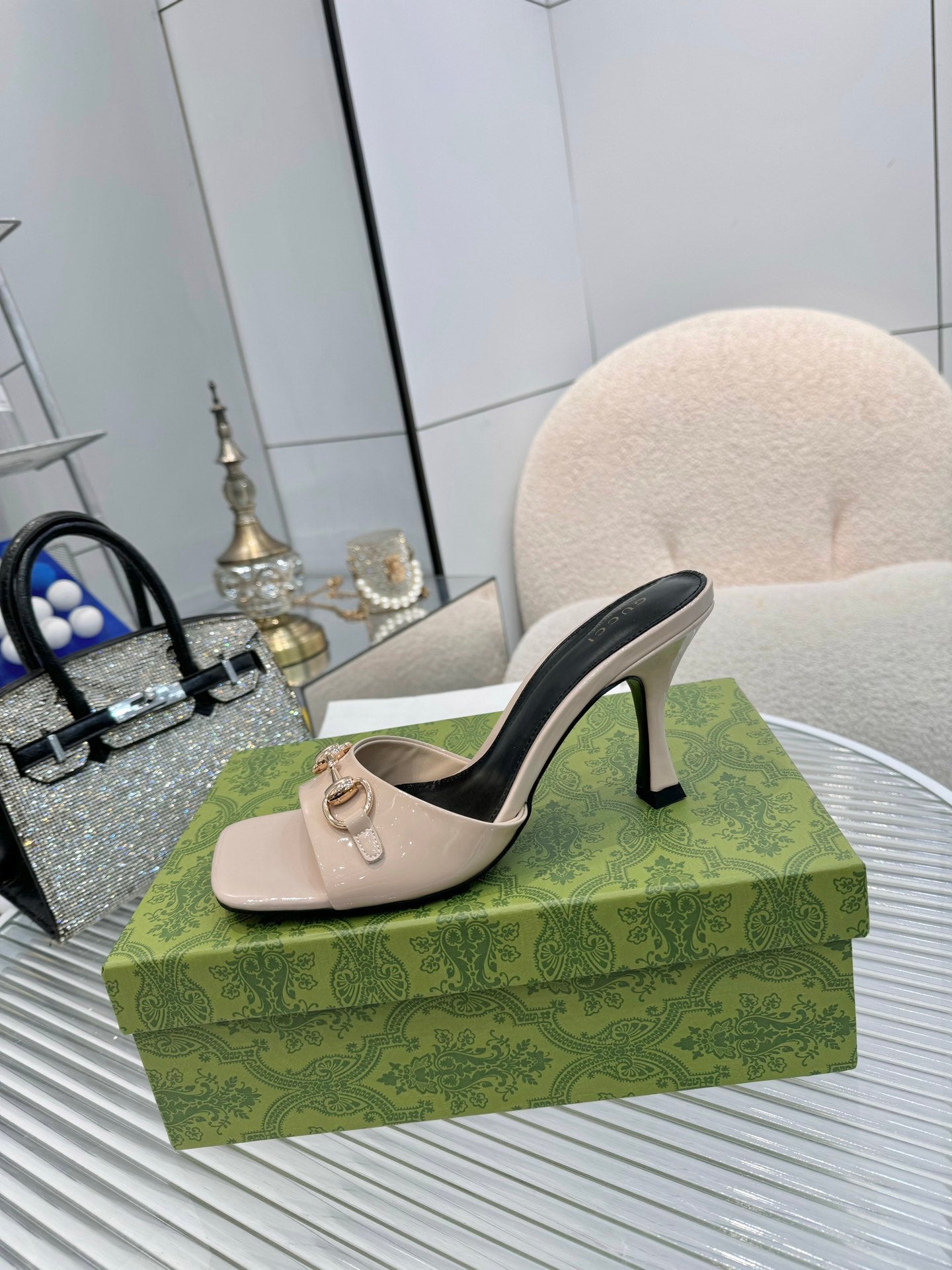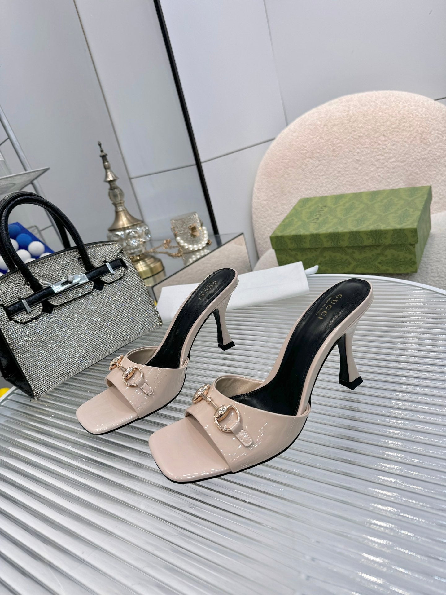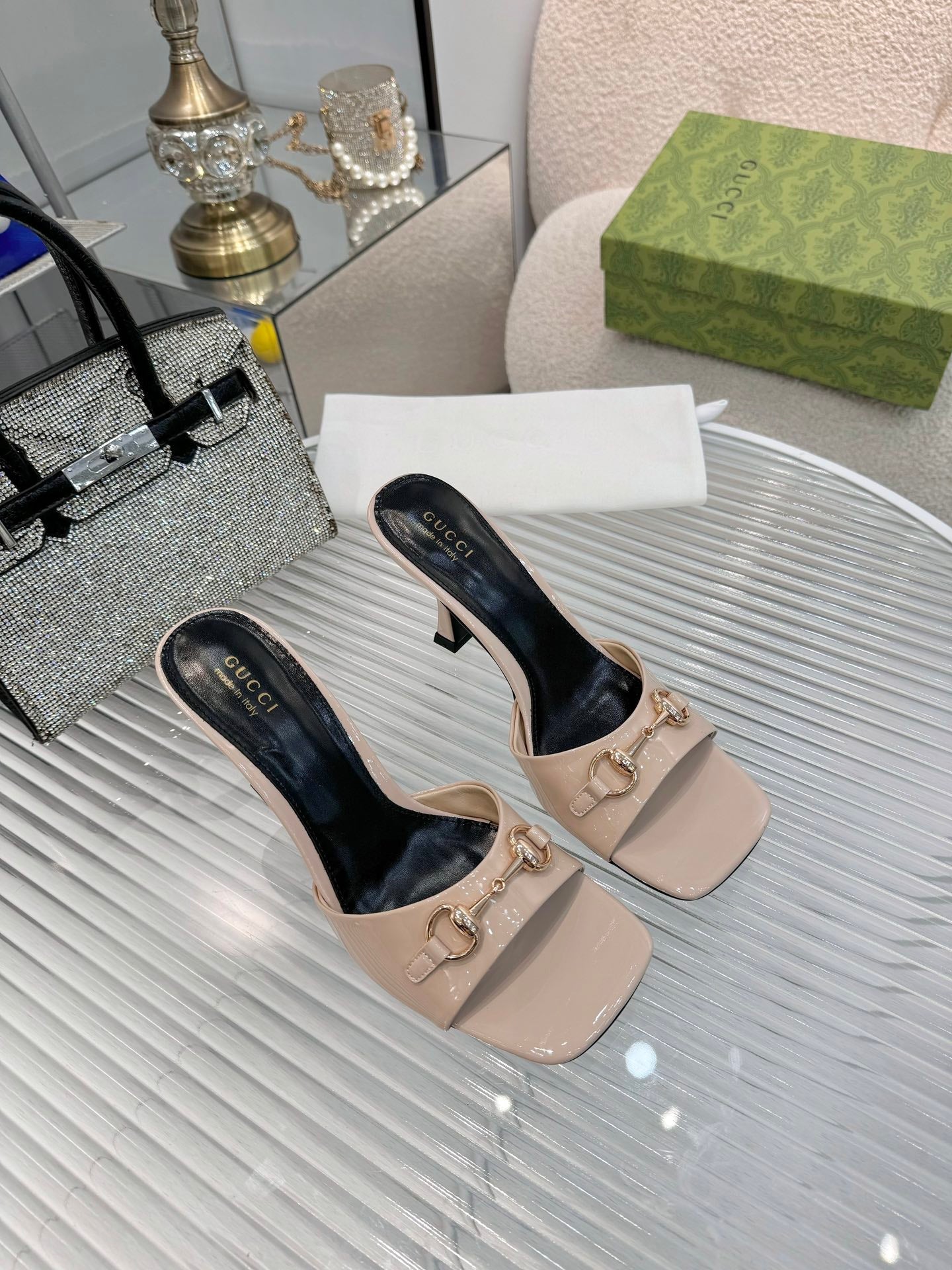 GG Gold Buckle Slide Sandal 80mm Beige Patent Leather 457561