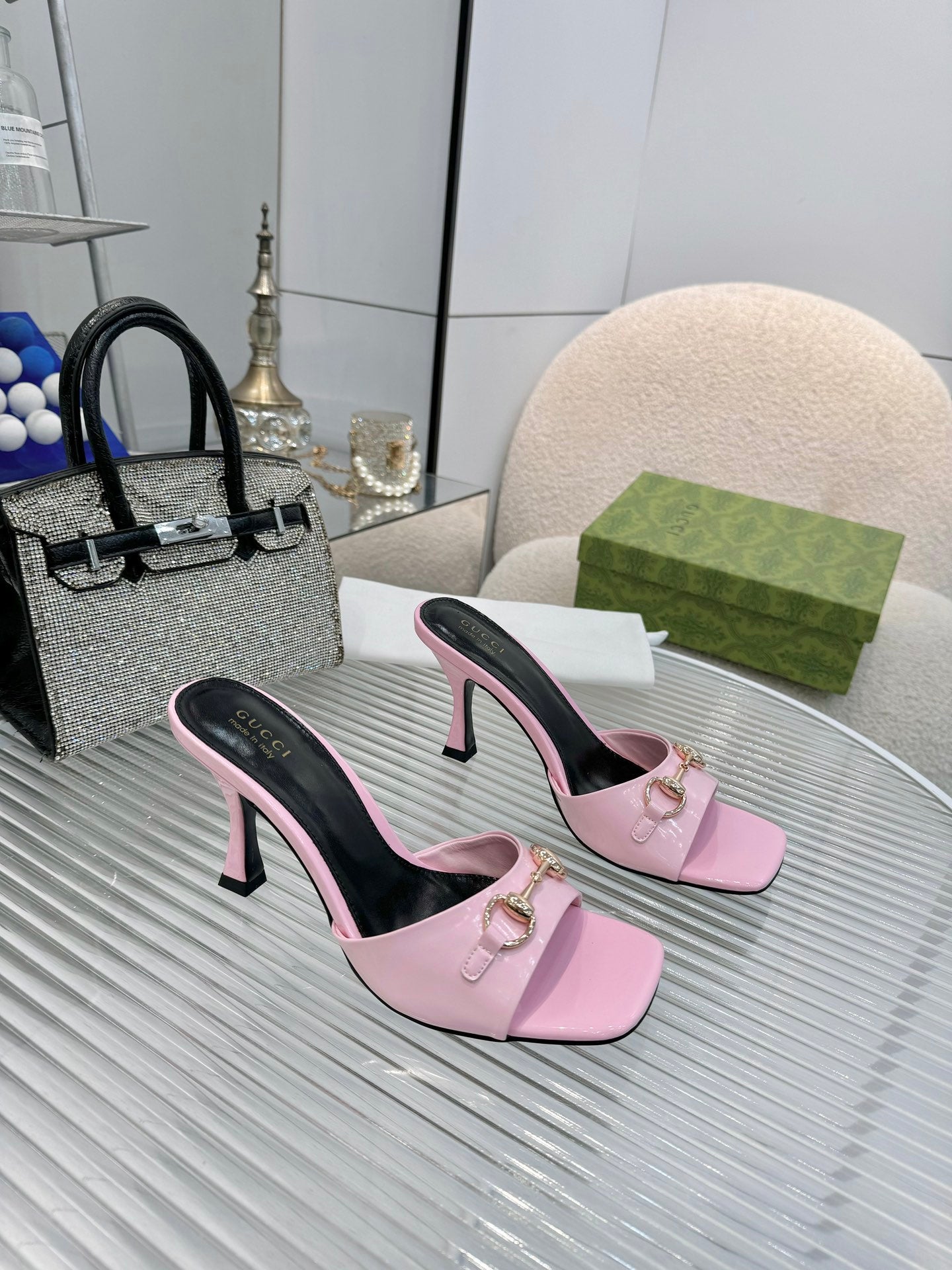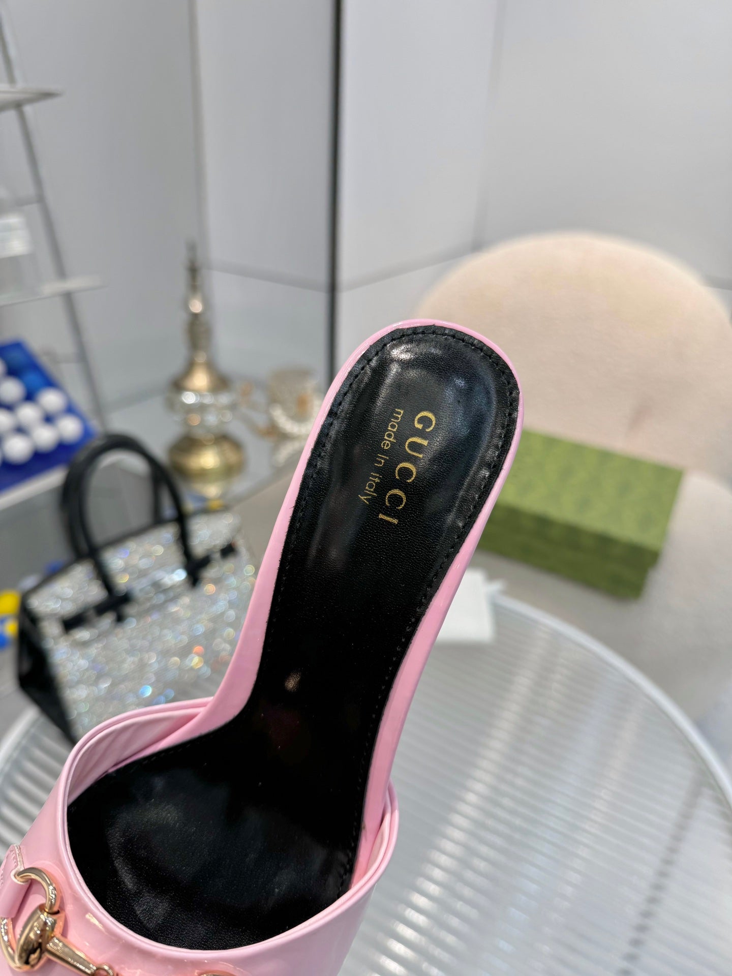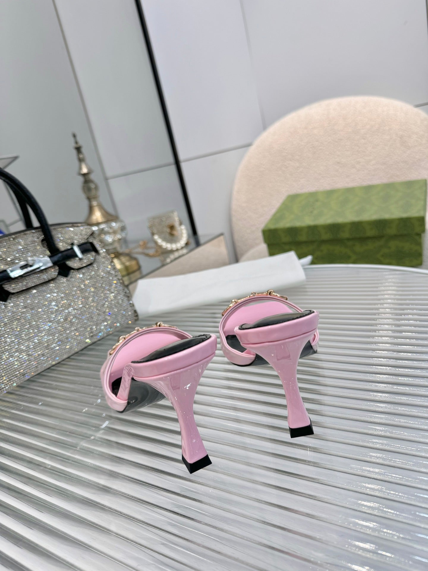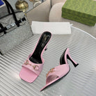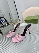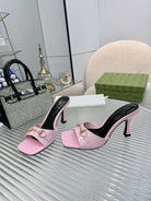 GG Gold Buckle Slide Sandal 80mm Light Pink Patent Leather 457563