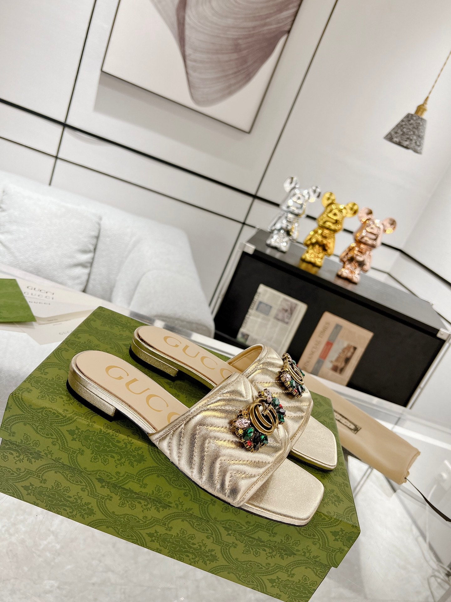 GG SPARKLE CRYSTAL SLIDE SANDAL METALLIC GOLD CALFSKIN