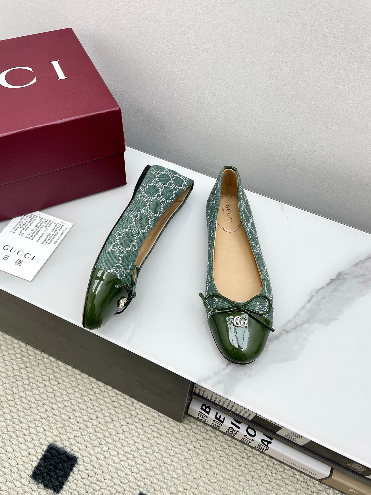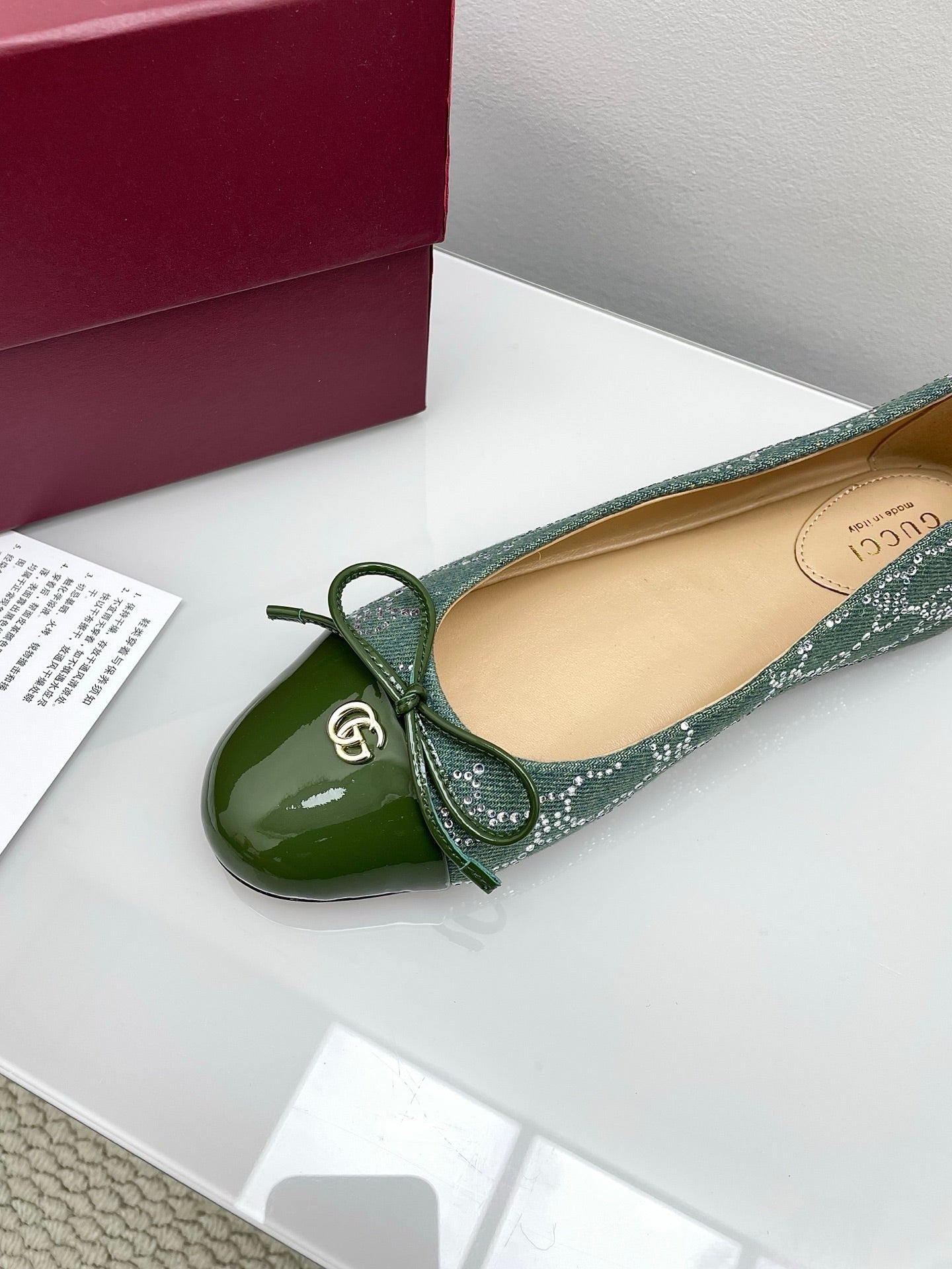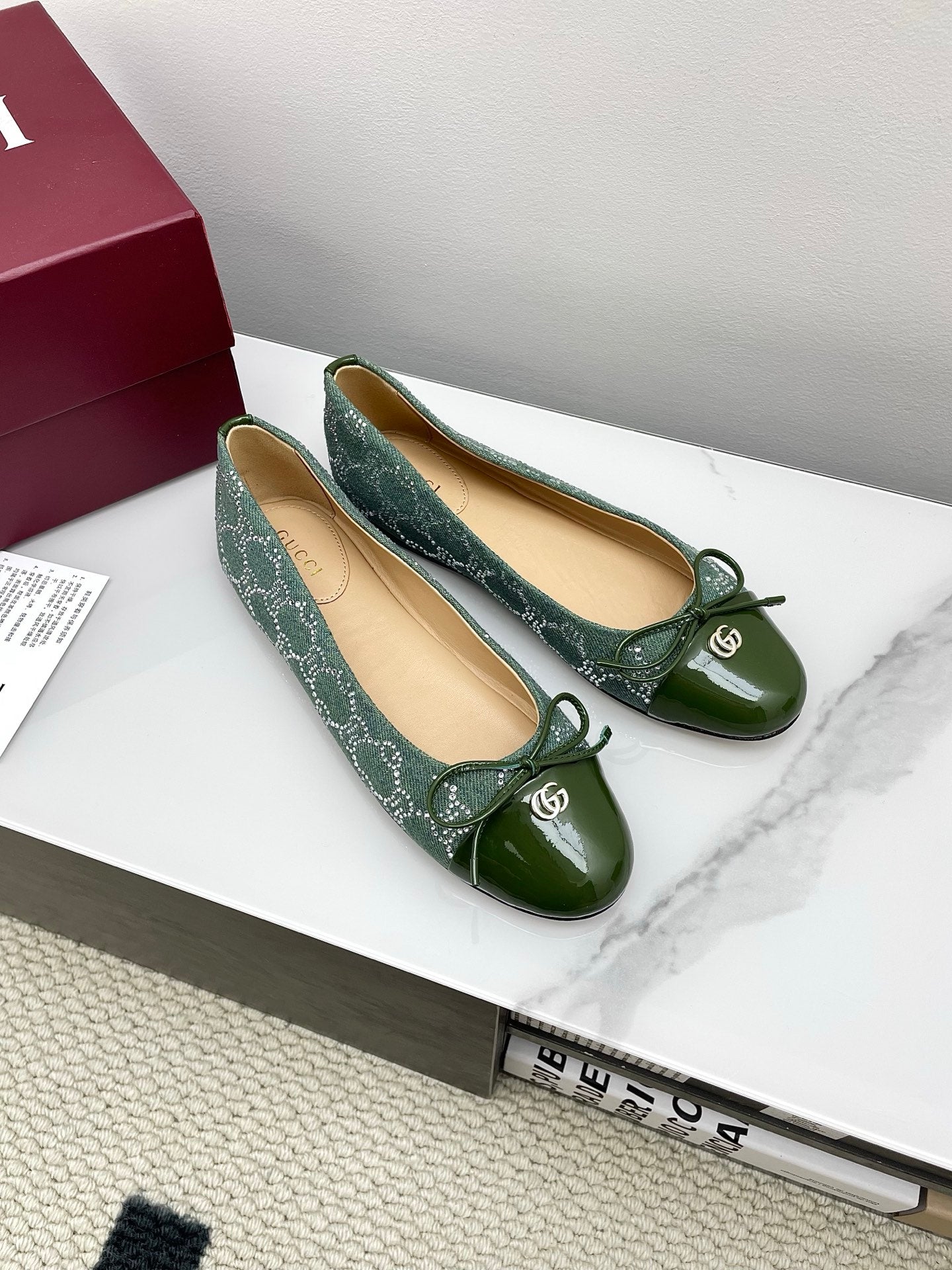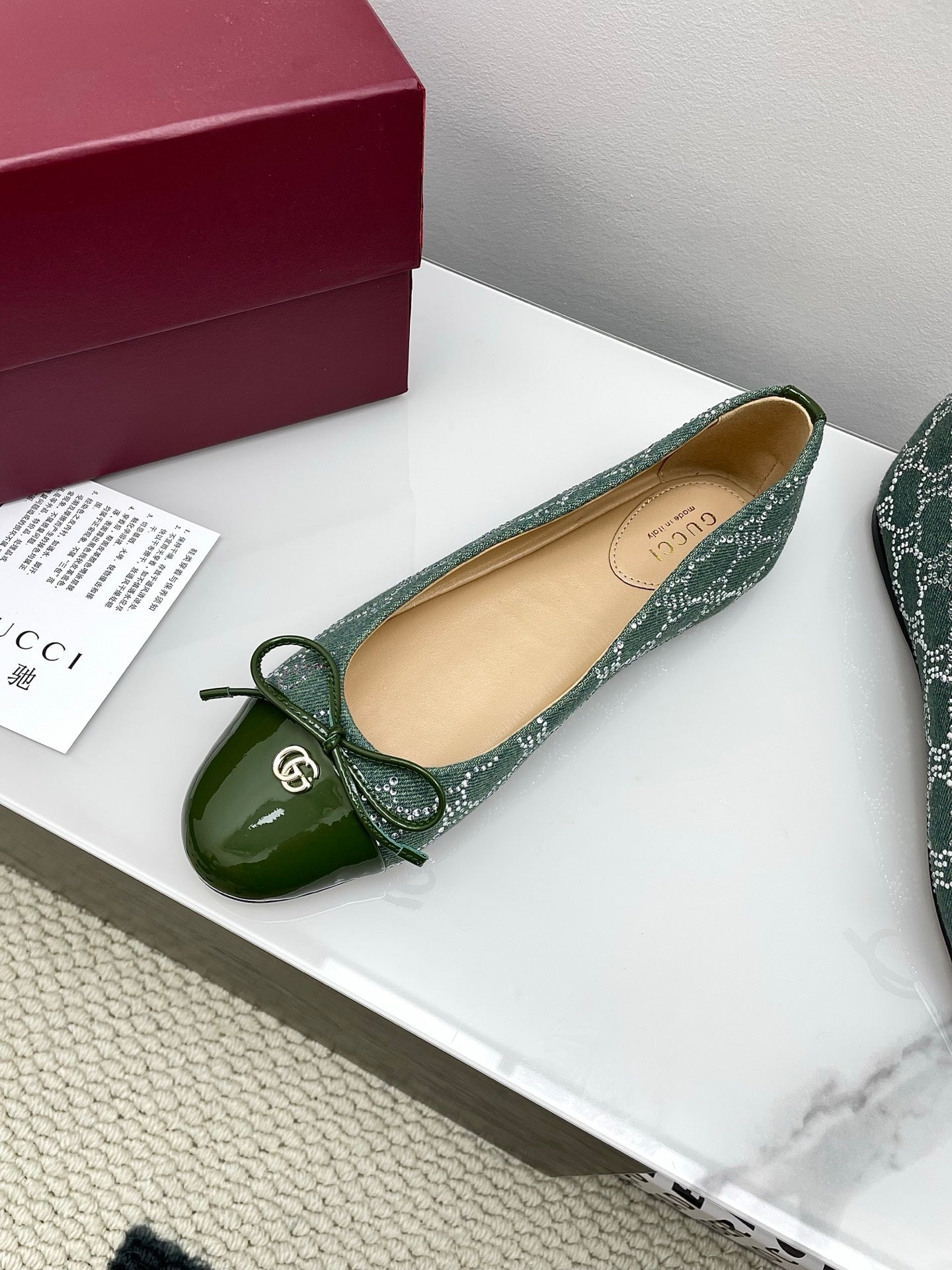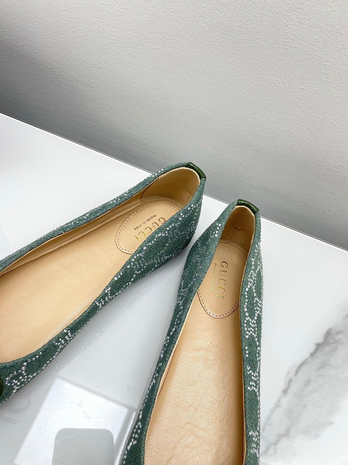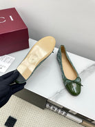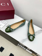 GG Women's Crystal Ballet Flat Dark Green Denim Patent Leather Trim 511495