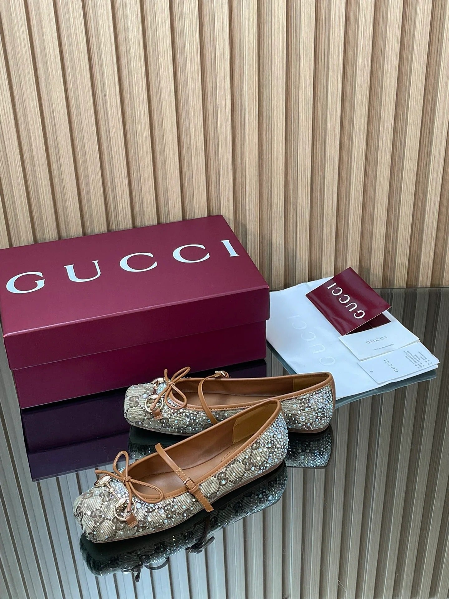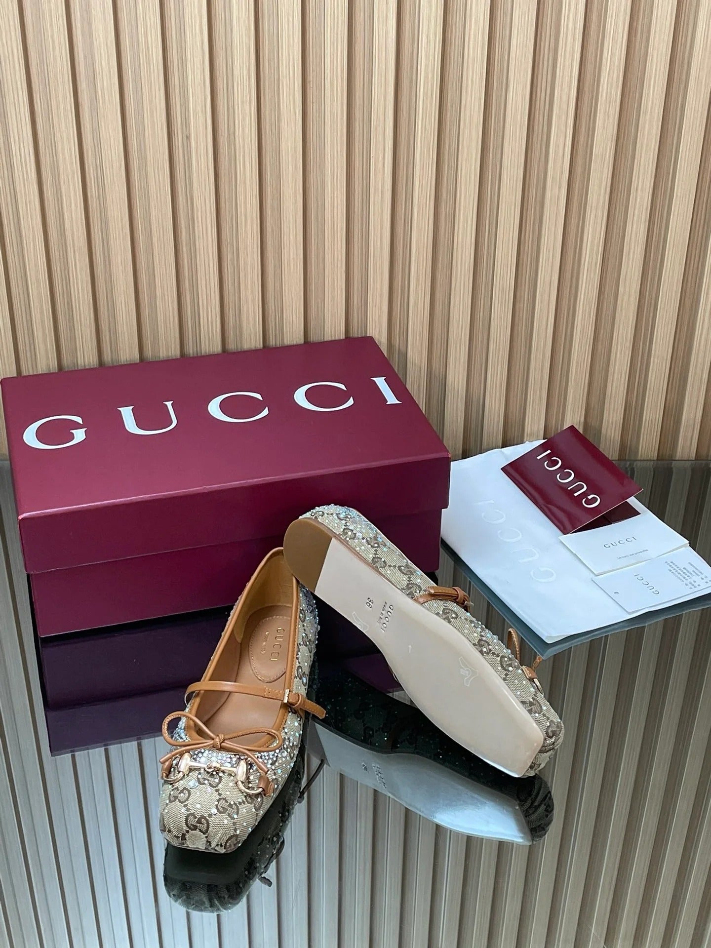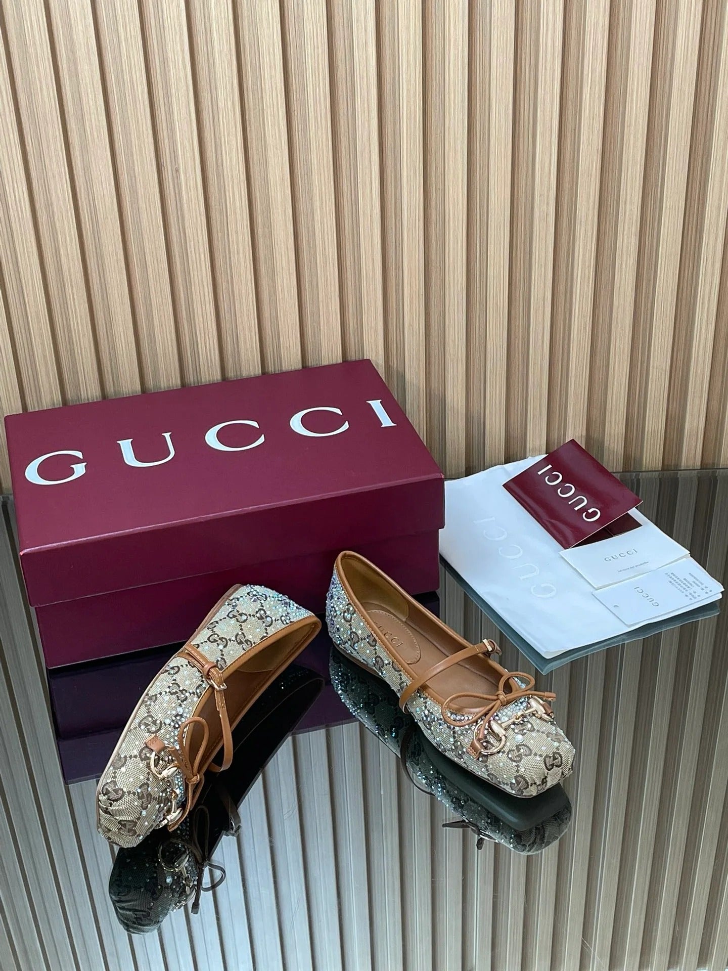 Gucci 2026 Crystal Rhinestone Ballet Flat Beige Brown Canvas Leather 562909