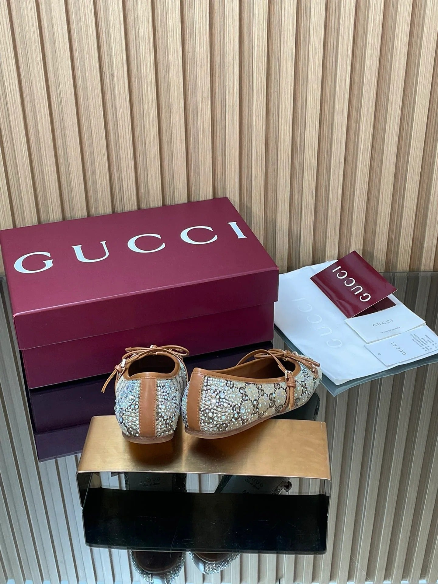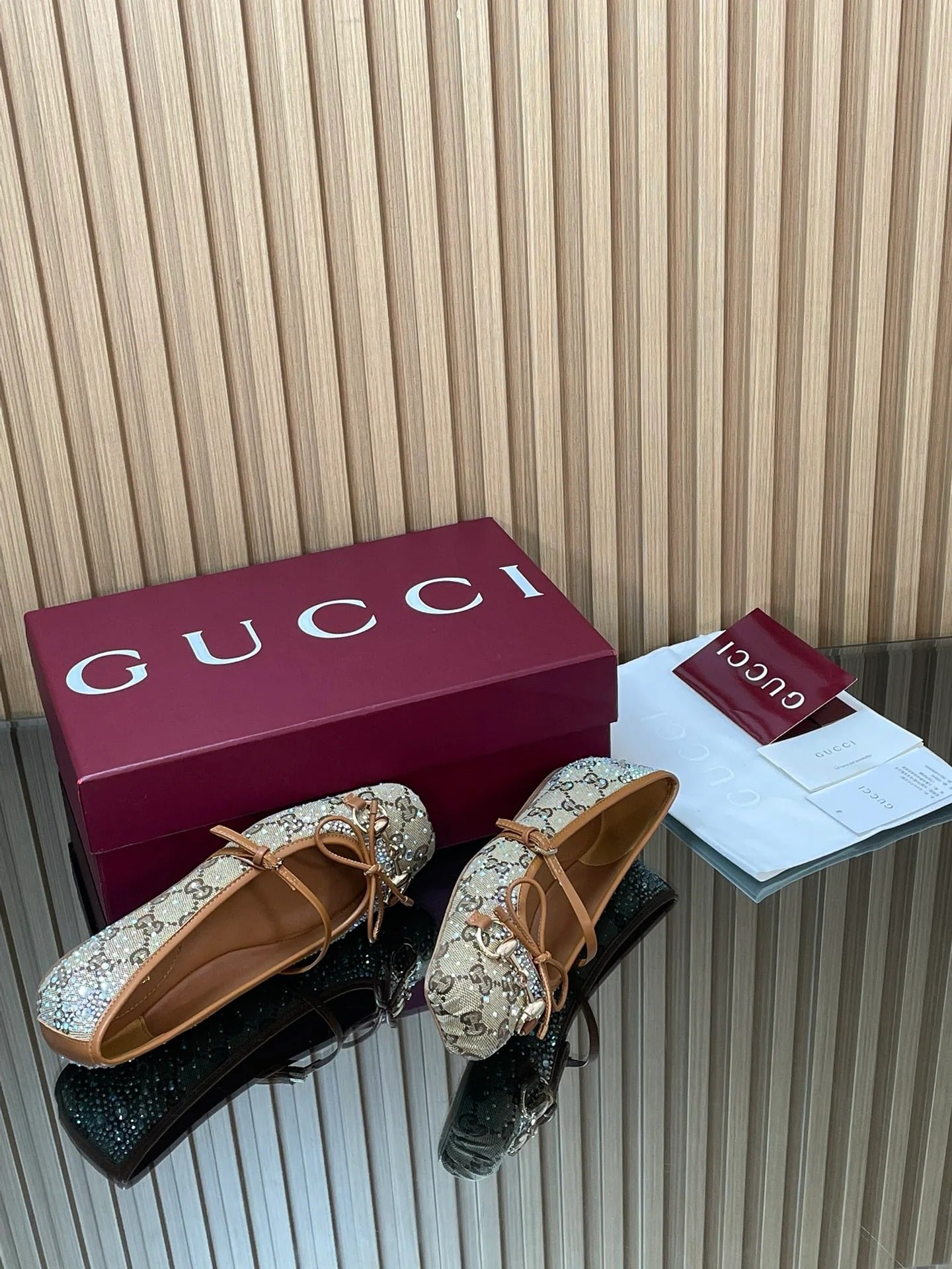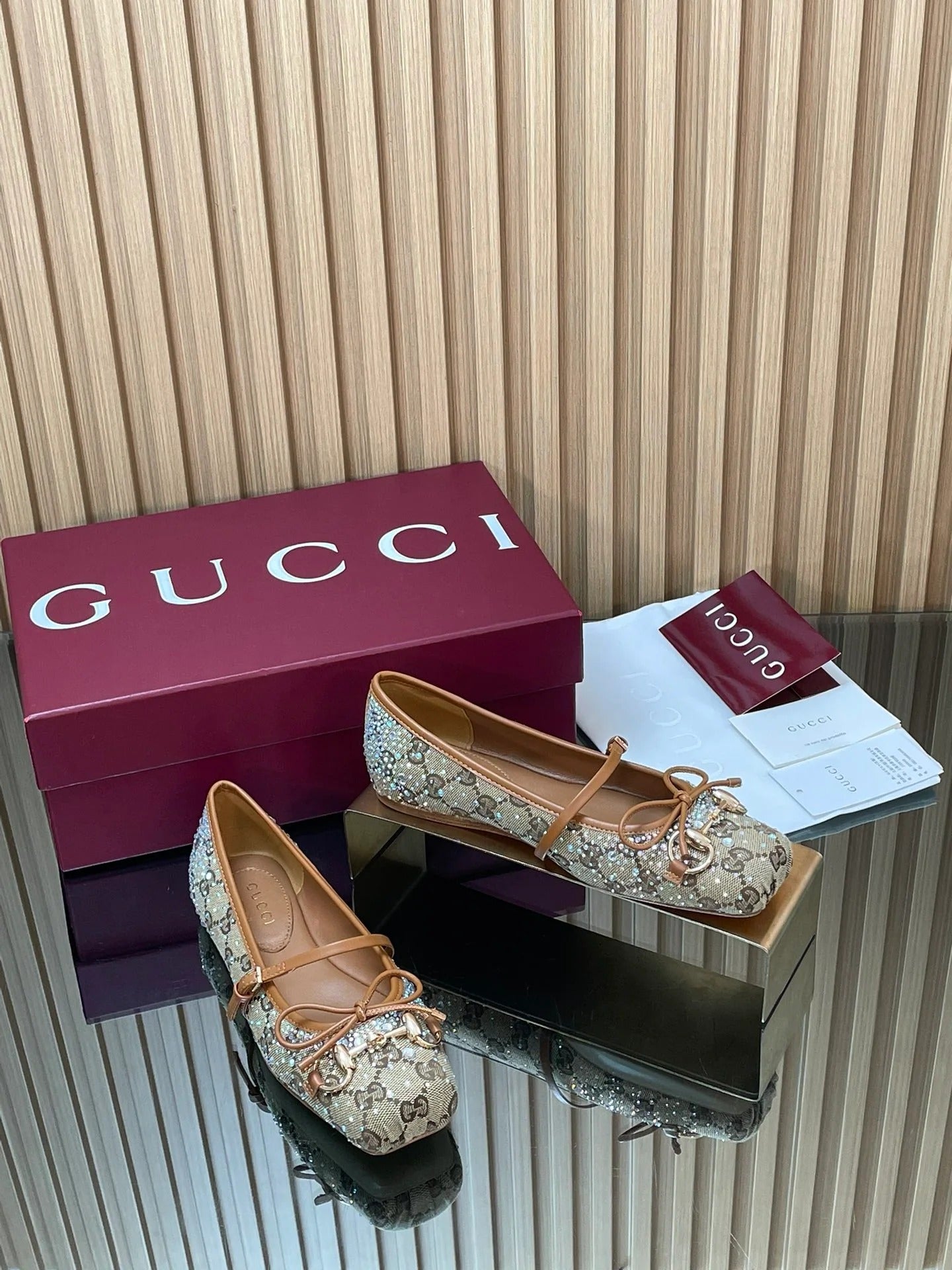 Gucci 2026 Crystal Rhinestone Ballet Flat Beige Brown Canvas Leather 562909