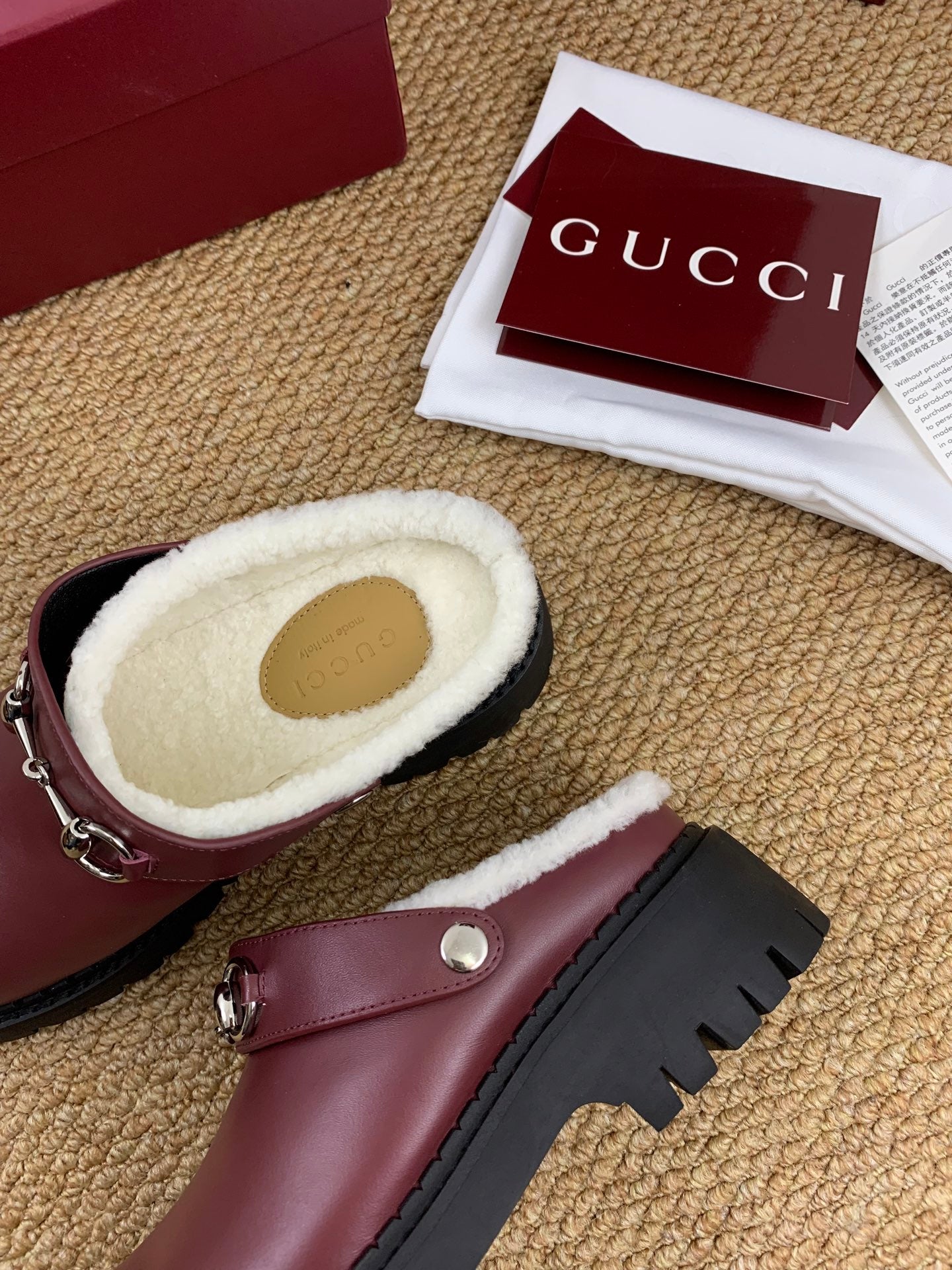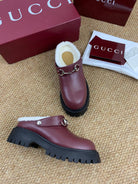 Gucci FW 25 Horsebit Suede Clog Deep Burgundy Leather with Shearling 506442