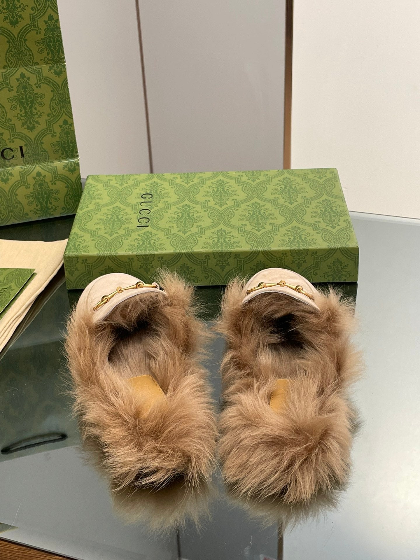HORSEBIT MULE IN TAN BROWN SUEDE AND LAMB WOOL LINING