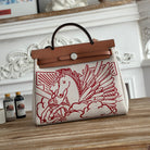 HERBAG ZIP 31 RETOURNE PEGASE POP BAG IN OFF-WHITE MIX RED CANVAS AND HUNTER COWHIDE