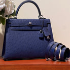 KELLY SELLIER 25 BAG IN NAVY BLUE OSTRICH LEATHER WITH SILVER HARDWARE (MADE - TO - ODER)