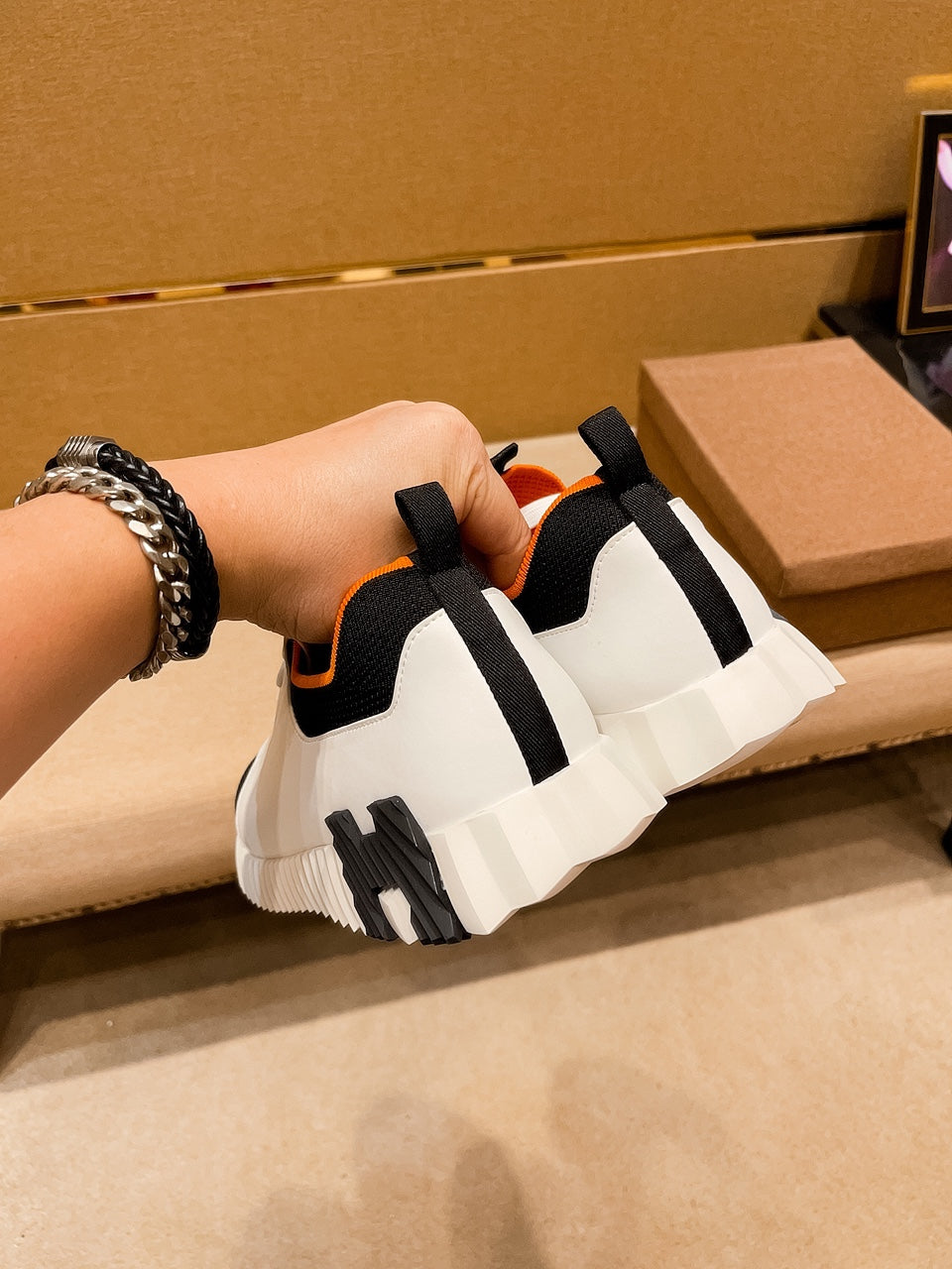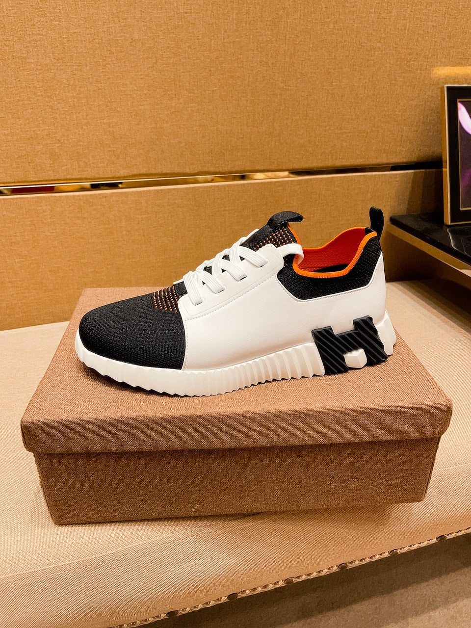 HM Men's Depart Slip-on Sneaker White Black Knit Cowhide 541299