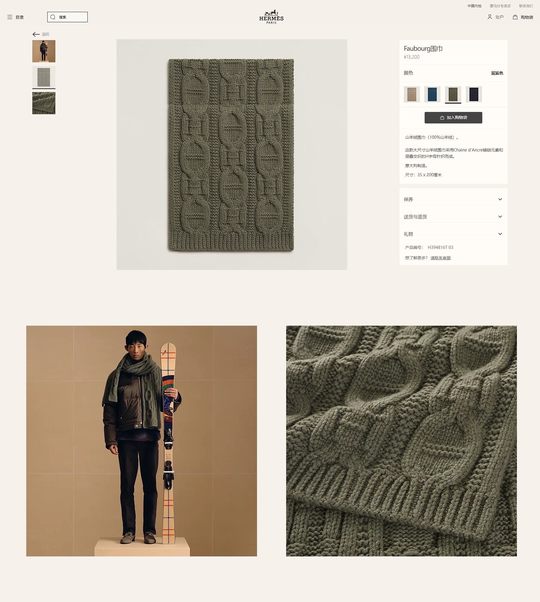 Faubourg Muffler Scarf 170 CM Khaki Green Cashmere Handwoven 356203