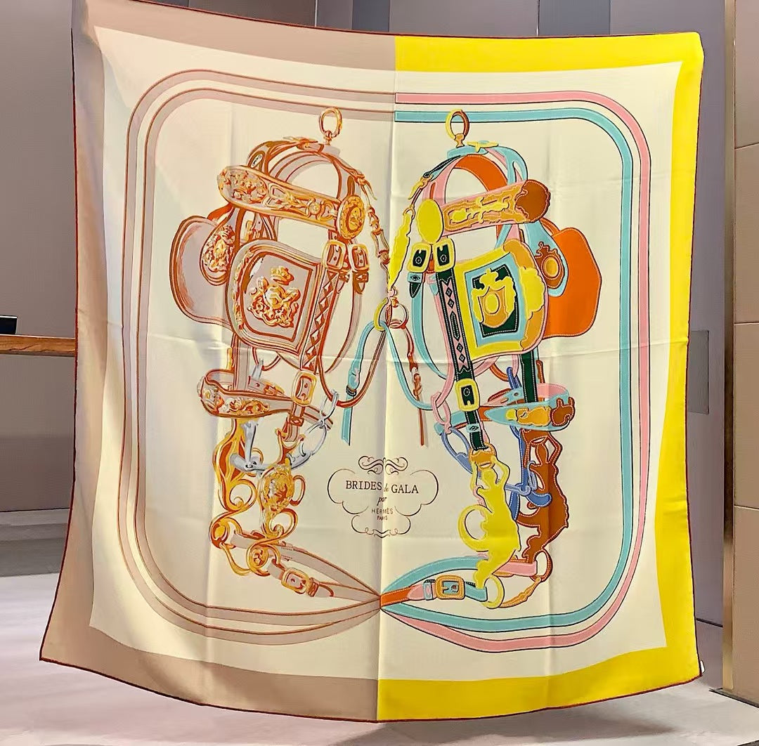 HM Brides de Gala Applique Pique shawl Scarf 140 CM In Brown and Yellow Cashmere And Silk 359401