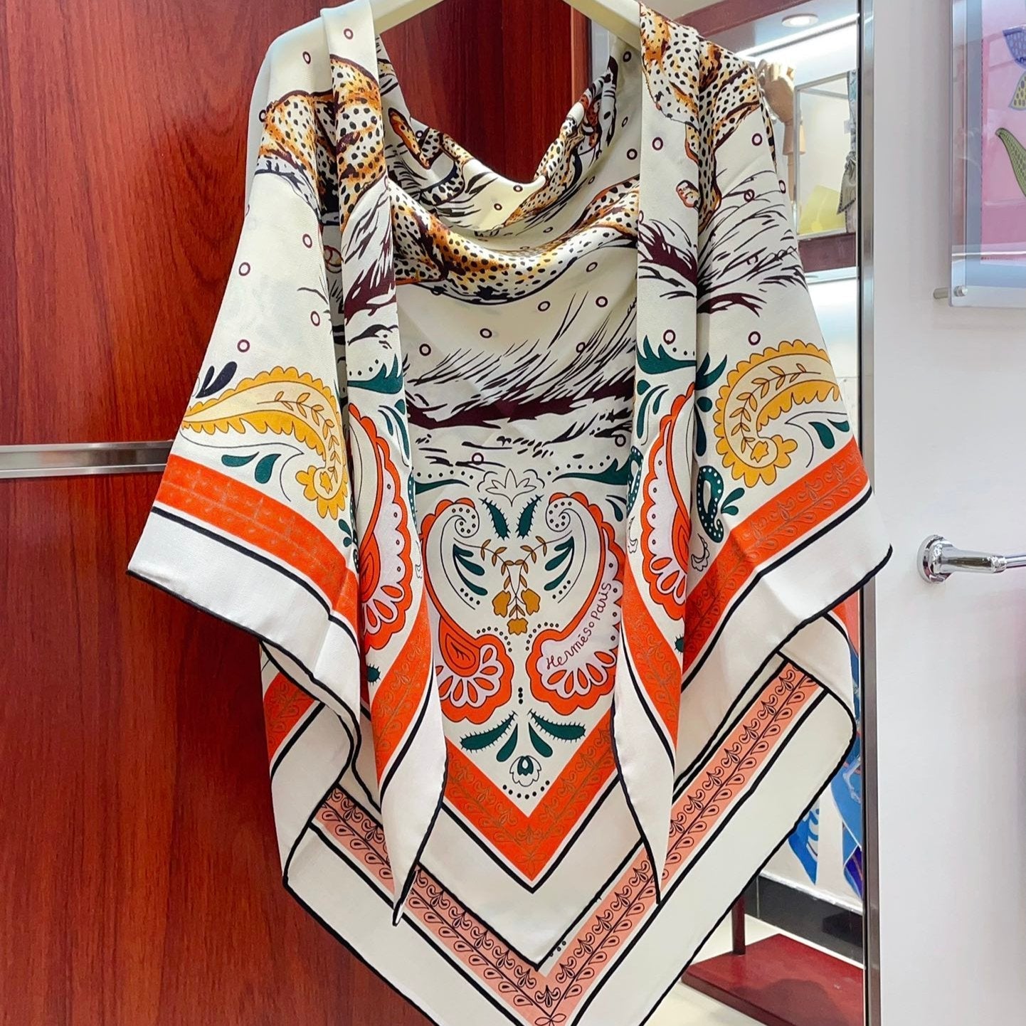 Guepards Bandana Double Face Scarf 140 CM In Beige Mix Orange Colorful Cashmere And Silk 334189