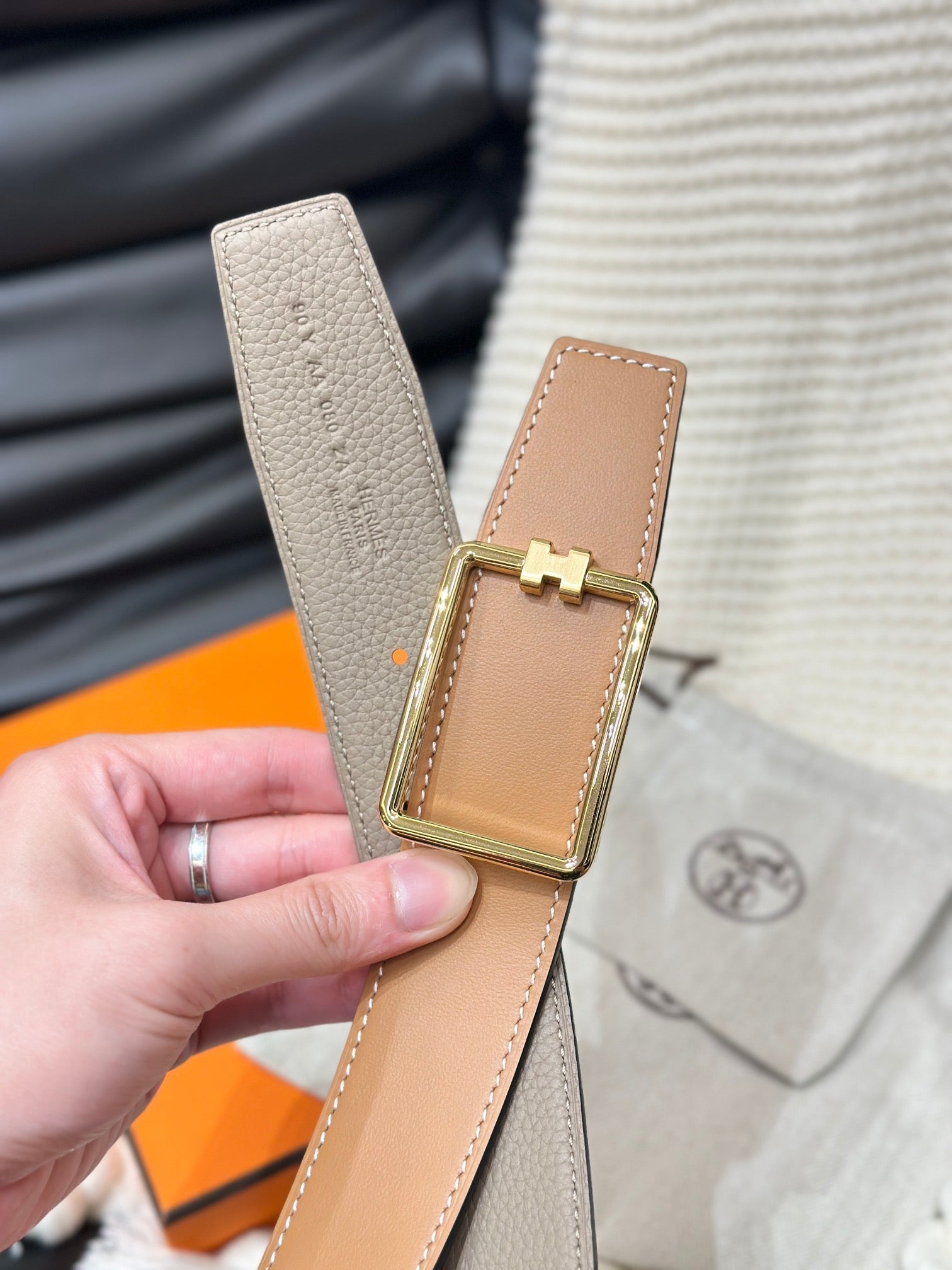 HM TUBE H BELT GOLD BUCKLE & REVERSIBLE HONEY ORANGE LEATHER STRAP 38MM