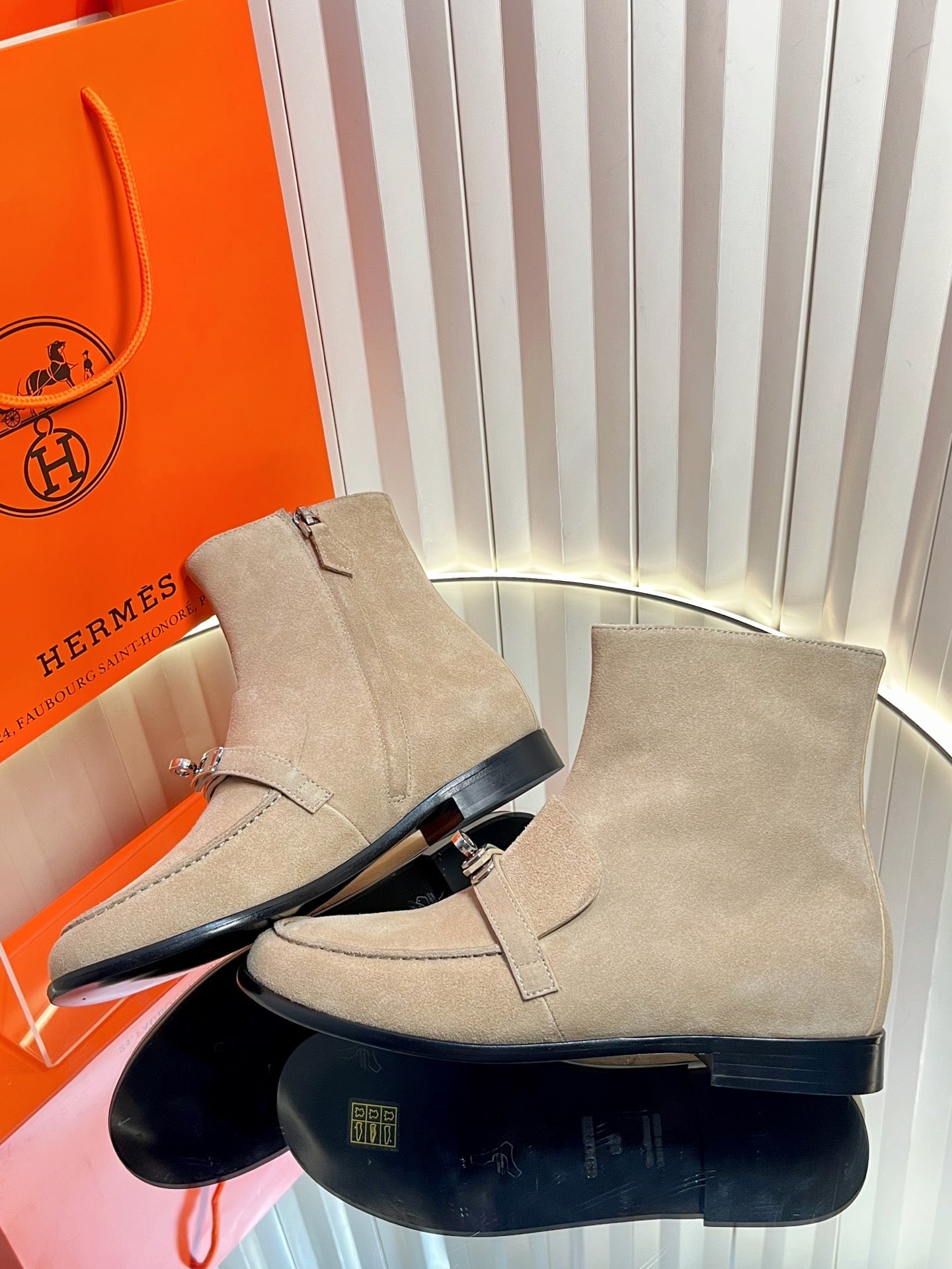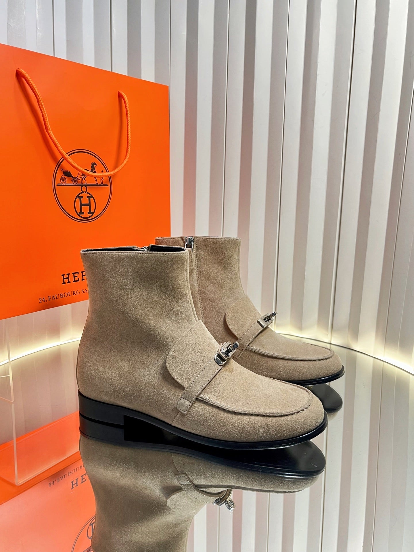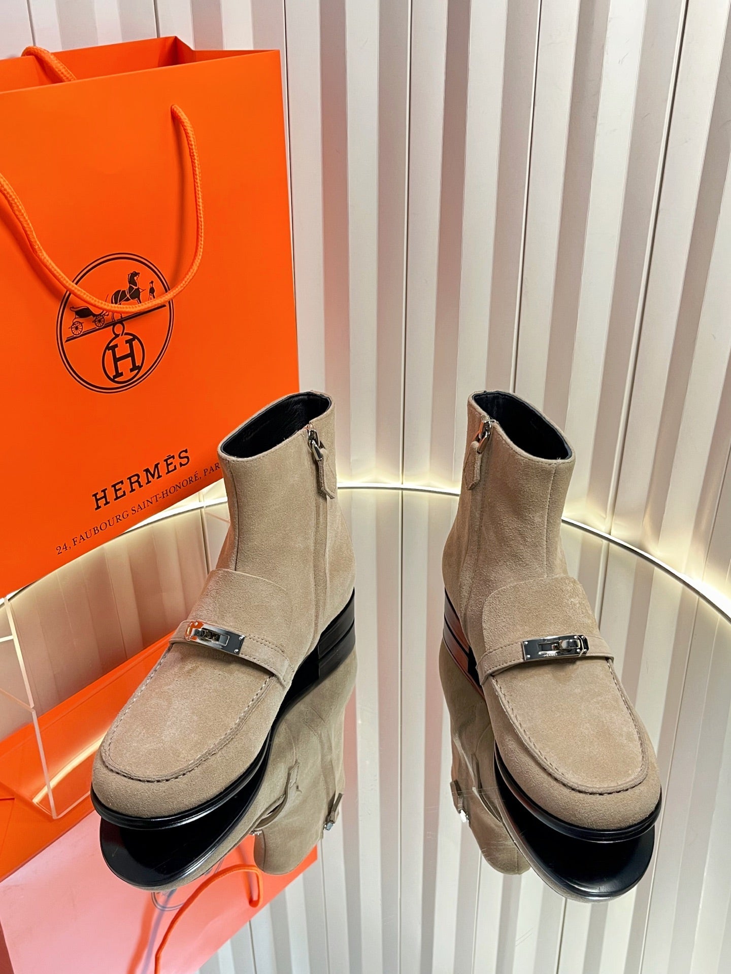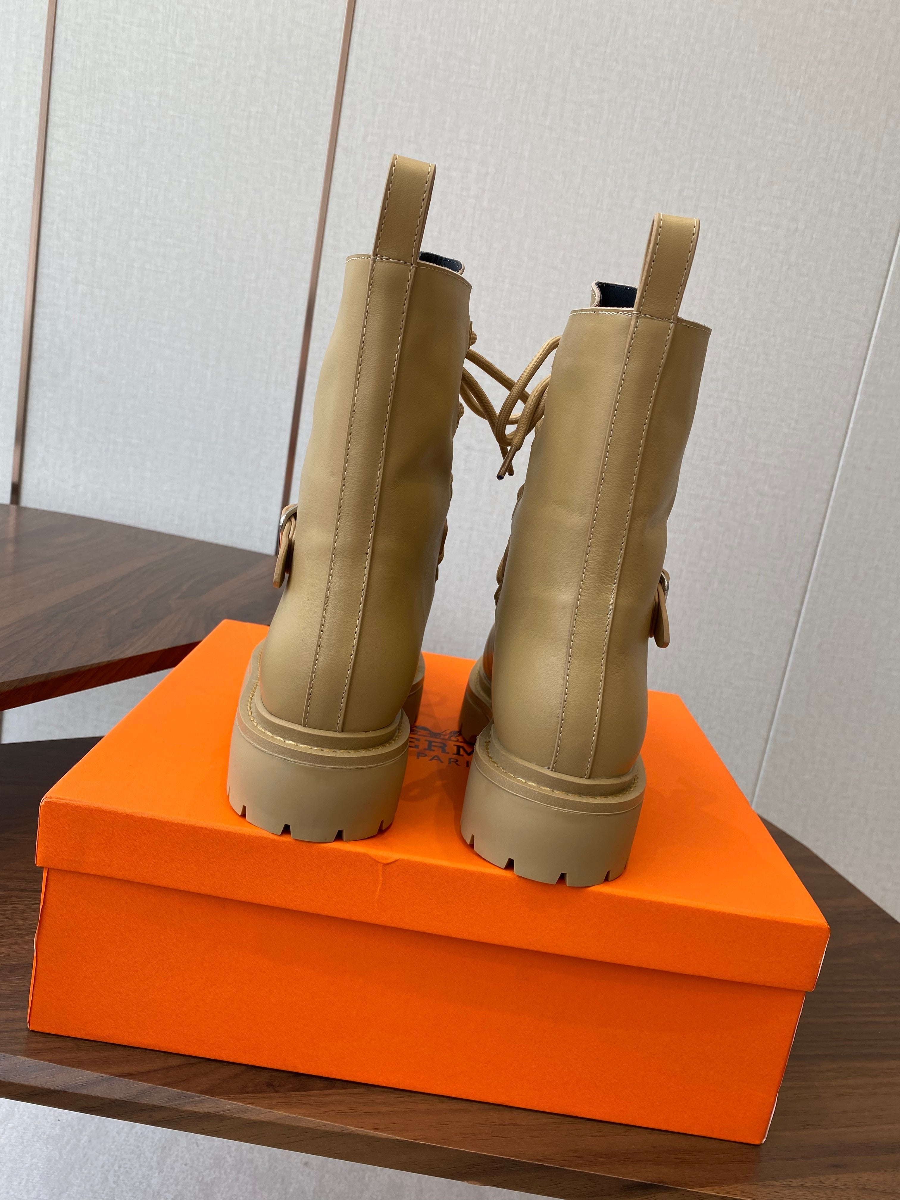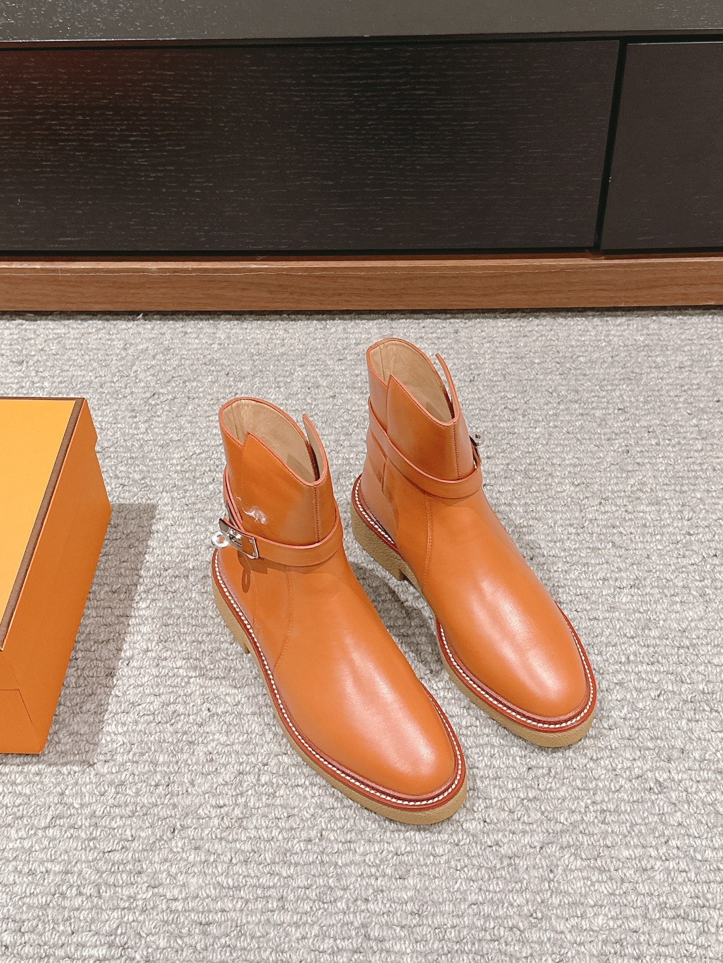 HM 25ss Kelly Buckle Riding Boots Dark Beige Cowhide 576122