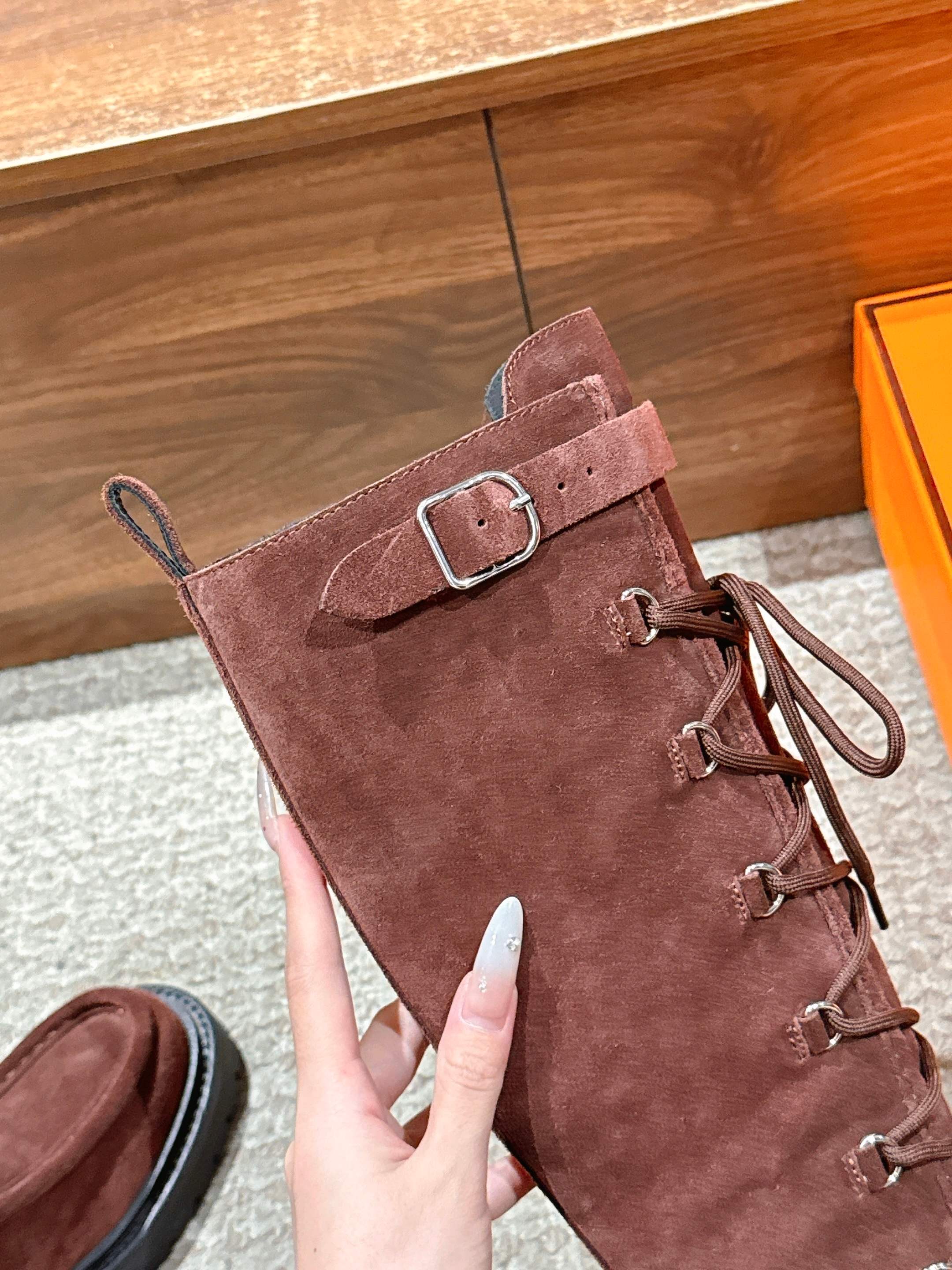 HM 25ss Kelly Buckle Riding Boots Dark Brown Suede 576118