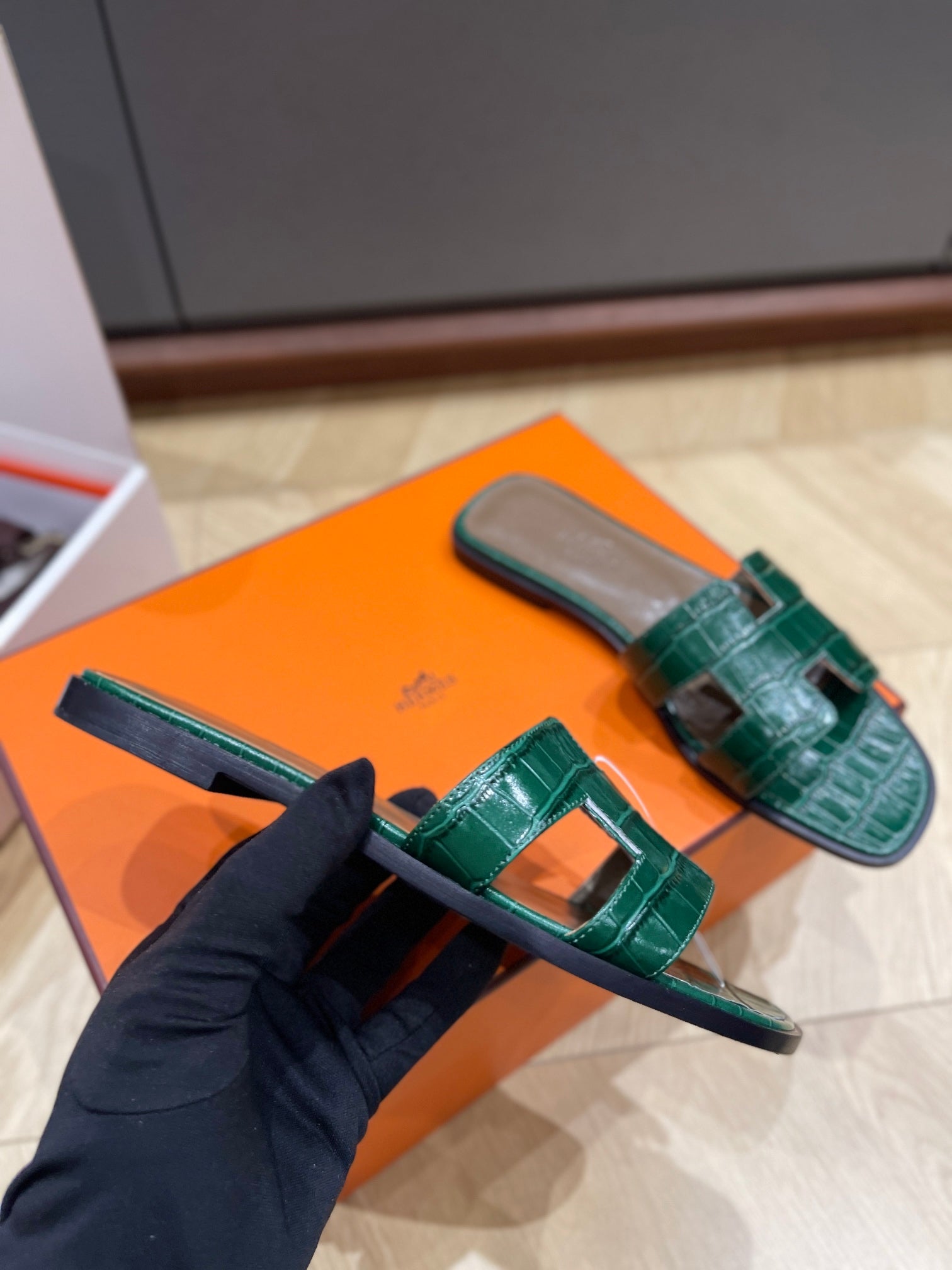 HM 26ss Oran Sandals 50 Forest Green Ostrich Leather 625129