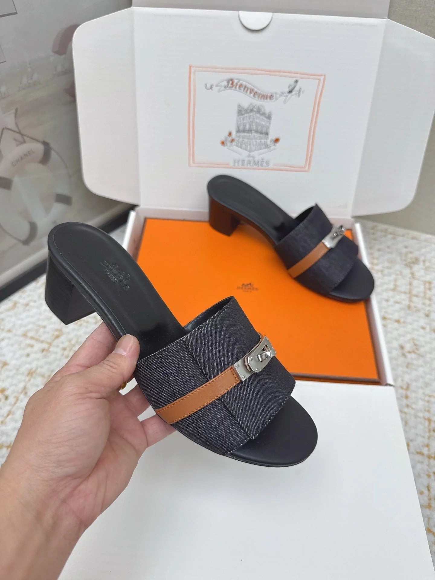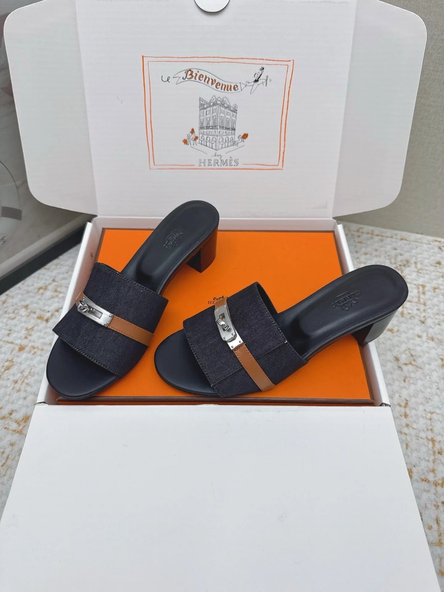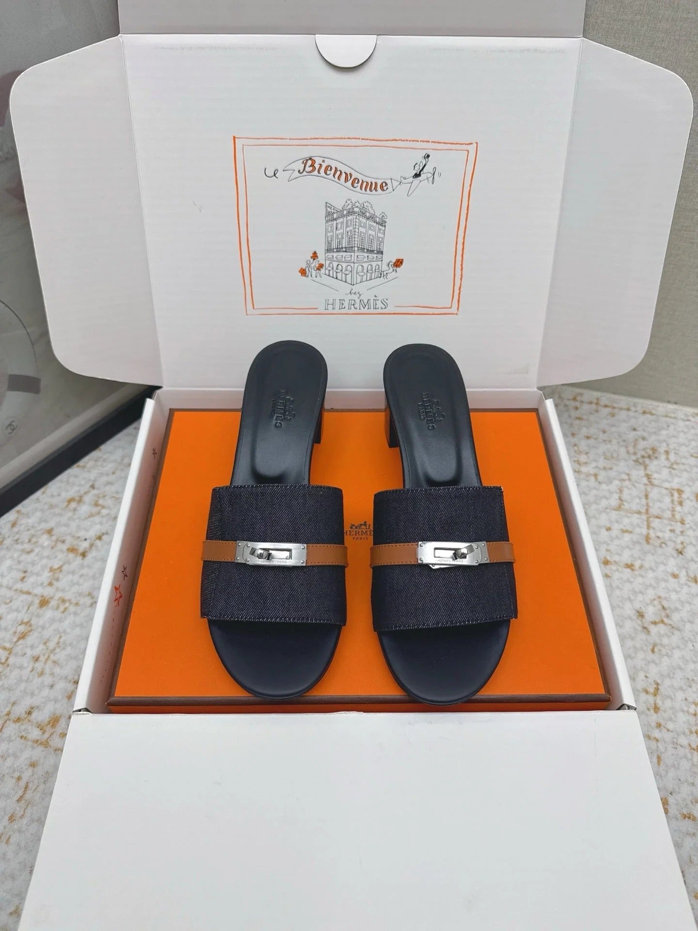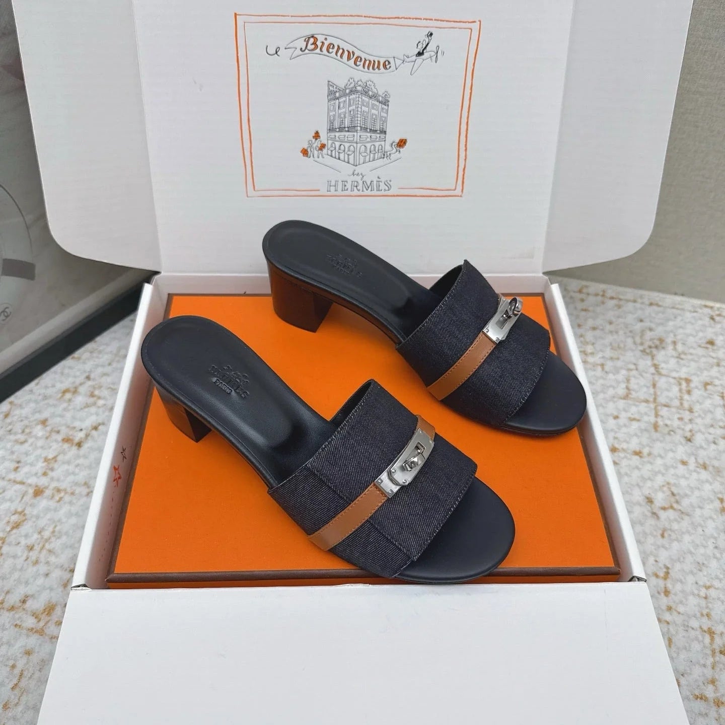 HM 26ss Oasis Sandals Navy Blue Black Denim Cowhide Sliver Buckle 625155