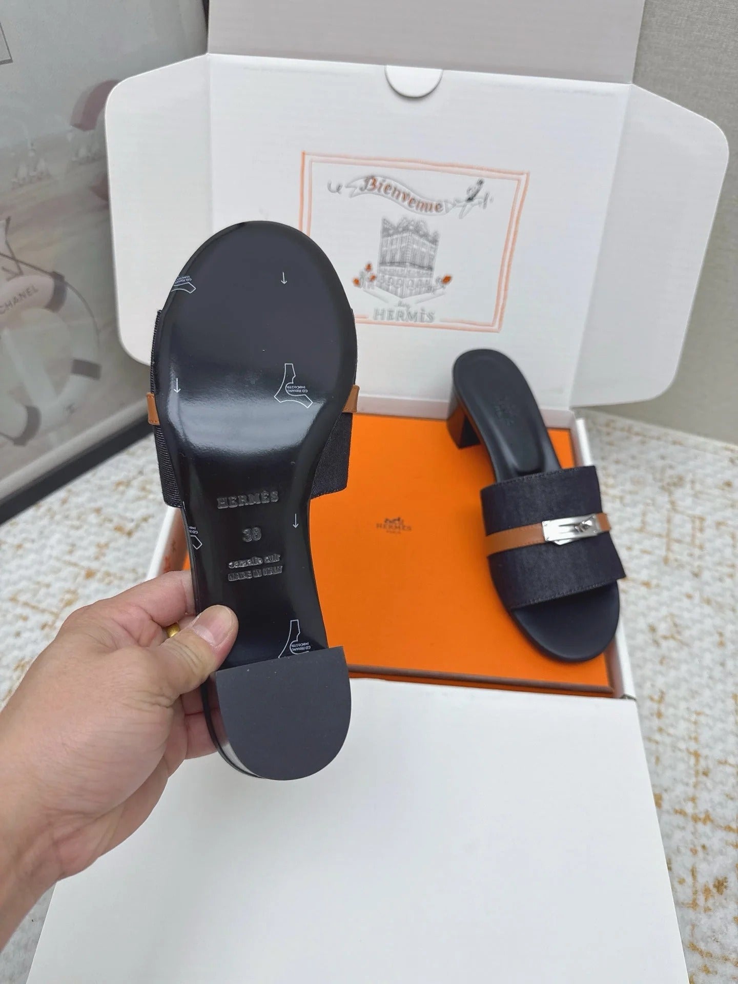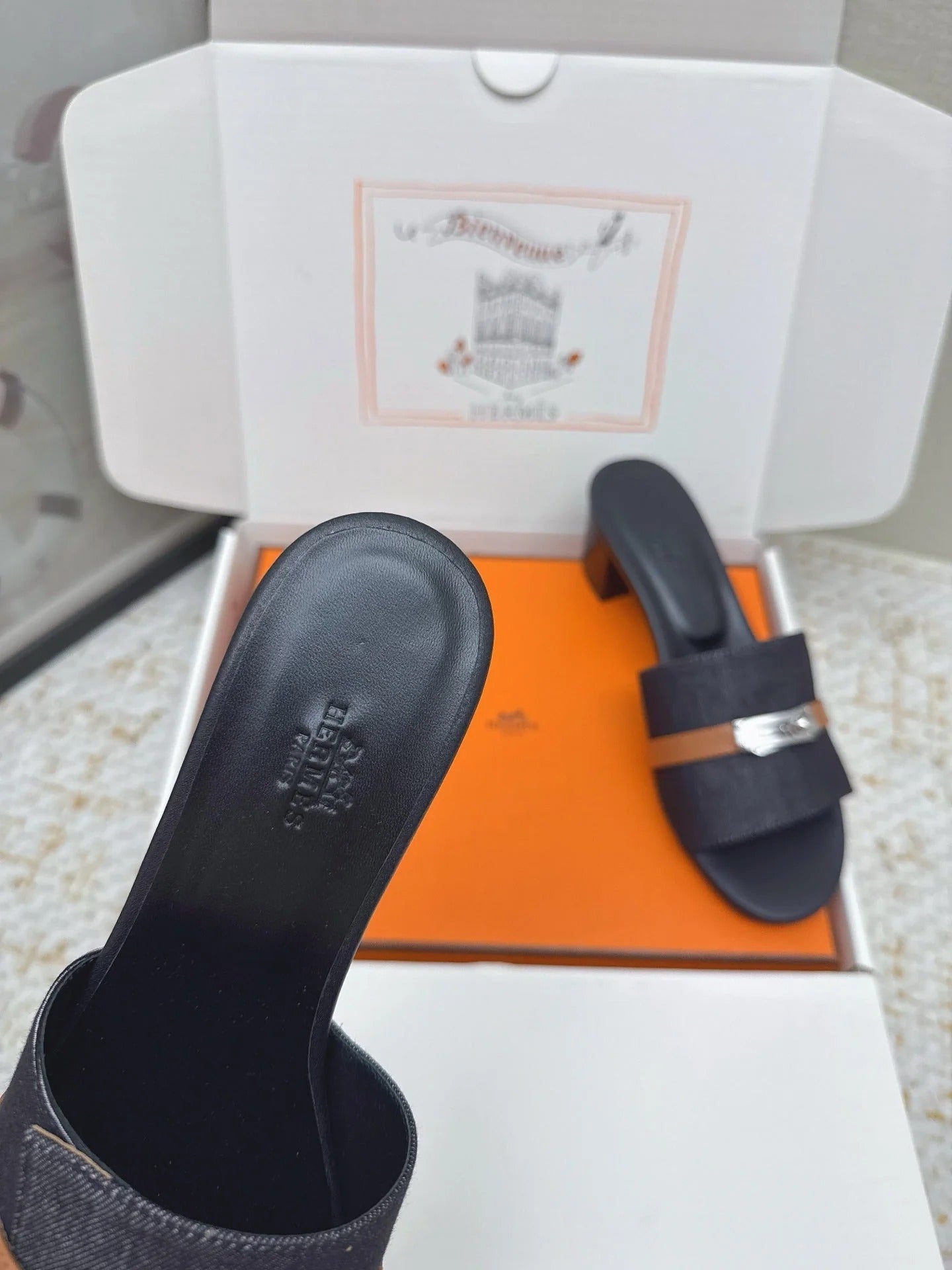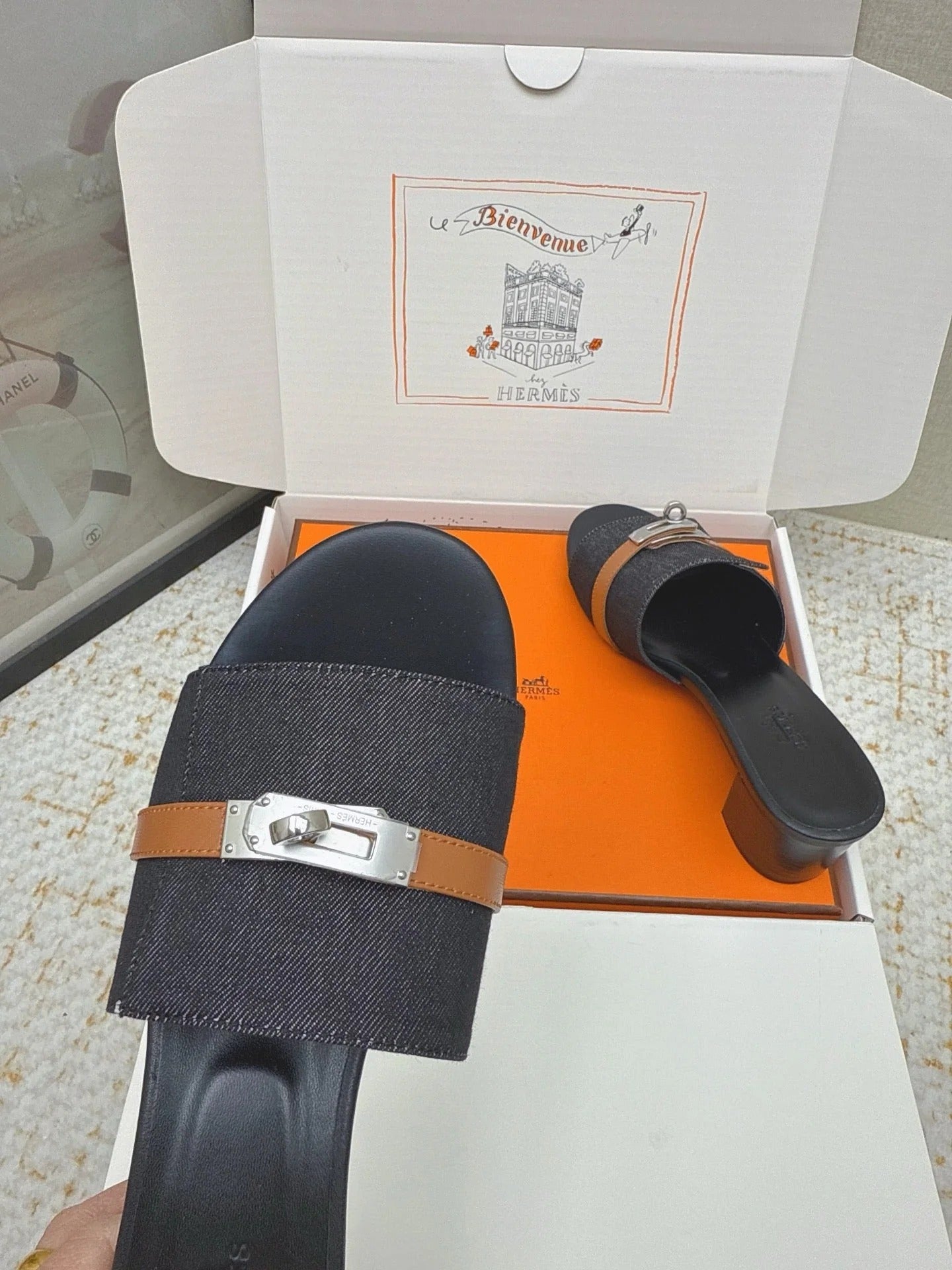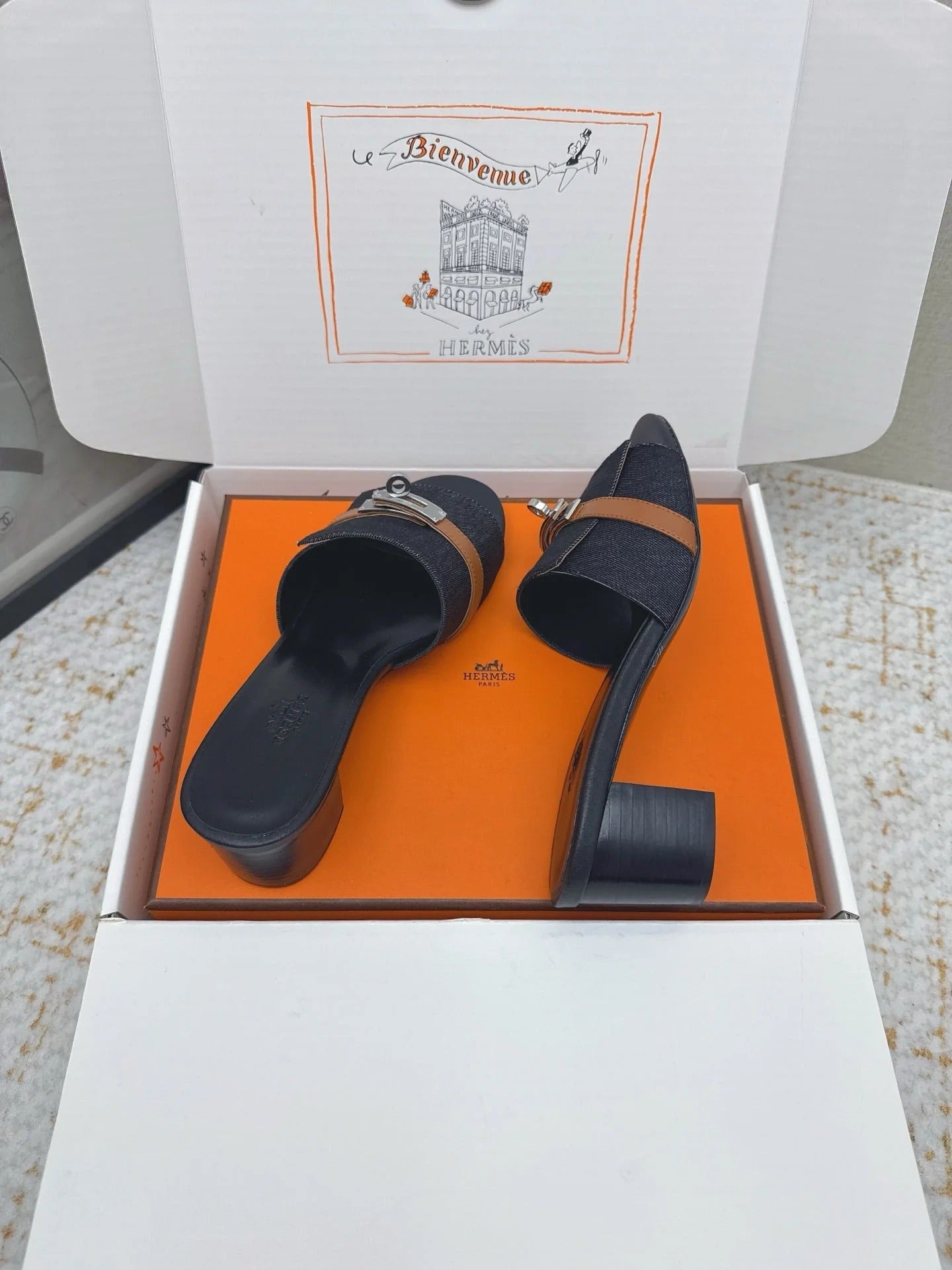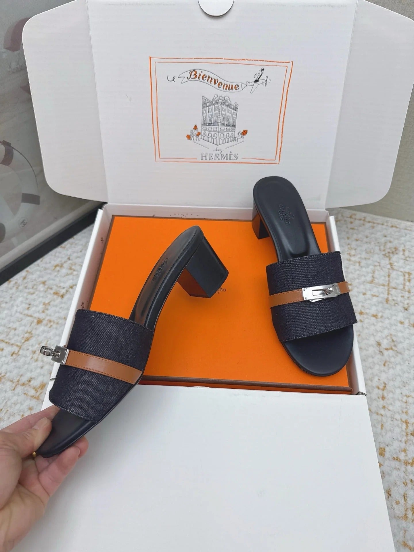 HM 26ss Oasis Sandals Navy Blue Black Denim Cowhide Sliver Buckle 625155