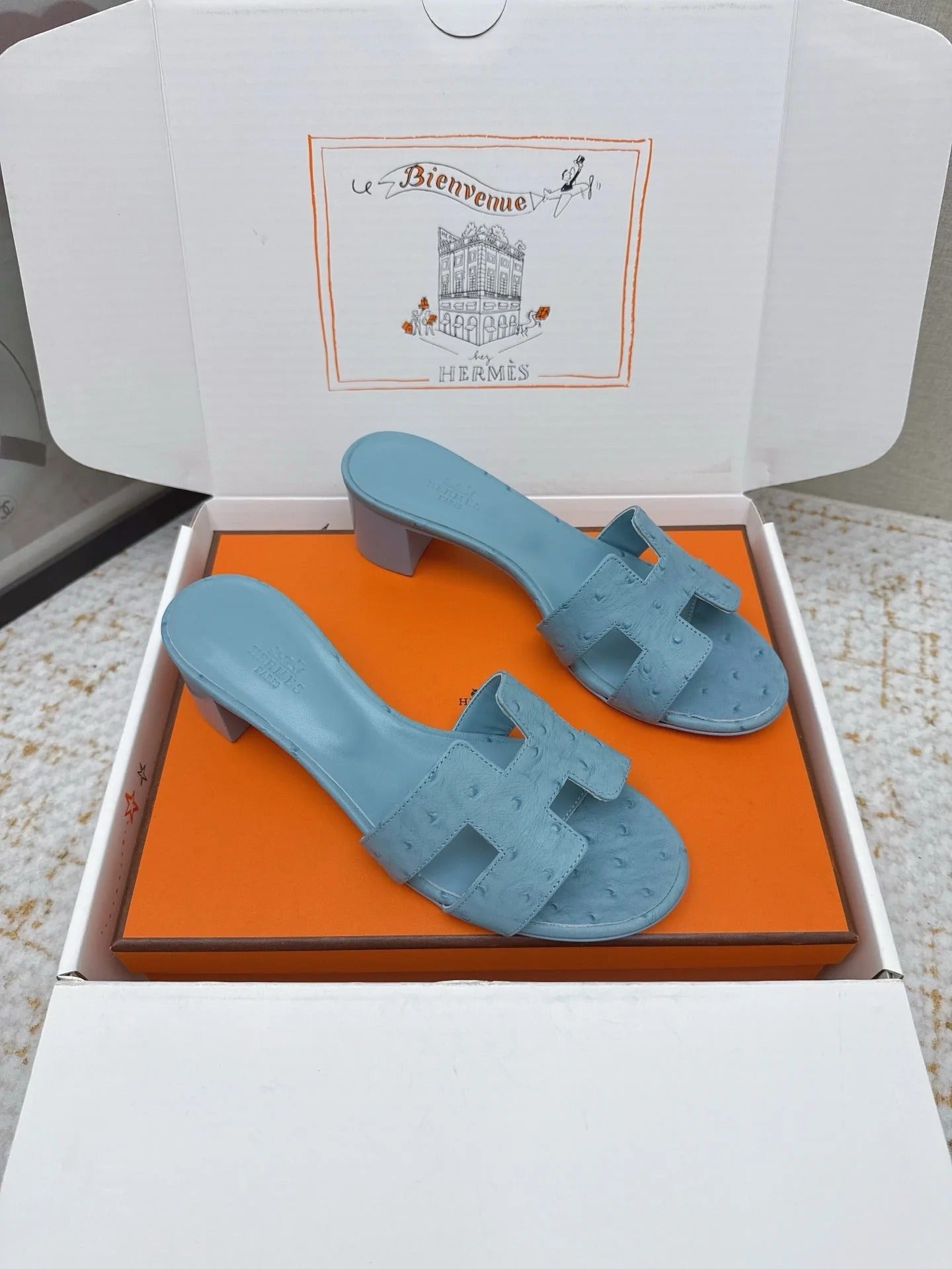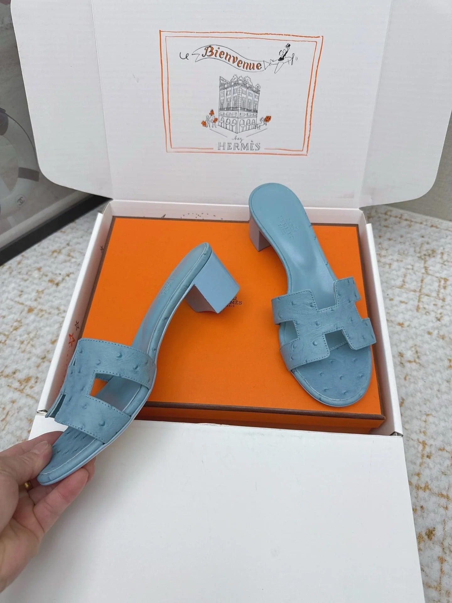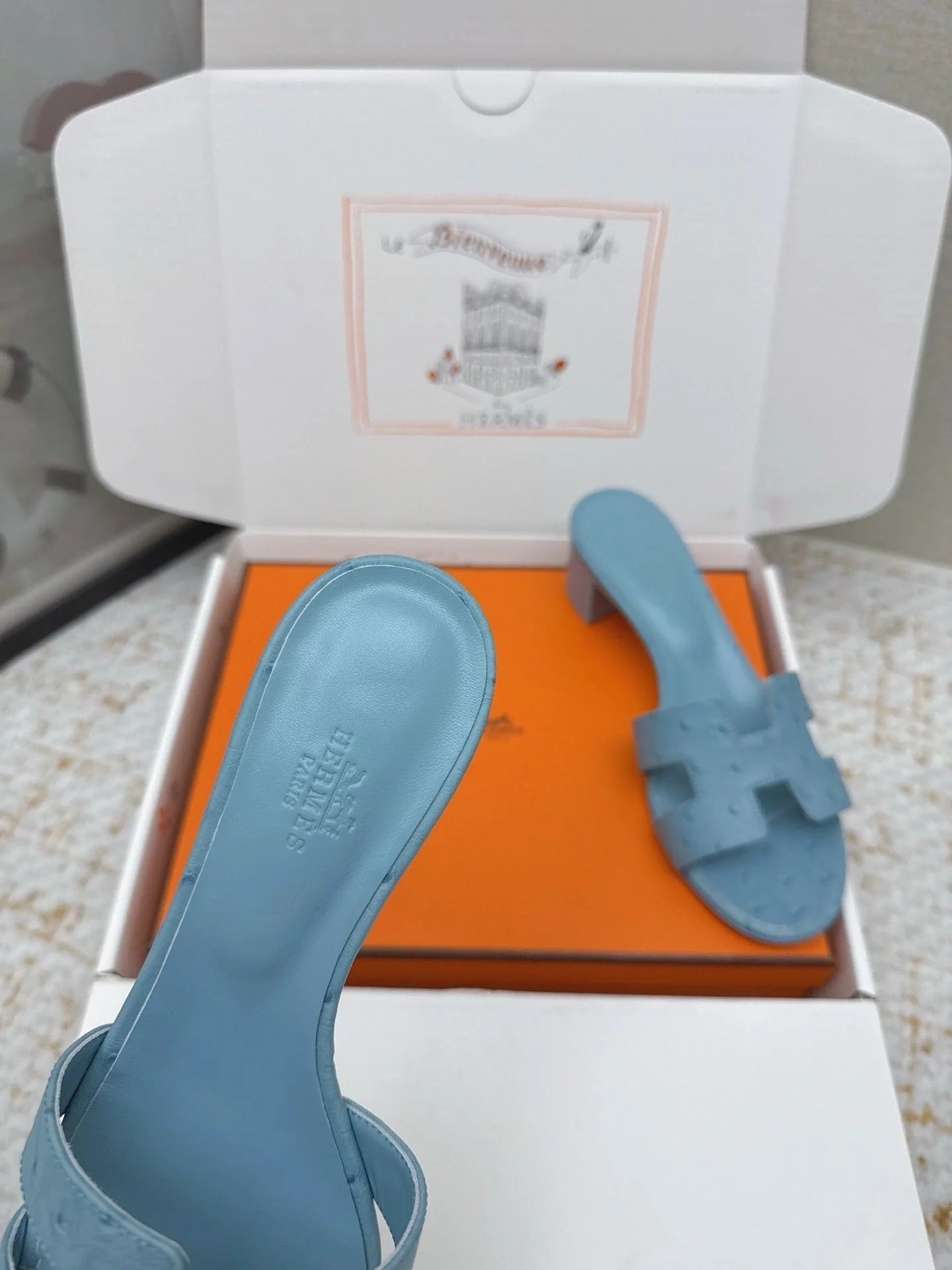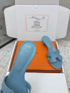 HM 26ss Oran Sandals 50 Dusty Blue Ostrich Leather 625132