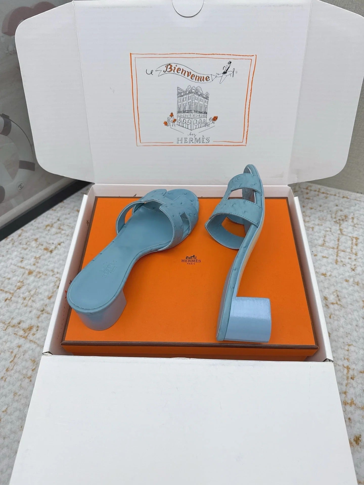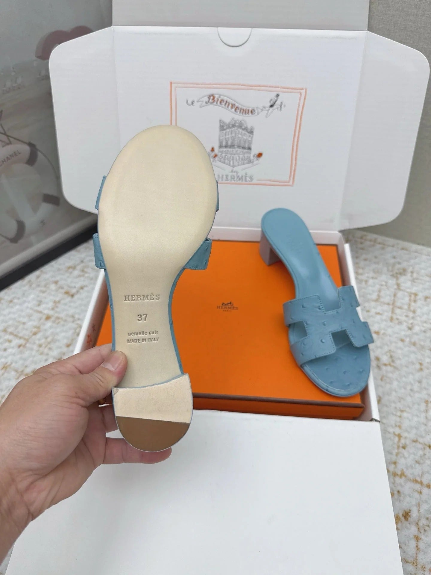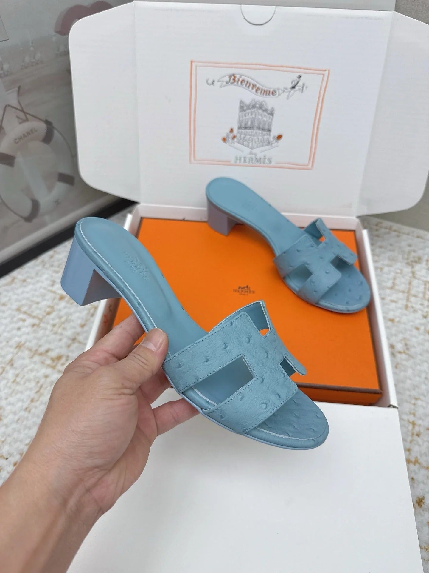 HM 26ss Oran Sandals 50 Dusty Blue Ostrich Leather 625132