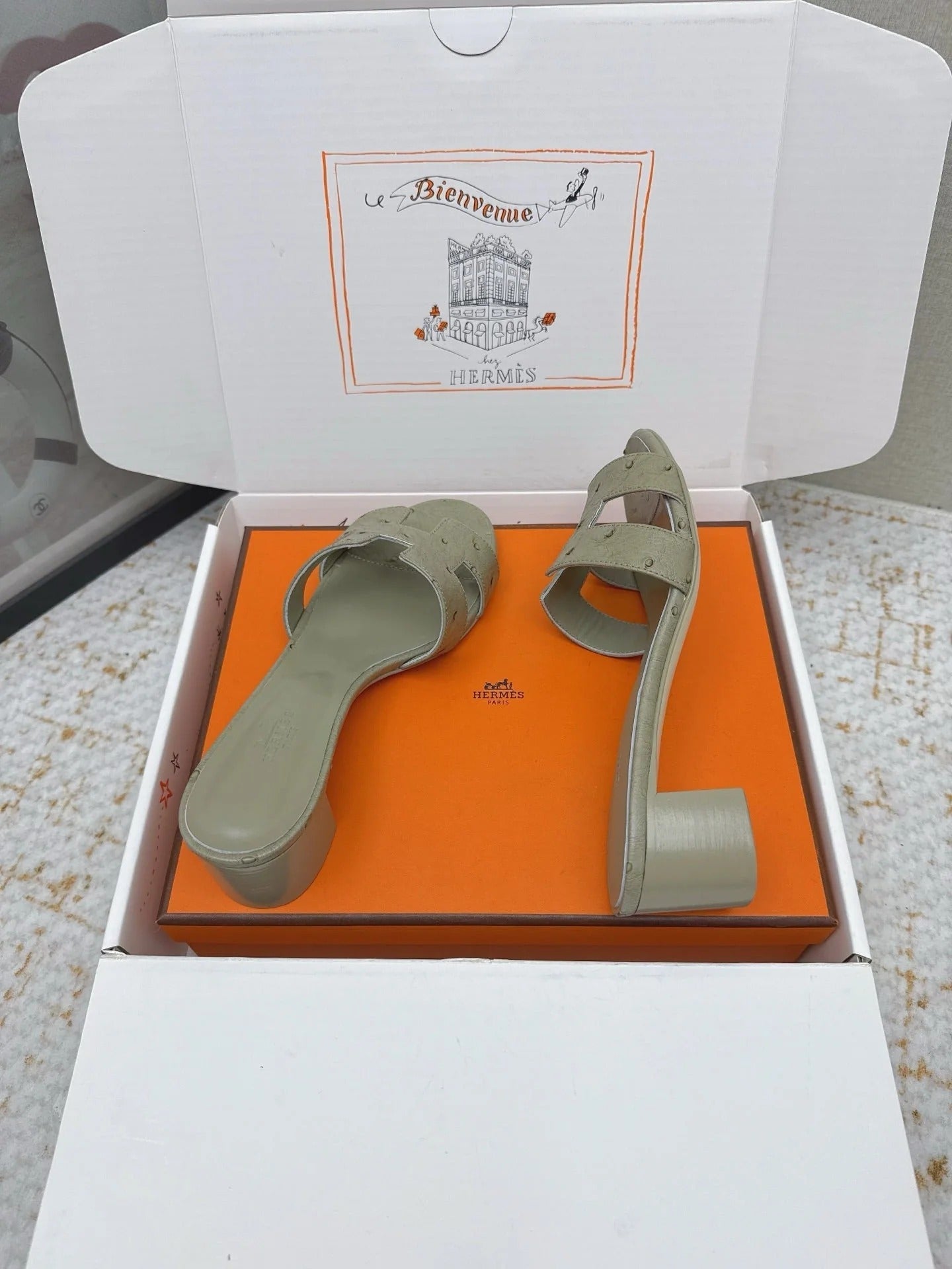 HM 26ss Oran Sandals 50 Sage Green Ostrich Leather 625126