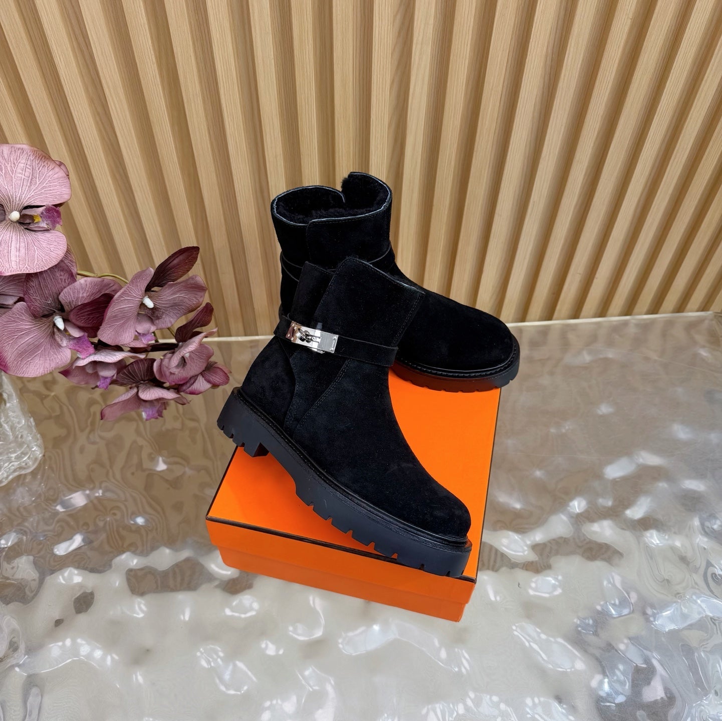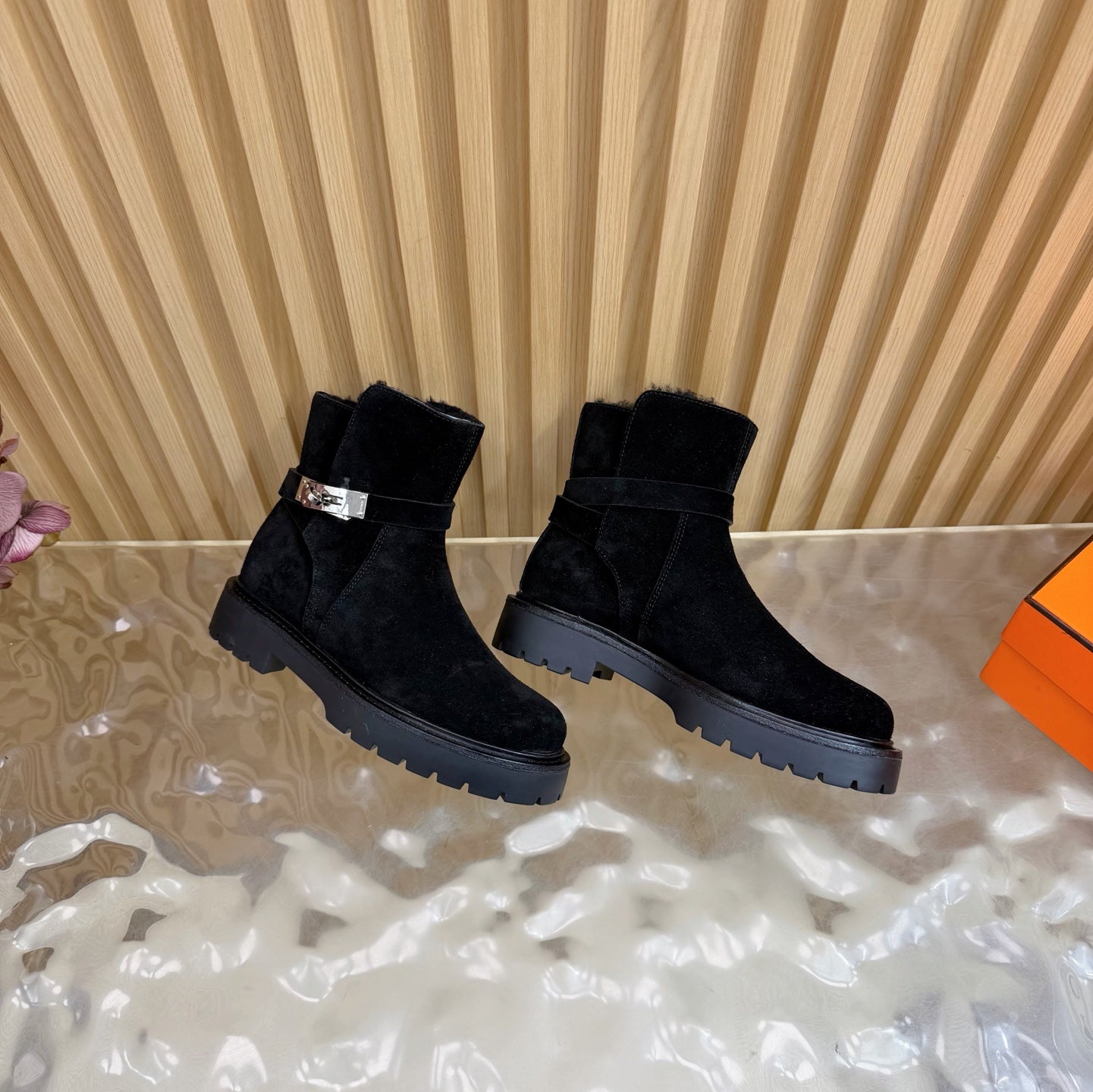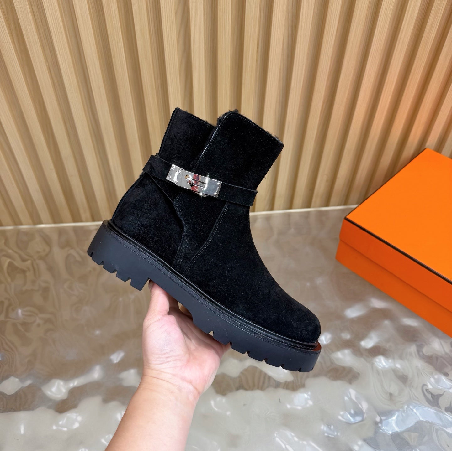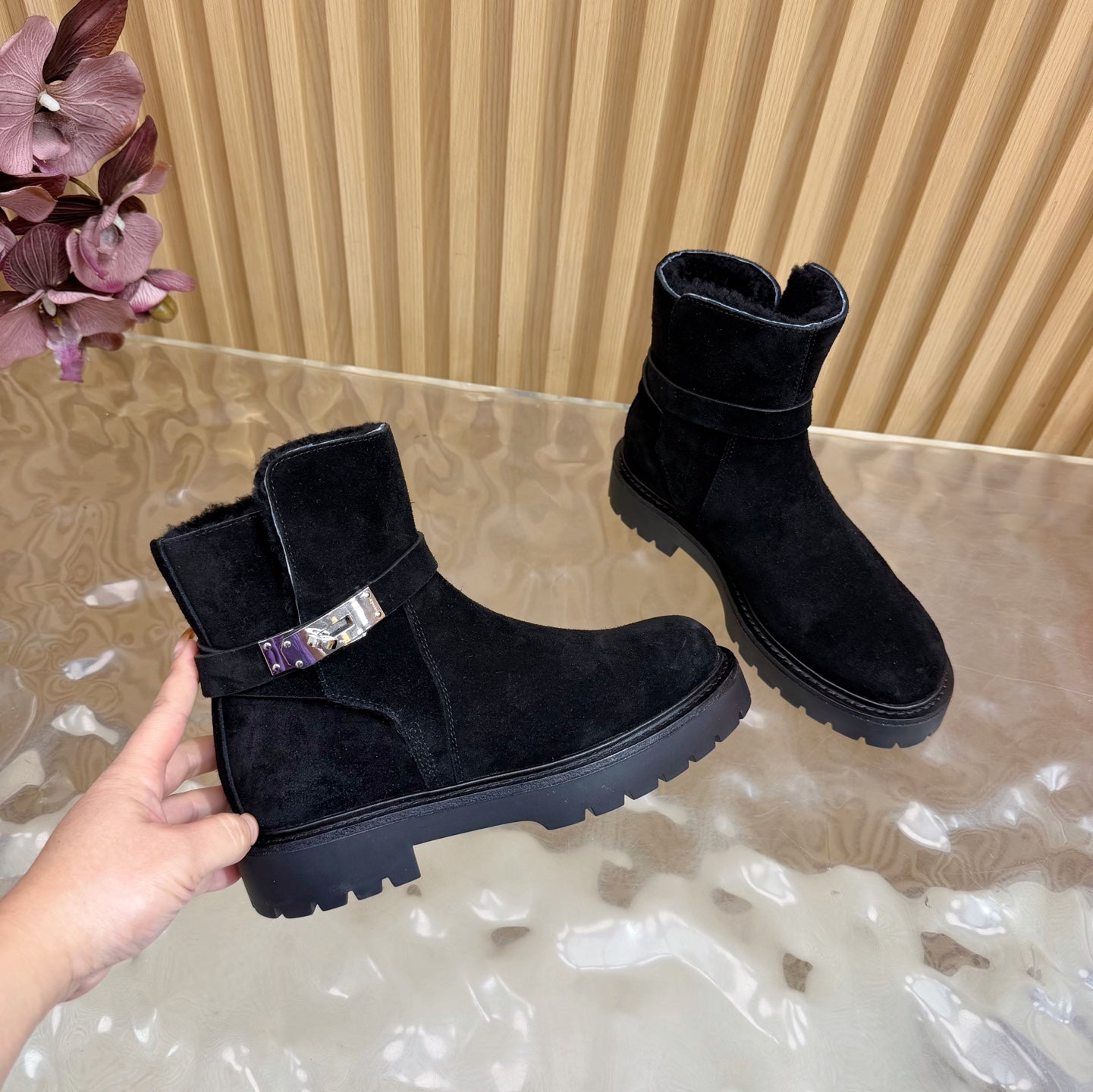 - Material: Shearling, Suede