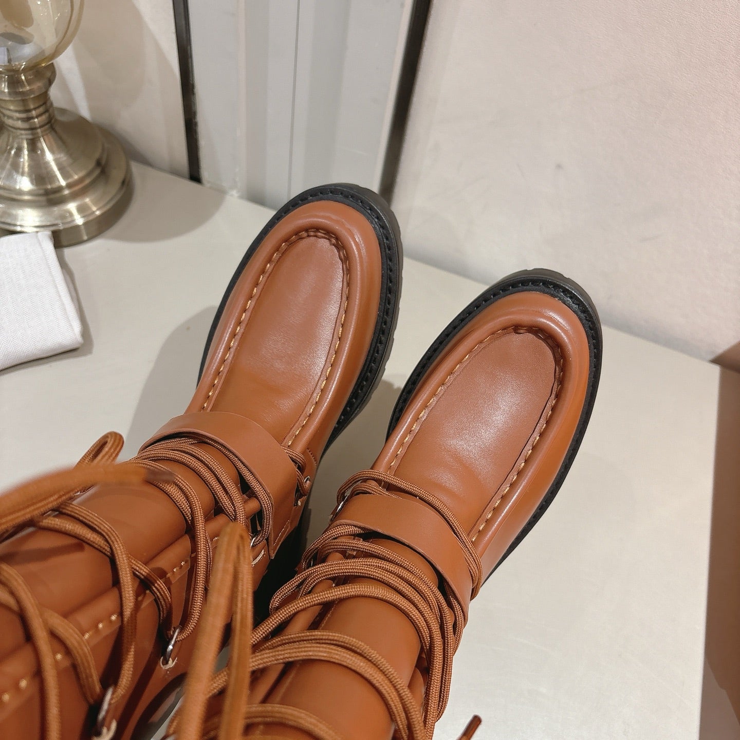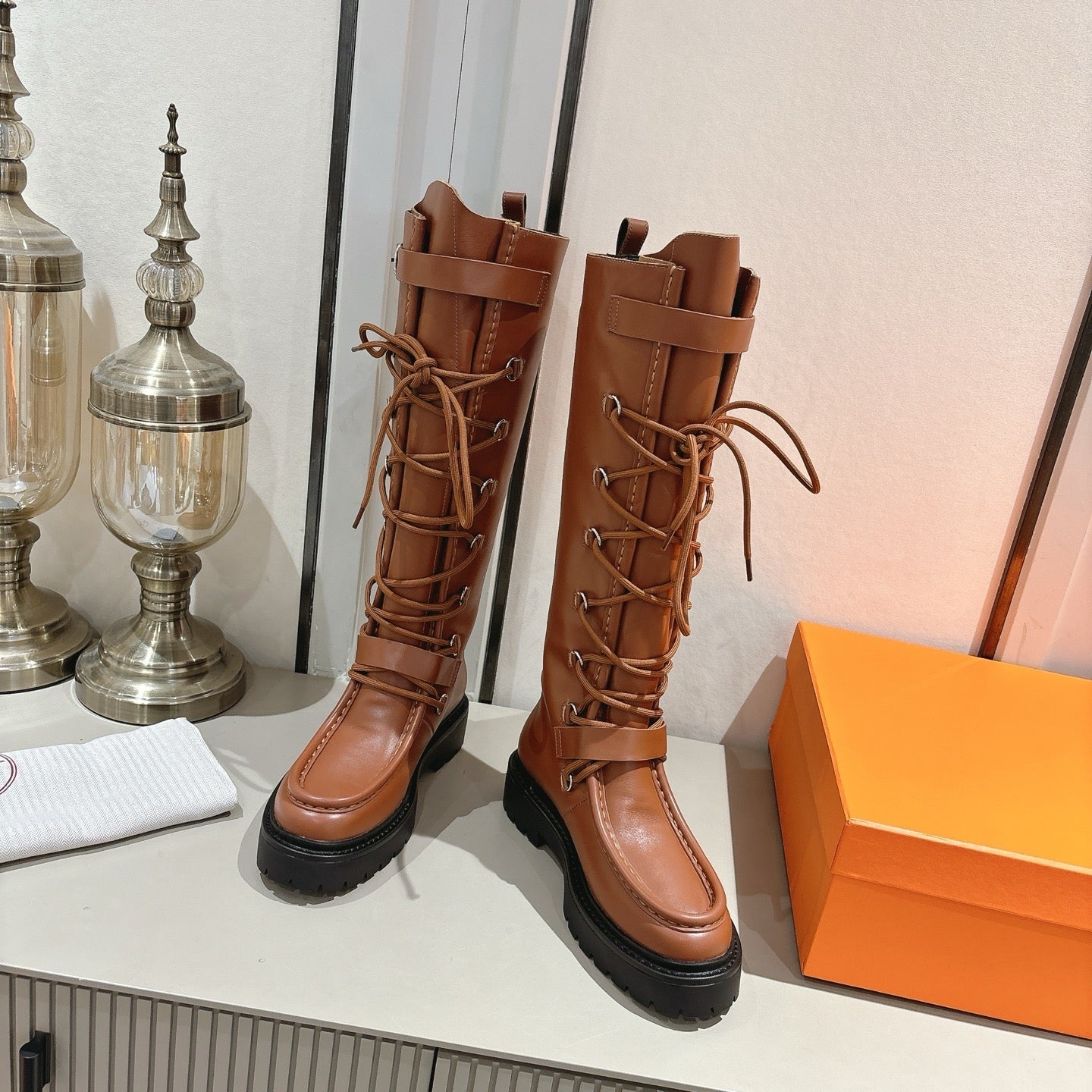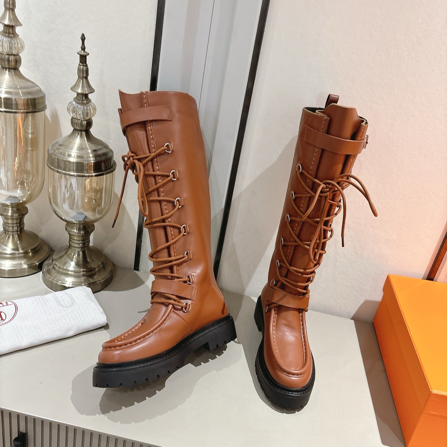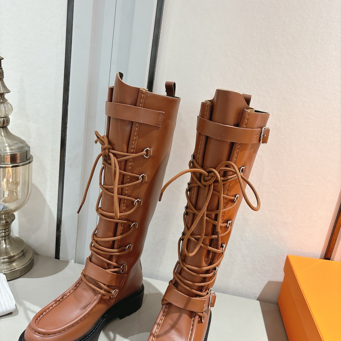 HM Lace Up Boots 25mm Belt Buckle Caramel Leather 466586