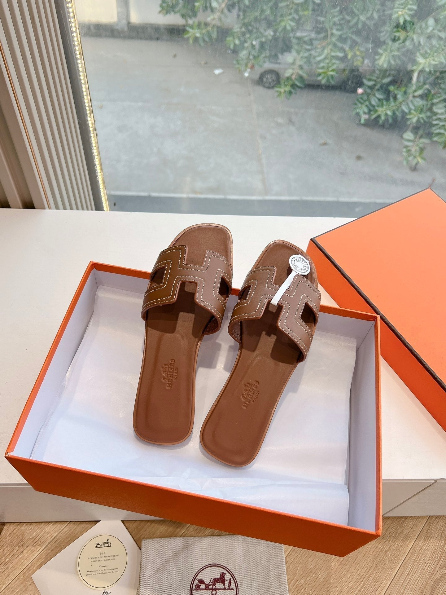 HM 25 Oran Sandal Brown Calfskin White Thread Embroidery