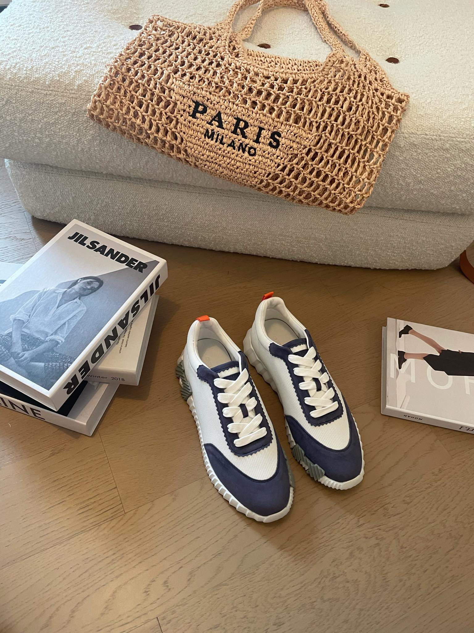 HM Bouncing 35 Sneakers White Canvas Blue Suede Goatskin Orange H Seafoam