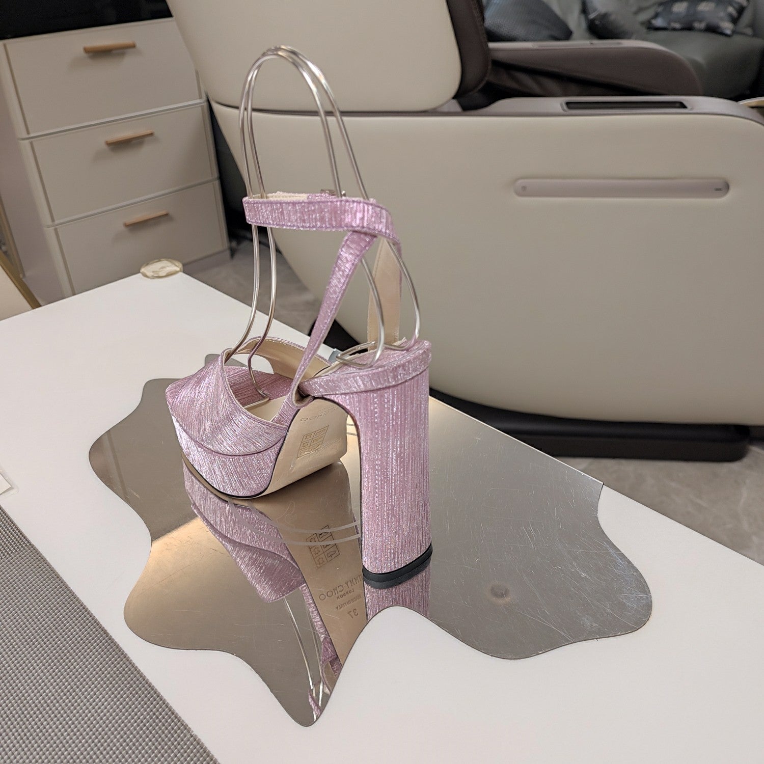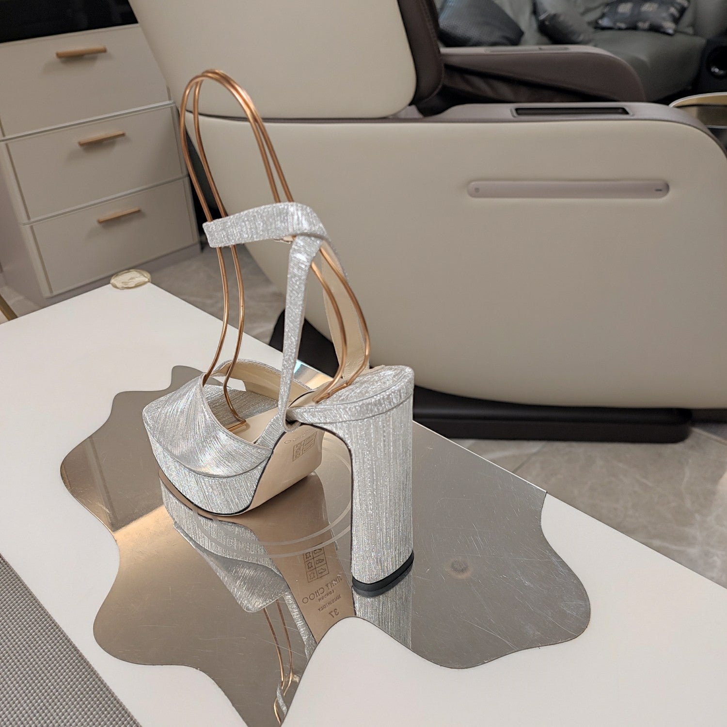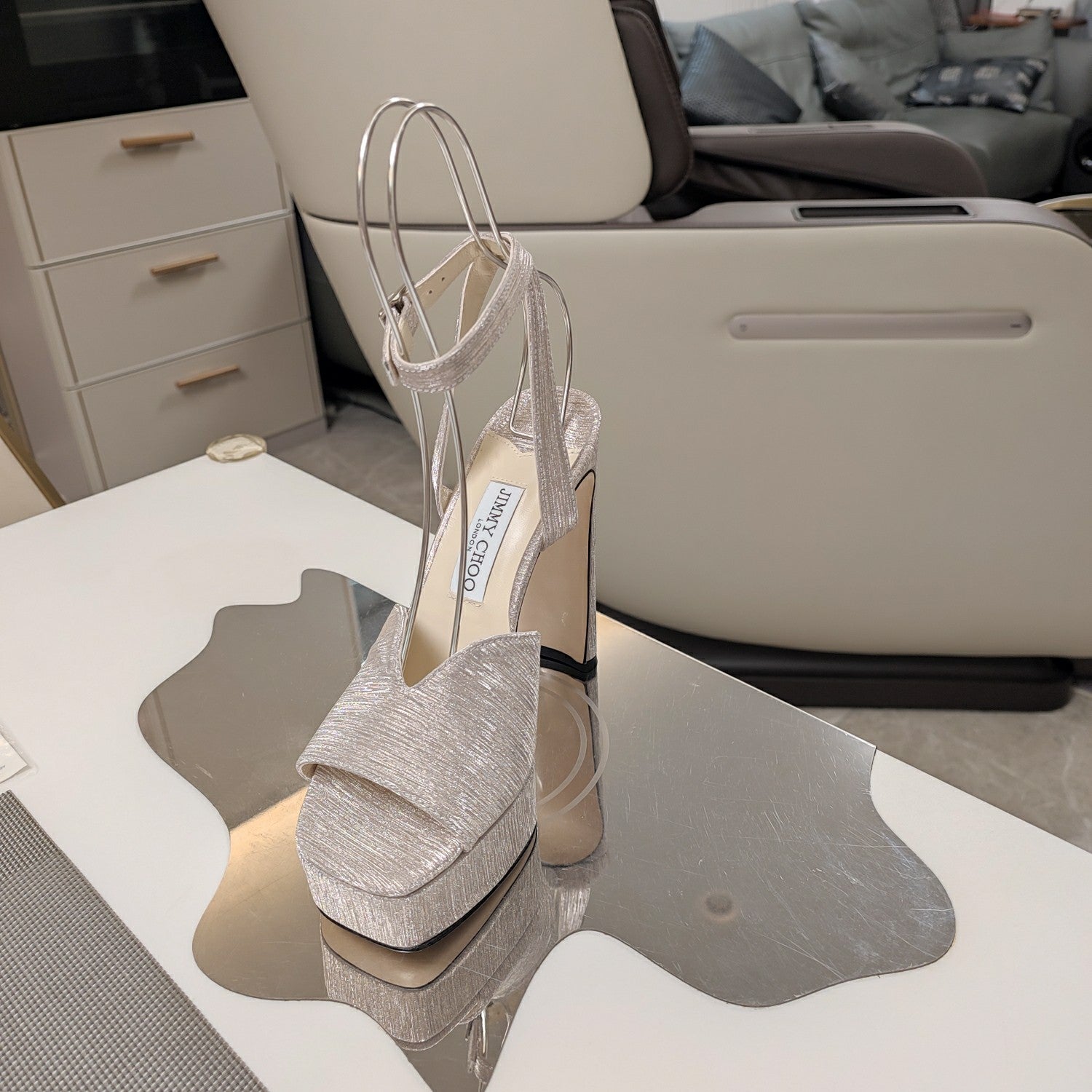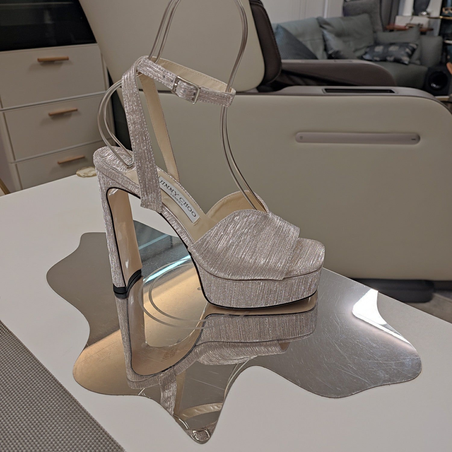 Jimmy 25 Platform Sandal Heels Silver Mirror TPU Material 240008