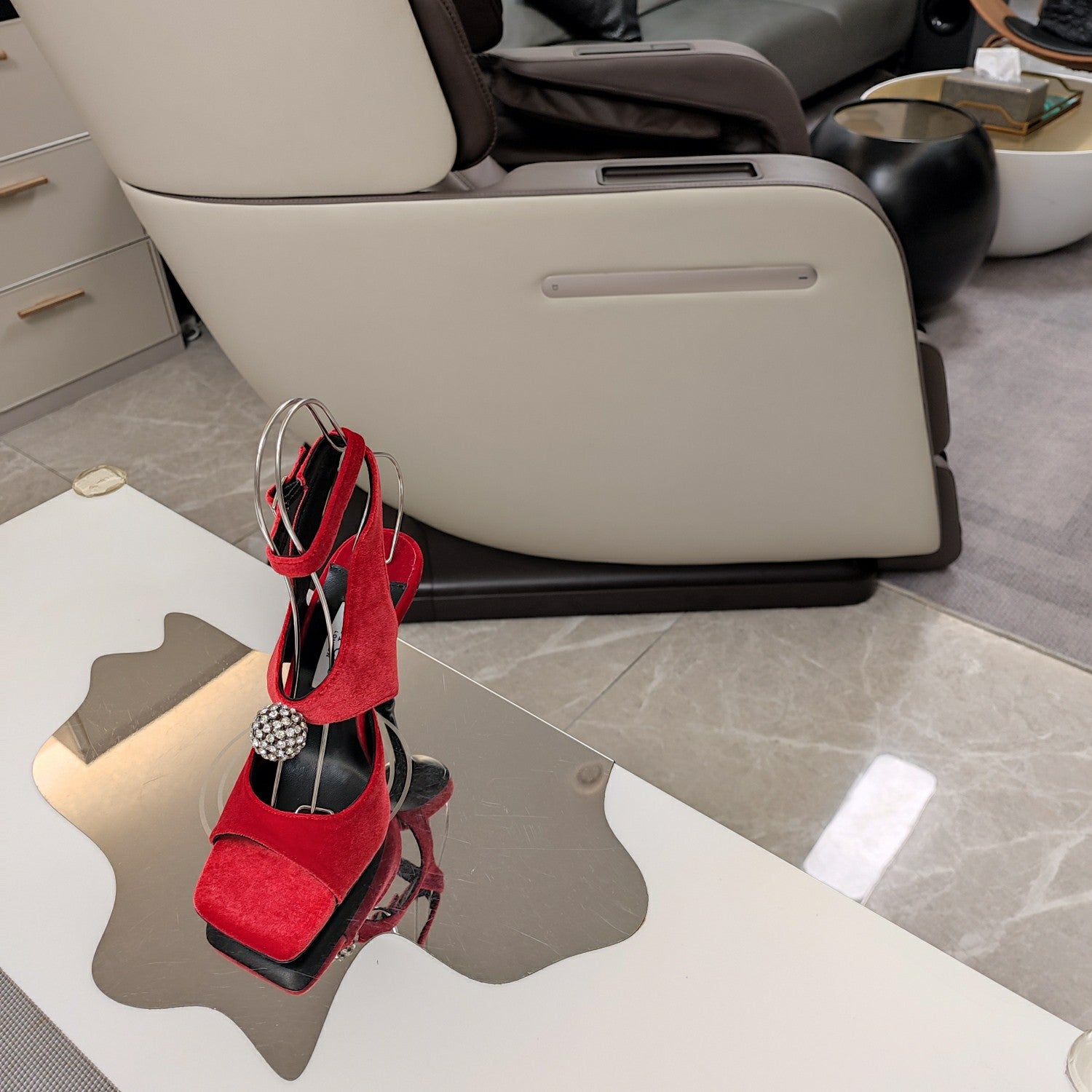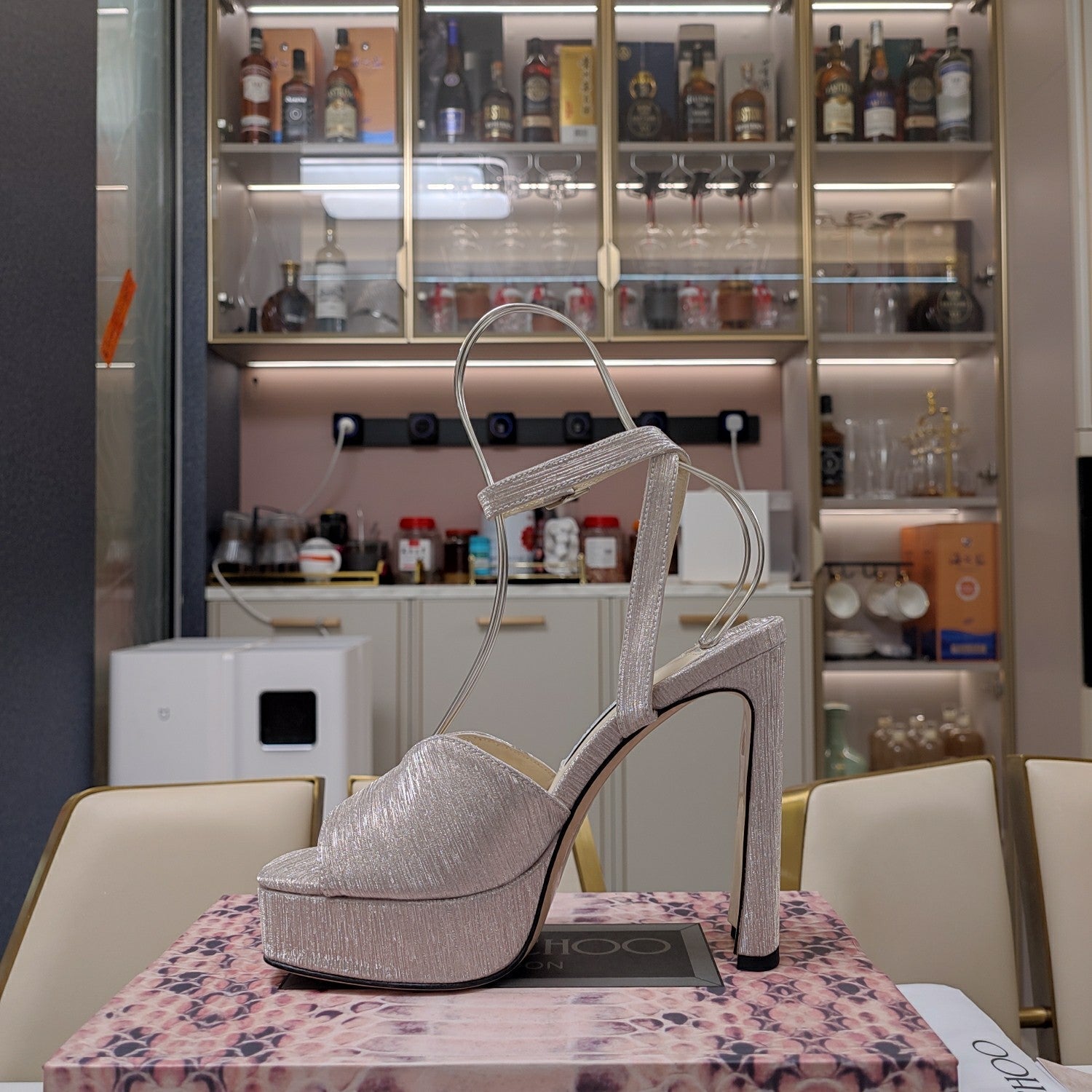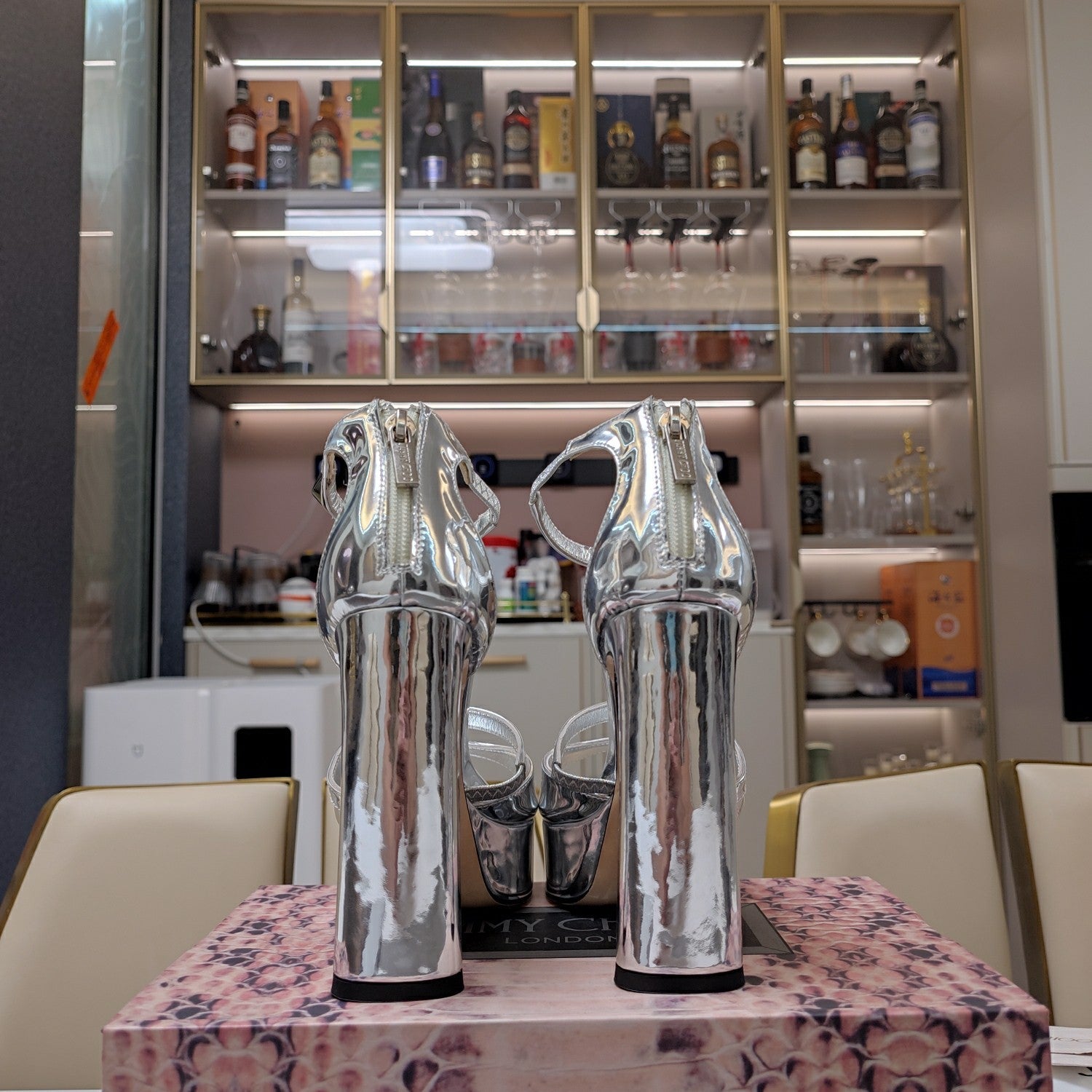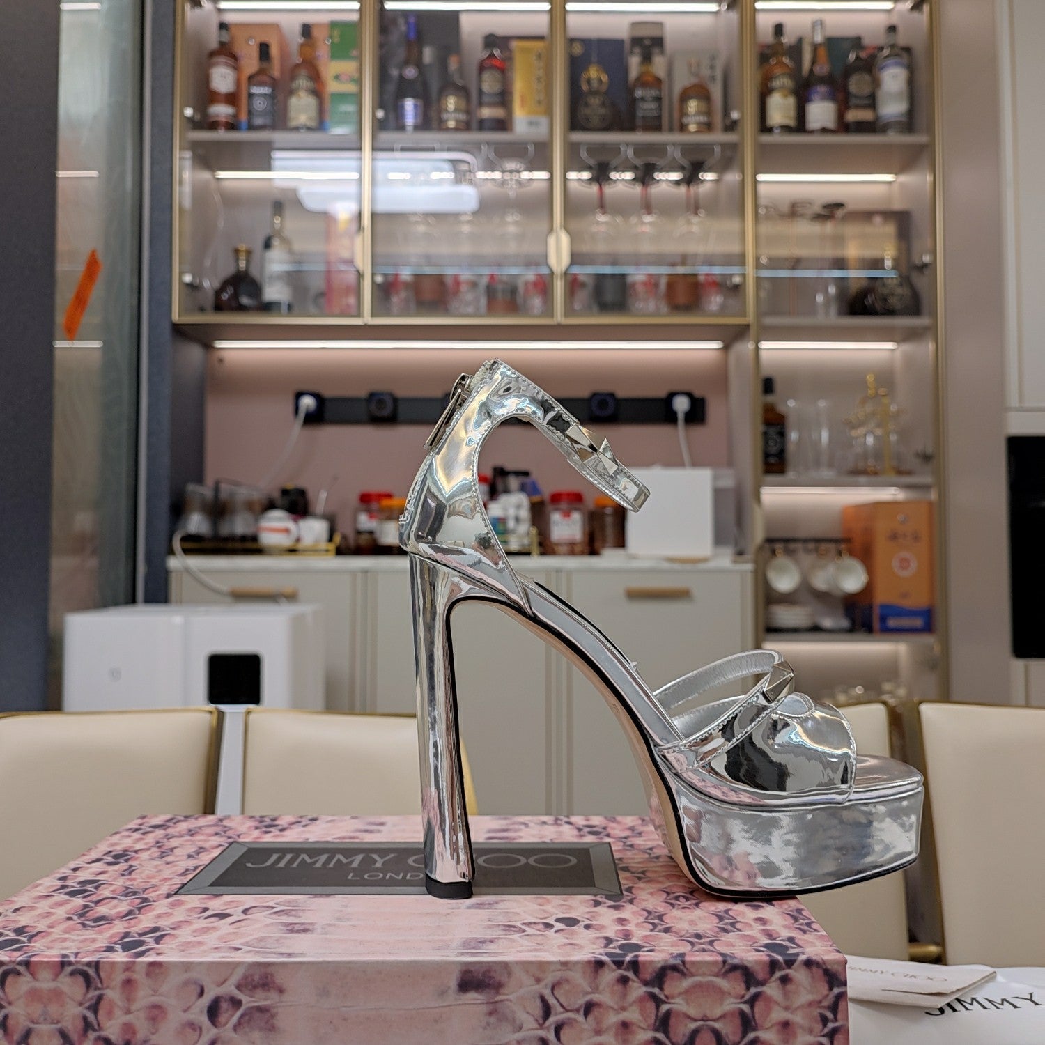 Jimmy 25 Platform Sandal Heels Silver Mirror TPU Material 240008