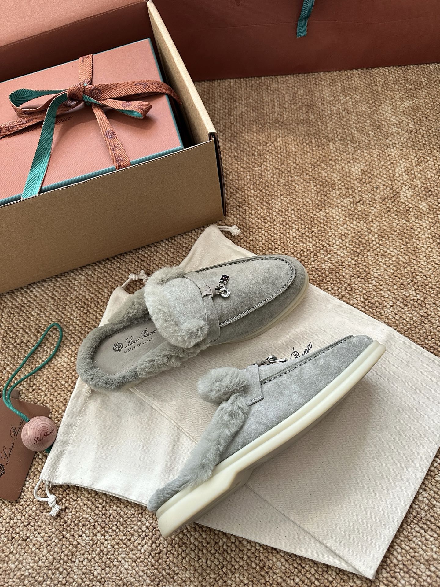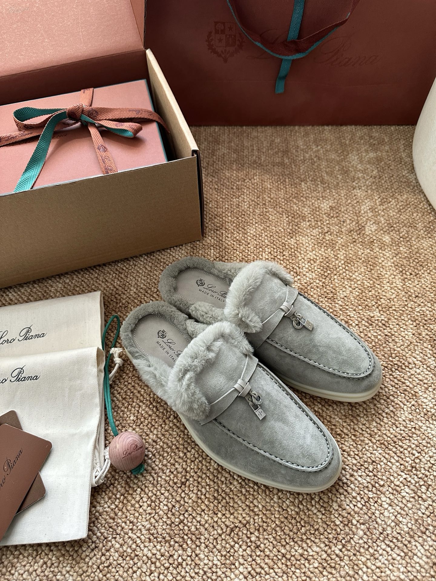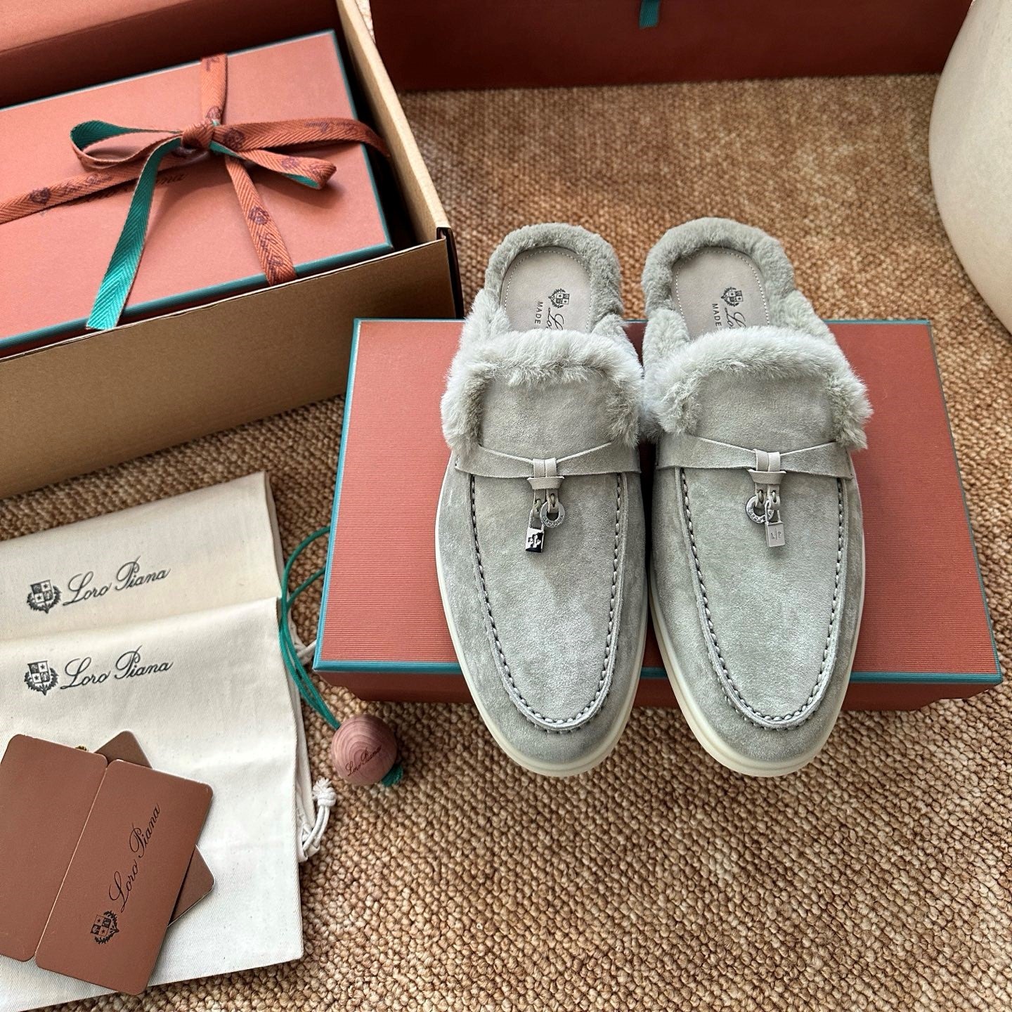 Loro Piana Charms Walk Flat Mules Gray-Green Suede Fur 623534