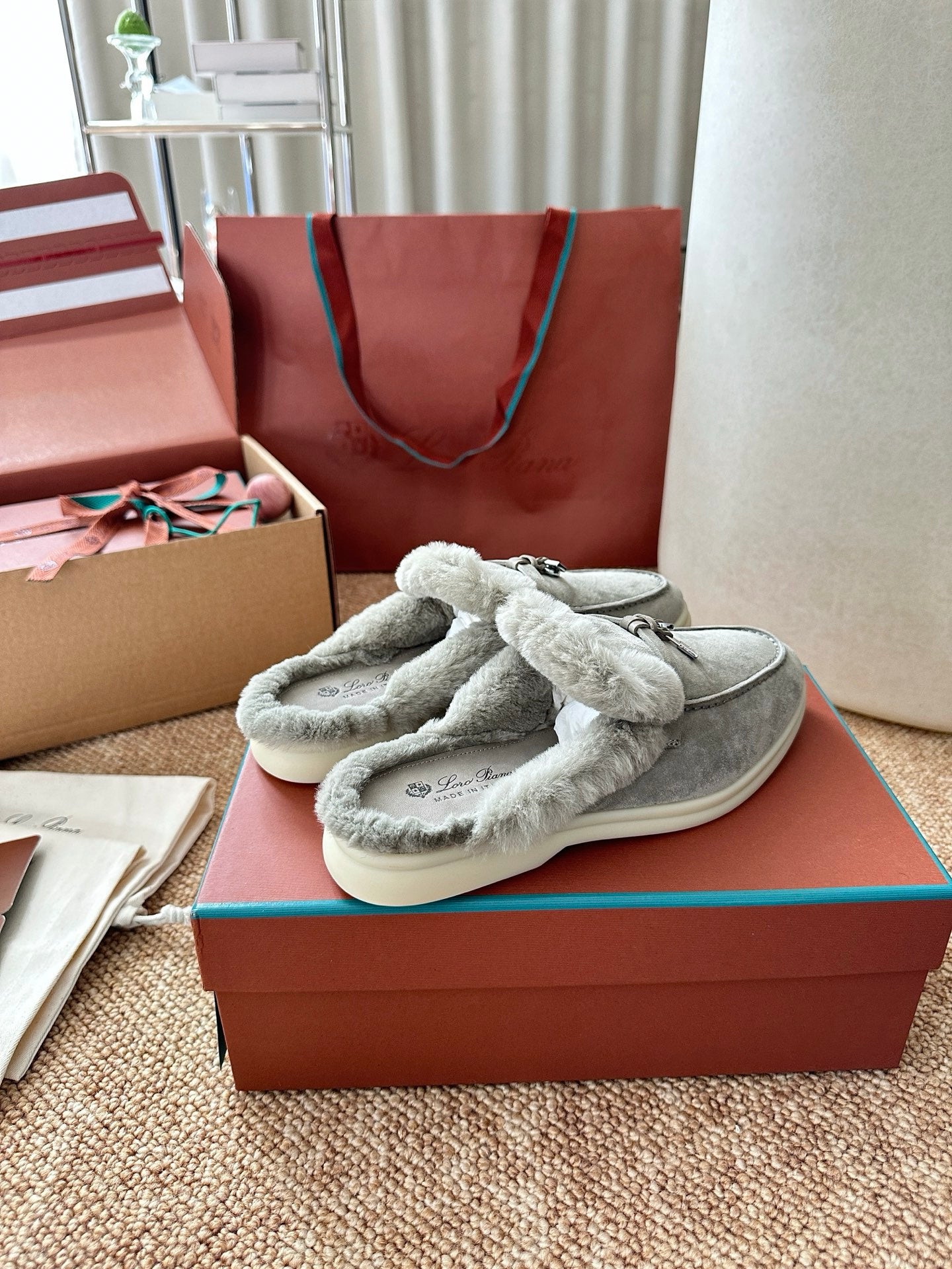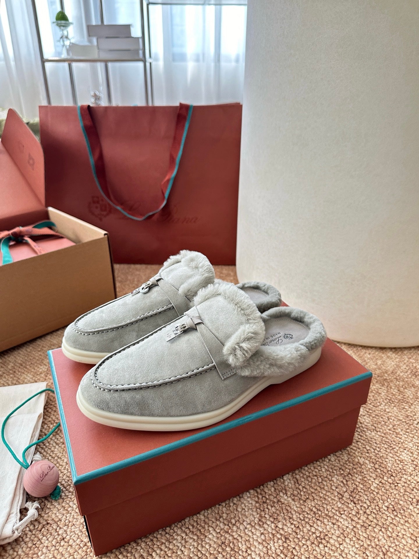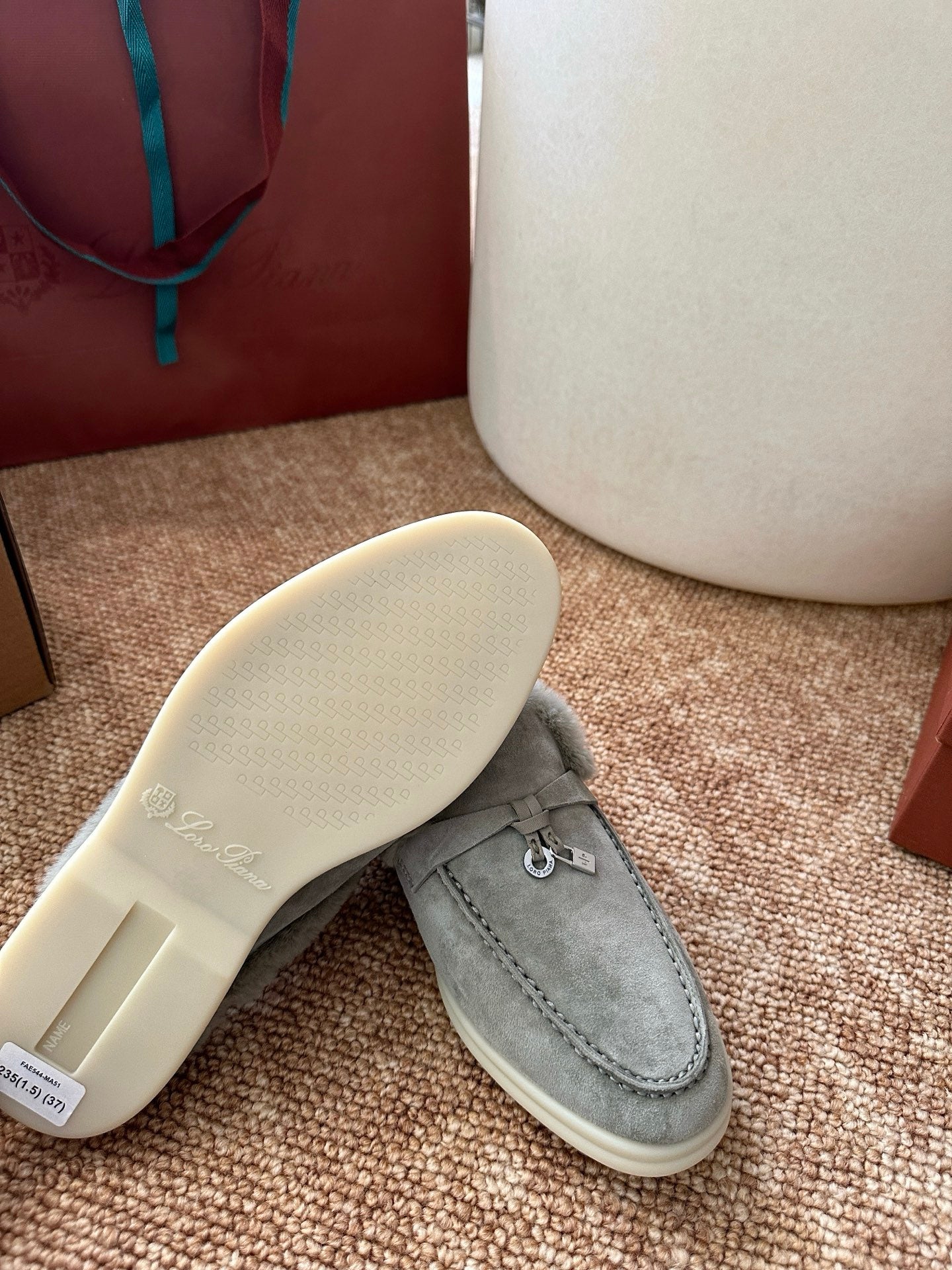 Loro Piana Charms Walk Flat Mules Gray-Green Suede Fur 623534