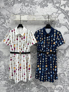 LV 25 Printed Round Neck Lining Pleated Dress White BLue Poliester