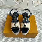 LV Beige·Raffia Straw Wedge Sandals 7.5cm Black Lining Leather 291585