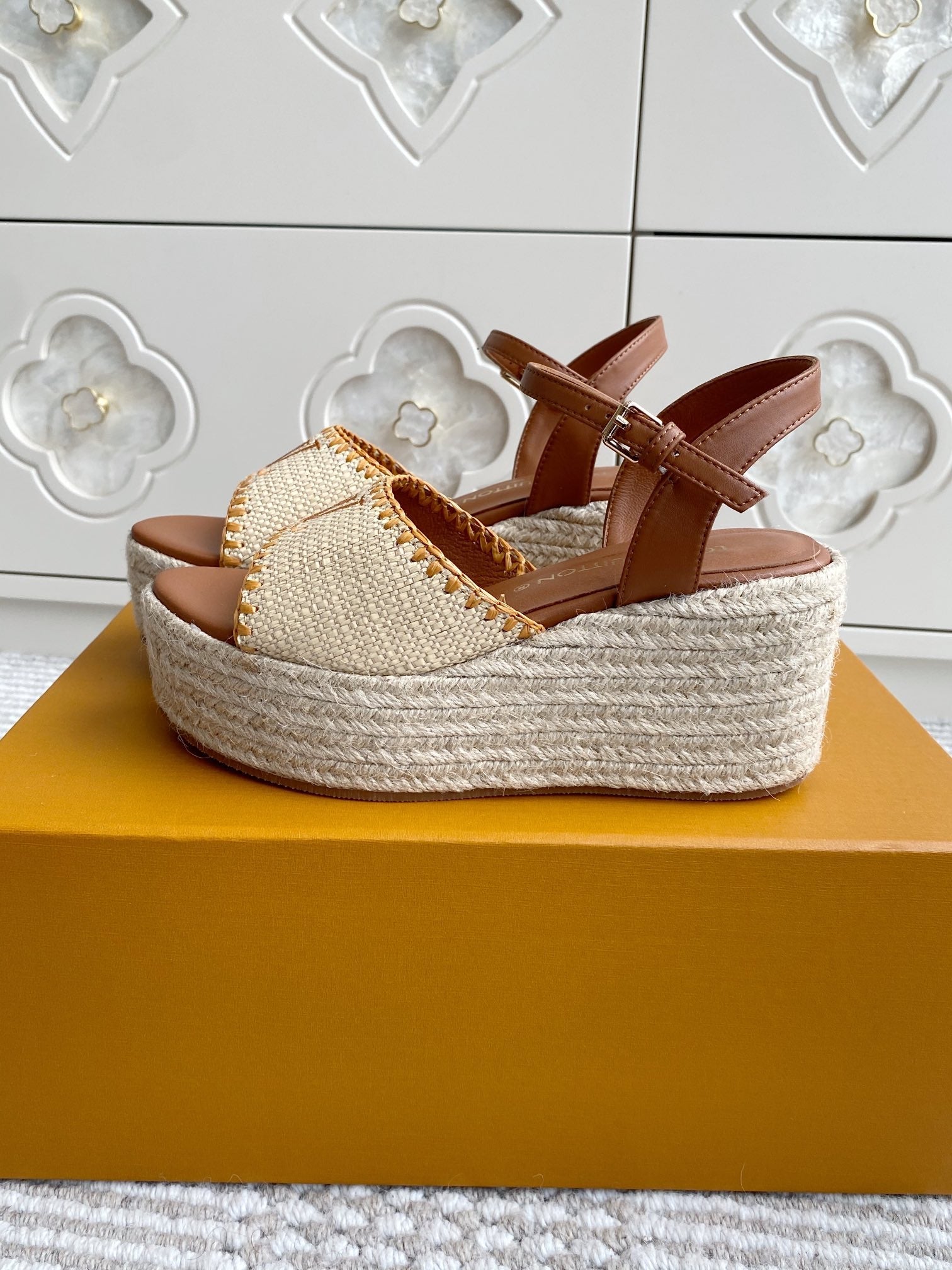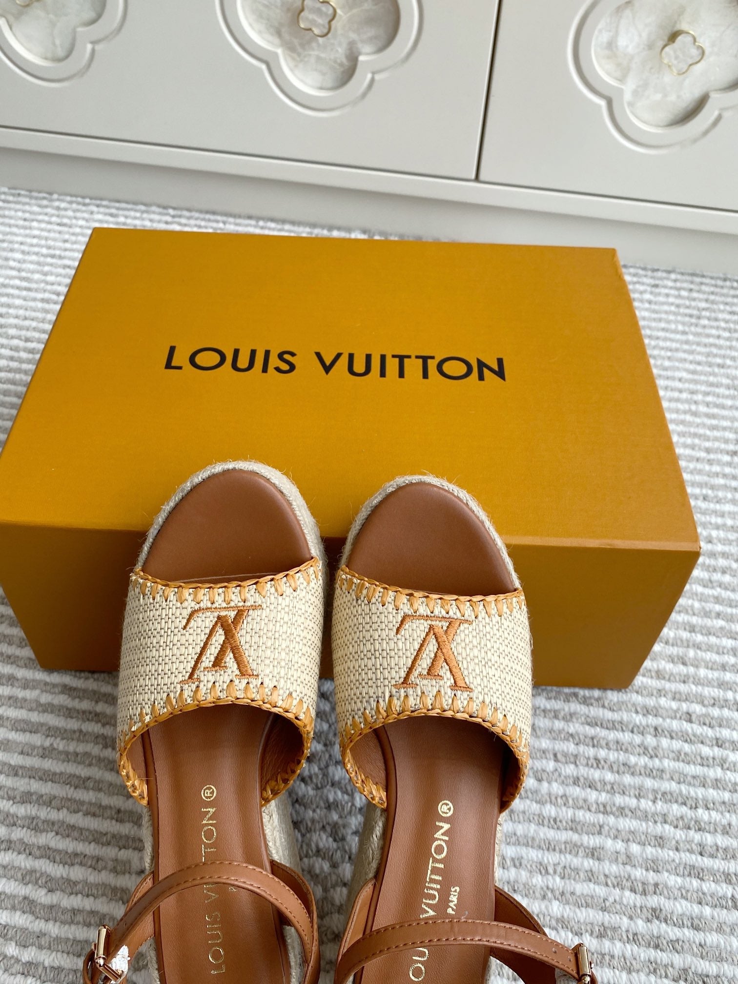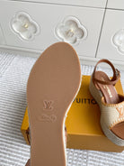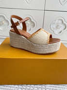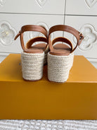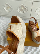 LV Beige·Raffia Straw Wedge Sandals 7.5cm Gold Lining Leather 291587