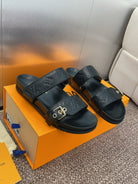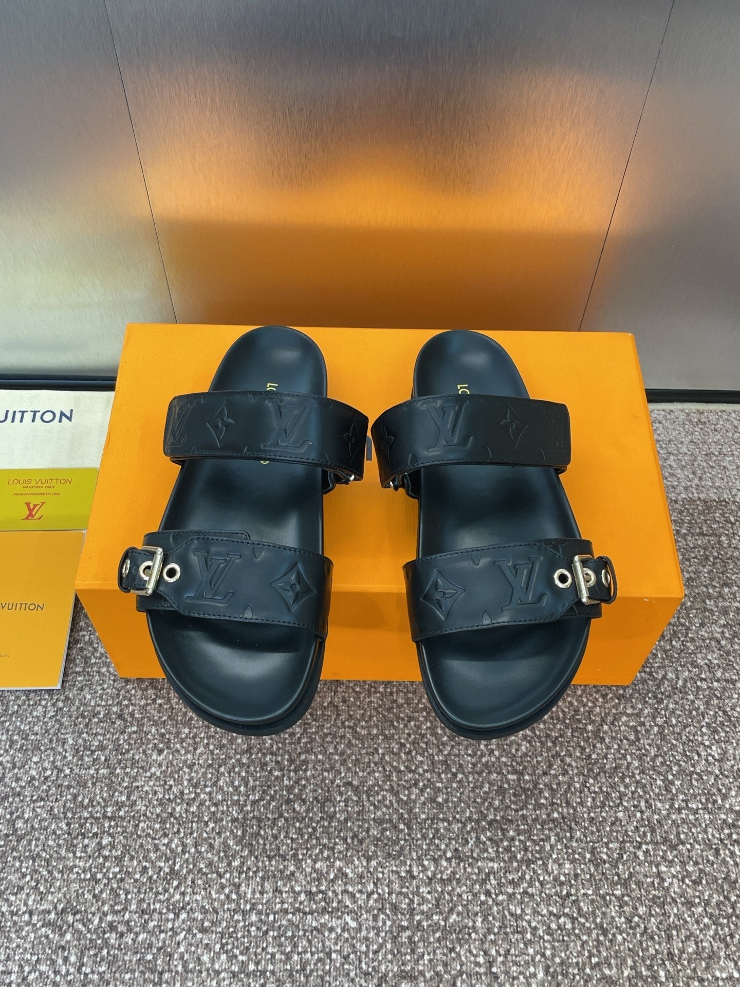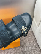 LV 2025 Hardware Buckle Open-toe Sandal Black Gold Cowhide 330223