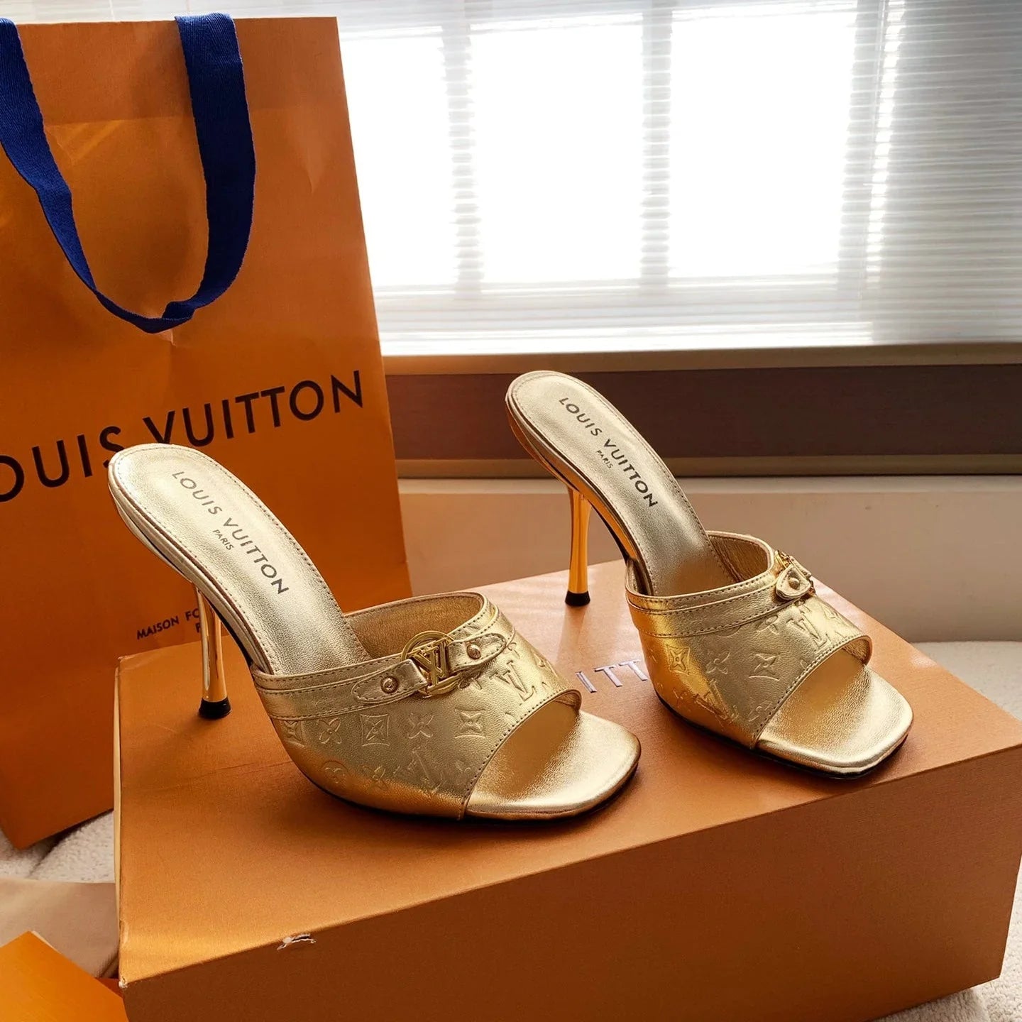 LV 26s High Heels 95 Slippers Gold Metallic Sheepskin 614989