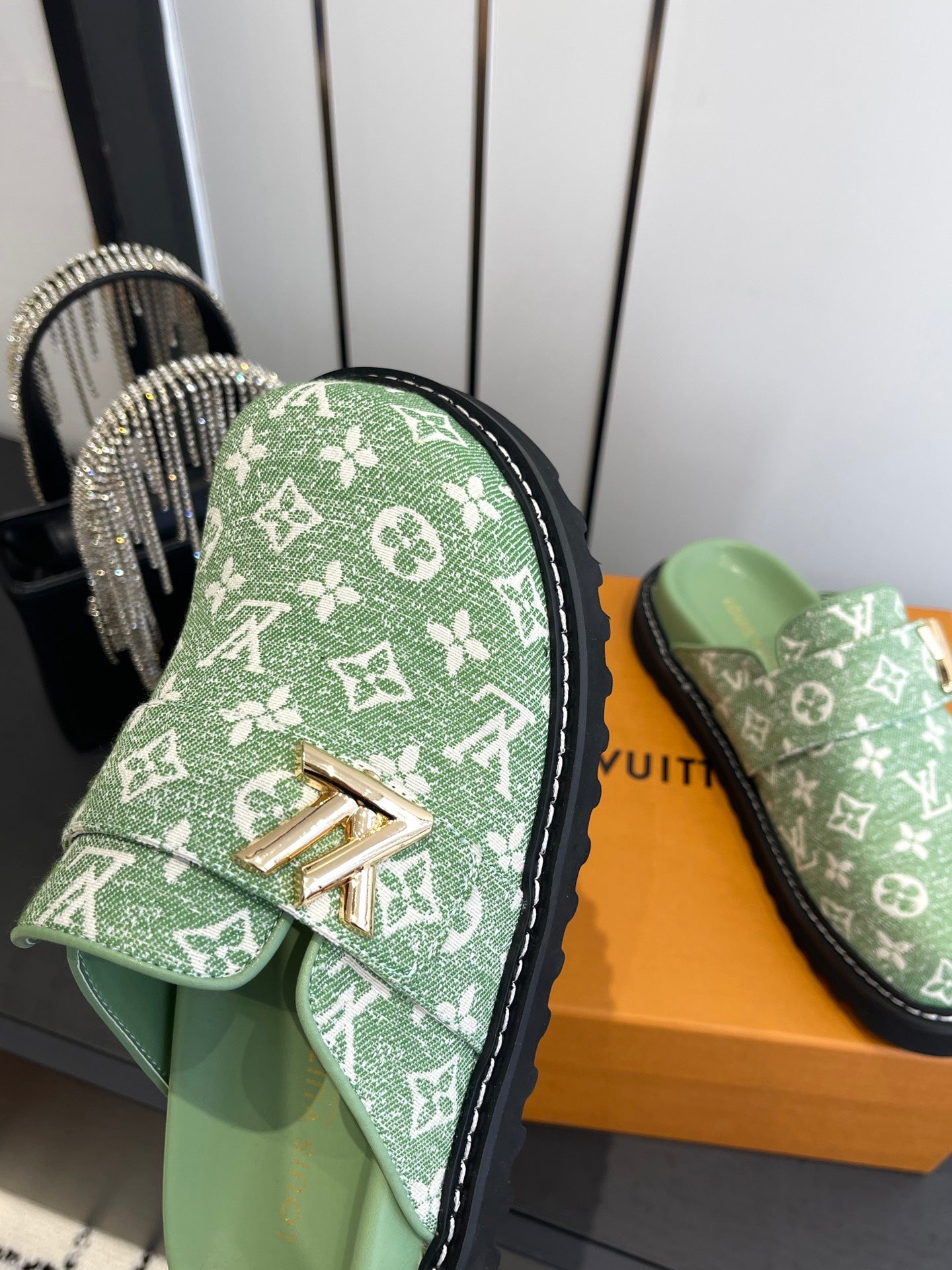 LV Cosy Comfort Mule Sandals Green Gold Denim Monogrammed 533458